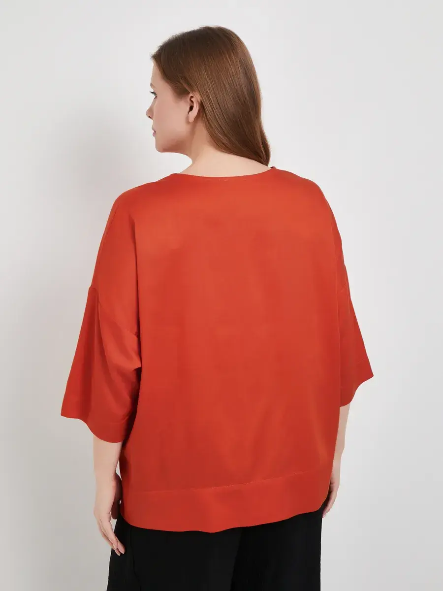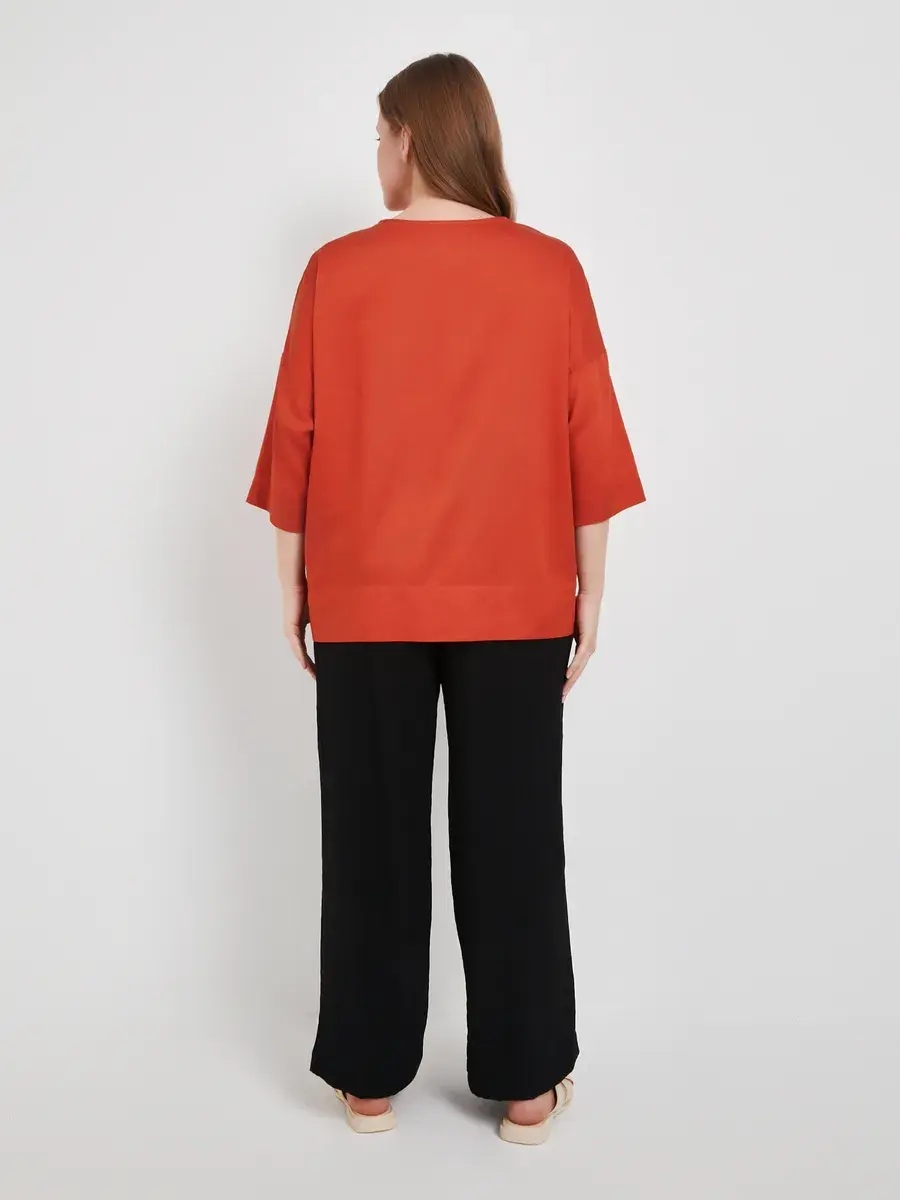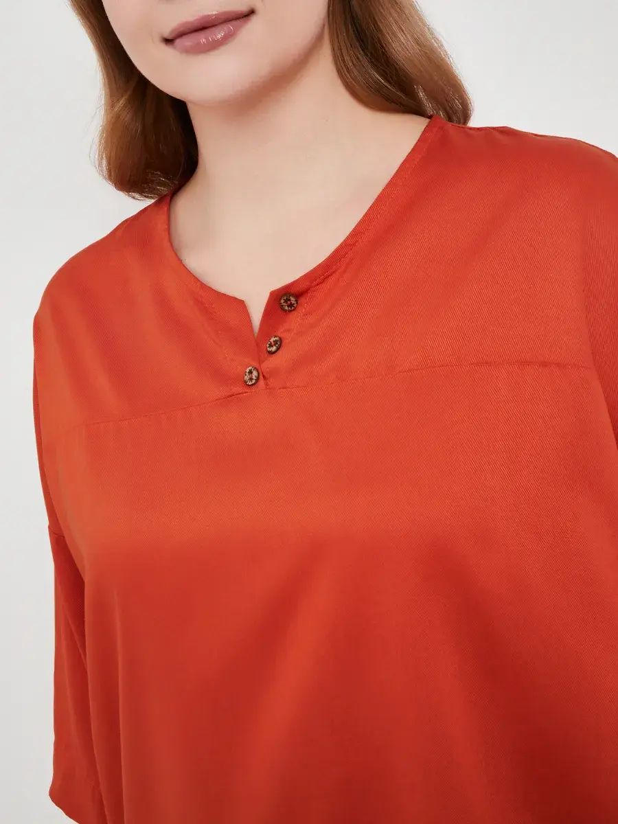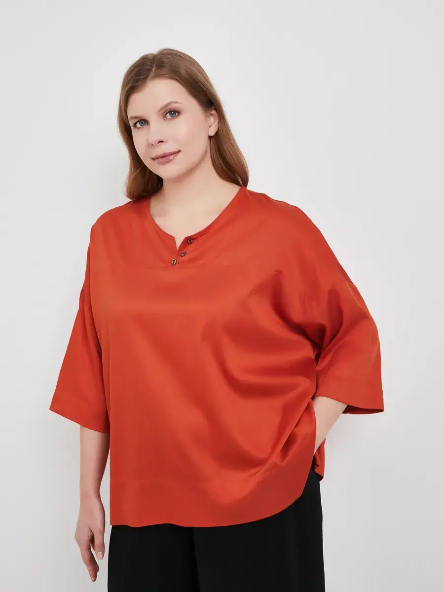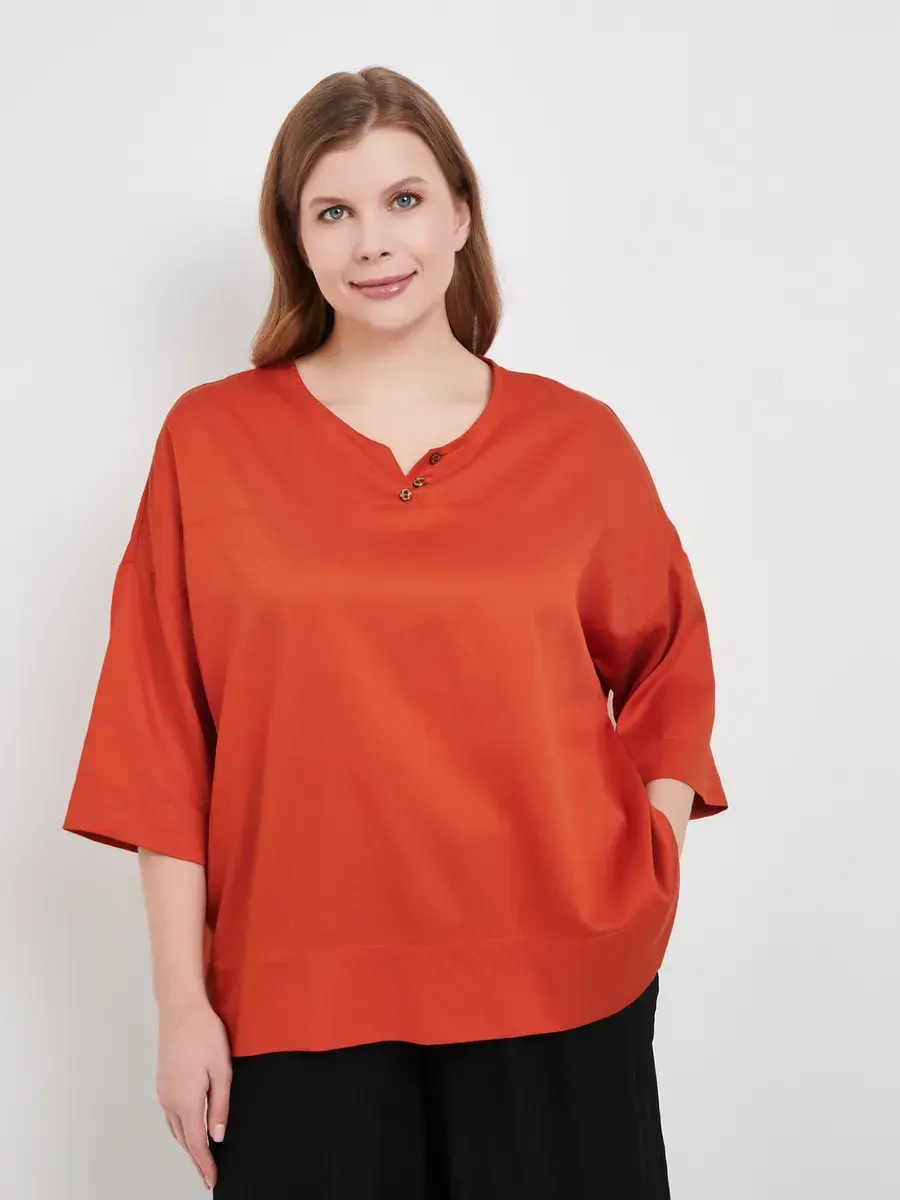 Женская блузка больших размеров распашного кроя с рукавом 3/4, круглый вырез. Выполнена из мягкого и приятного на ощупь текстильного полотна хлопок с вискозой. Модель расслабленного фасона в этно-стиле. На фигуре сидит свободно, рубашка оверсайз на весну и лето женщинам, чтобы в жаркую погоду тело дышало. Рукав со спущенной проймой. Благодаря своему свободному крою и объемным рукавам, она создает эффектный и модный образ. Наша блузка идеально подойдет женщинам для праздничных мероприятий и особых случаев. Вы сможете выглядеть ярко и элегантно на новогодней вечеринке, дне рождения, юбилее или свадьбе. Она также подойдет для похода в кино, театр или ресторан. Блузка создаст неповторимый образ для работы и придаст уверенности. Наша блузка – это модная и стильная находка для любого времени года. Она легкая и удобная, подходит как для летнего сезона, так и для зимы. Вы сможете носить ее в любое время года, создавая неповторимые и стильные образы. Из-за натурального состава ткани, туника мнется как лен.