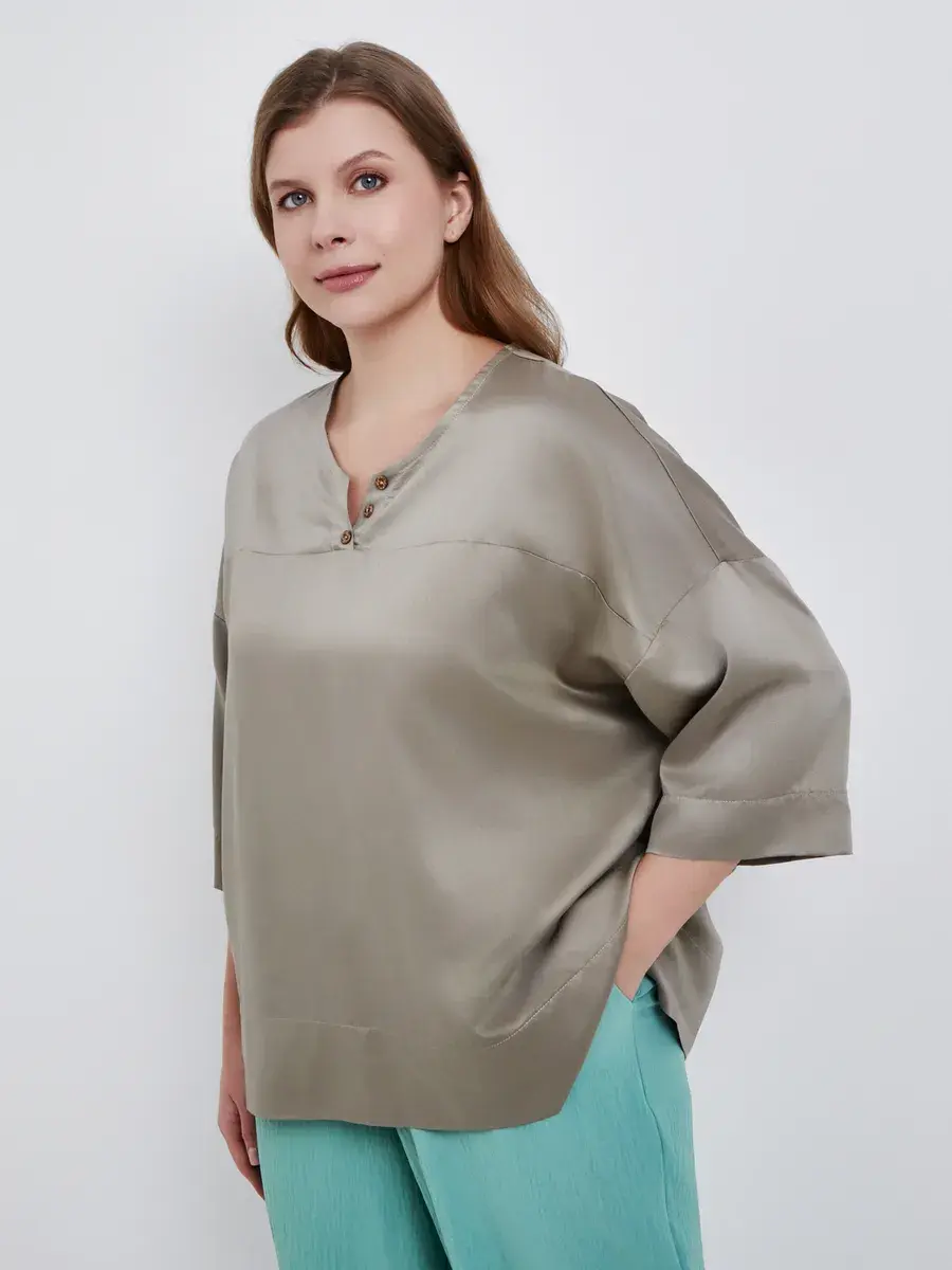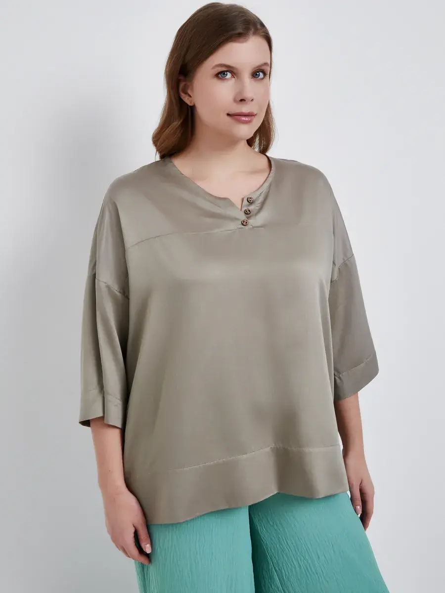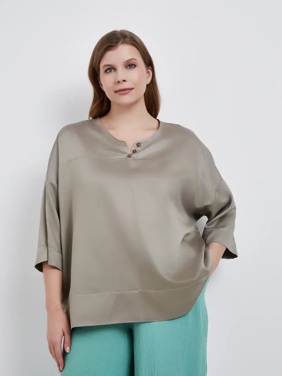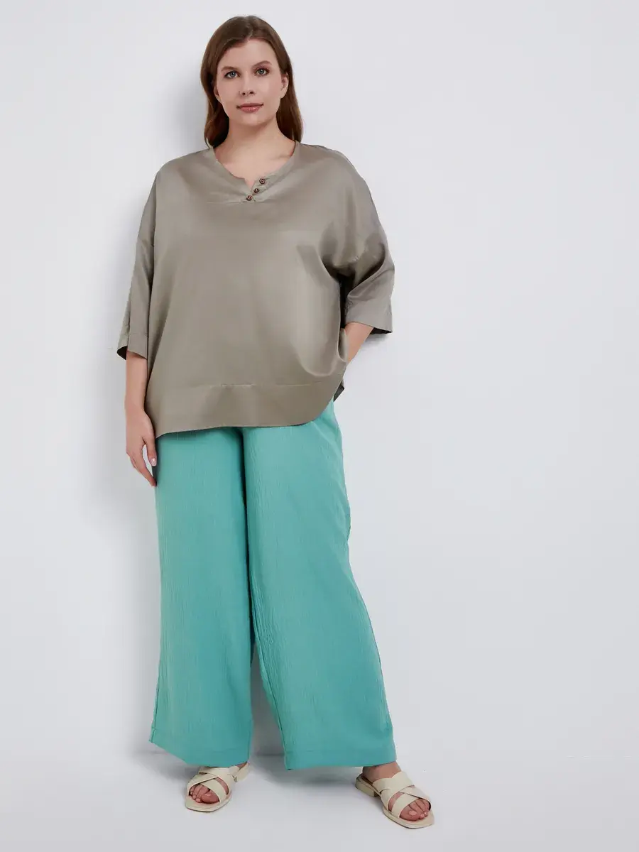 Женская блузка больших размеров распашного кроя с рукавом 3/4, круглый вырез. Выполнена из мягкого и приятного на ощупь текстильного полотна хлопок с вискозой. Модель расслабленного фасона в этно-стиле. На фигуре сидит свободно, рубашка оверсайз на весну и лето женщинам, чтобы в жаркую погоду тело дышало. Рукав со спущенной проймой. Благодаря своему свободному крою и объемным рукавам, она создает эффектный и модный образ. Наша блузка идеально подойдет женщинам для праздничных мероприятий и особых случаев. Вы сможете выглядеть ярко и элегантно на новогодней вечеринке, дне рождения, юбилее или свадьбе. Она также подойдет для похода в кино, театр или ресторан. Блузка создаст неповторимый образ для работы и придаст уверенности. Наша блузка – это модная и стильная находка для любого времени года. Она легкая и удобная, подходит как для летнего сезона, так и для зимы. Вы сможете носить ее в любое время года, создавая неповторимые и стильные образы. Из-за натурального состава ткани, туника мнется как лен.