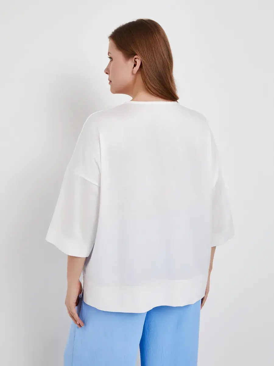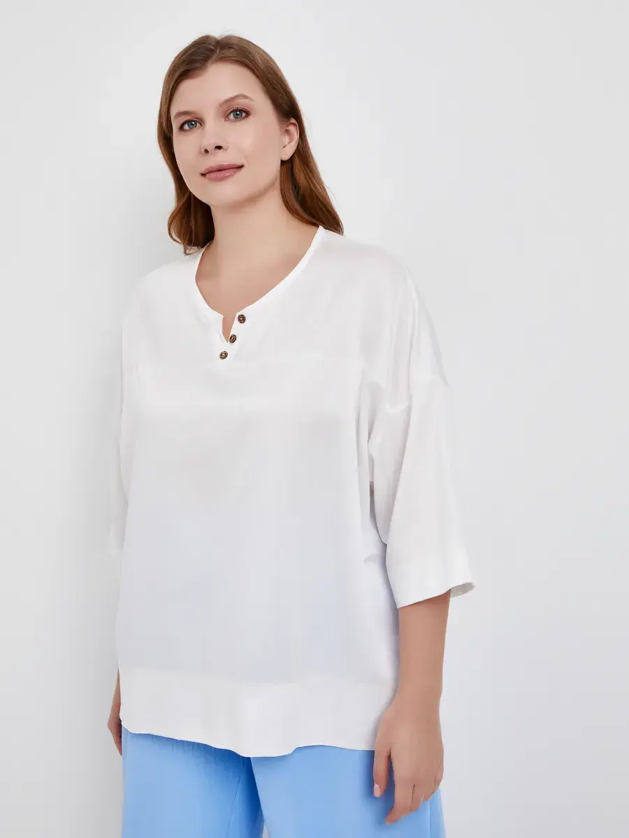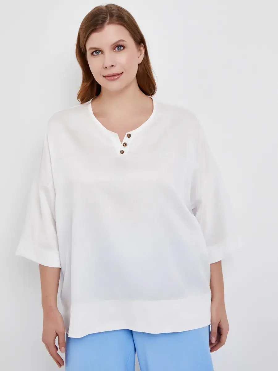 Женская блузка больших размеров распашного кроя с рукавом 3/4, круглый вырез. Выполнена из мягкого и приятного на ощупь текстильного полотна хлопок с вискозой. Модель расслабленного фасона в этно-стиле. На фигуре сидит свободно, рубашка оверсайз на весну и лето женщинам, чтобы в жаркую погоду тело дышало. Рукав со спущенной проймой. Благодаря своему свободному крою и объемным рукавам, она создает эффектный и модный образ. Наша блузка идеально подойдет женщинам для праздничных мероприятий и особых случаев. Вы сможете выглядеть ярко и элегантно на новогодней вечеринке, дне рождения, юбилее или свадьбе. Она также подойдет для похода в кино, театр или ресторан. Блузка создаст неповторимый образ для работы и придаст уверенности. Наша блузка – это модная и стильная находка для любого времени года. Она легкая и удобная, подходит как для летнего сезона, так и для зимы. Вы сможете носить ее в любое время года, создавая неповторимые и стильные образы. Из-за натурального состава ткани, туника мнется как лен.