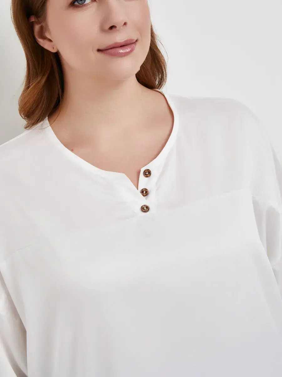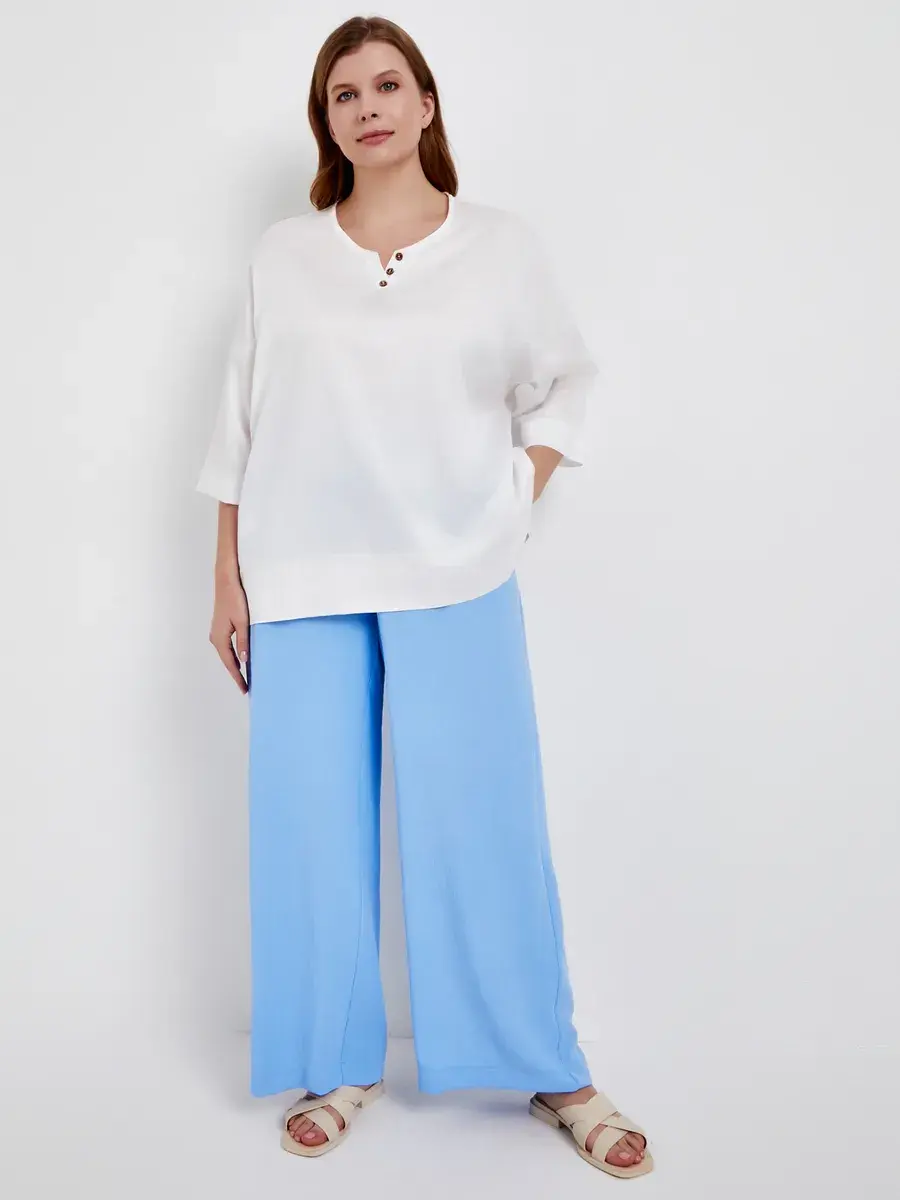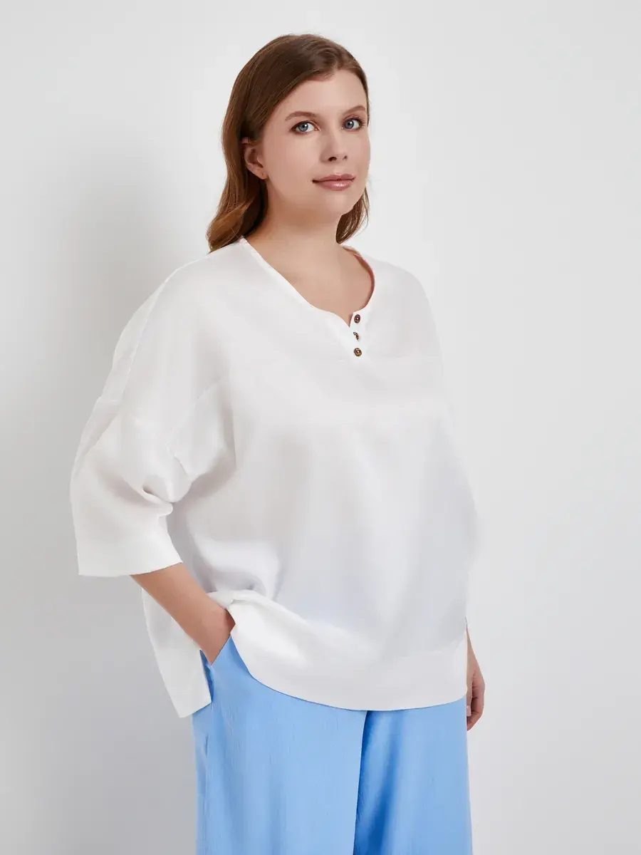 Женская блузка больших размеров распашного кроя с рукавом 3/4, круглый вырез. Выполнена из мягкого и приятного на ощупь текстильного полотна хлопок с вискозой. Модель расслабленного фасона в этно-стиле. На фигуре сидит свободно, рубашка оверсайз на весну и лето женщинам, чтобы в жаркую погоду тело дышало. Рукав со спущенной проймой. Благодаря своему свободному крою и объемным рукавам, она создает эффектный и модный образ. Наша блузка идеально подойдет женщинам для праздничных мероприятий и особых случаев. Вы сможете выглядеть ярко и элегантно на новогодней вечеринке, дне рождения, юбилее или свадьбе. Она также подойдет для похода в кино, театр или ресторан. Блузка создаст неповторимый образ для работы и придаст уверенности. Наша блузка – это модная и стильная находка для любого времени года. Она легкая и удобная, подходит как для летнего сезона, так и для зимы. Вы сможете носить ее в любое время года, создавая неповторимые и стильные образы. Из-за натурального состава ткани, туника мнется как лен.