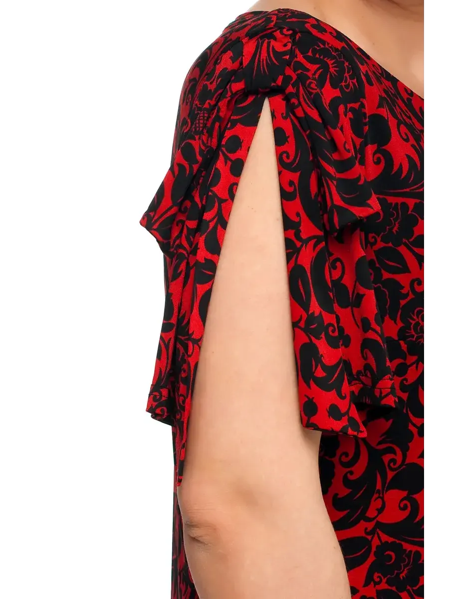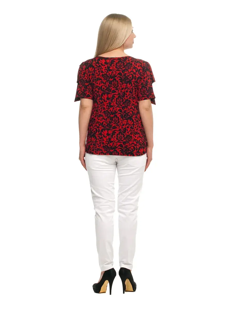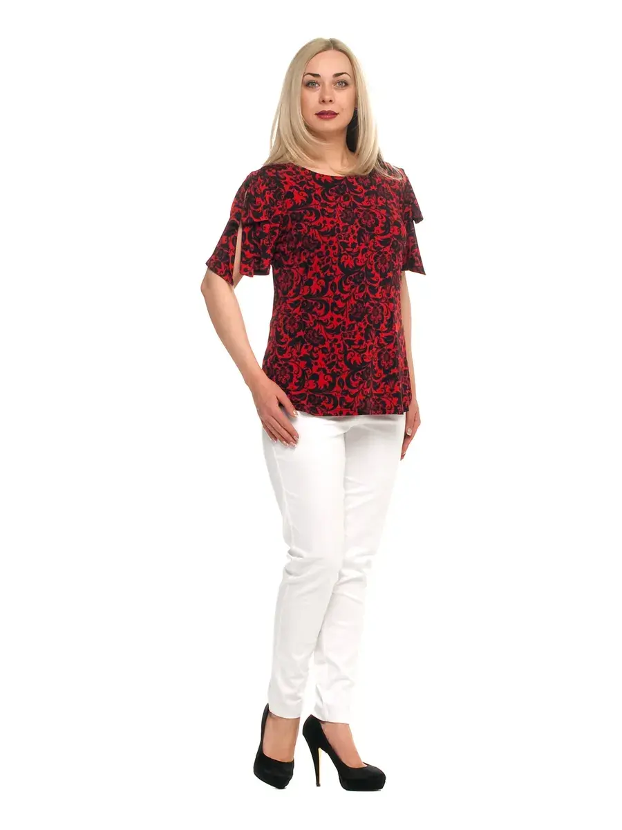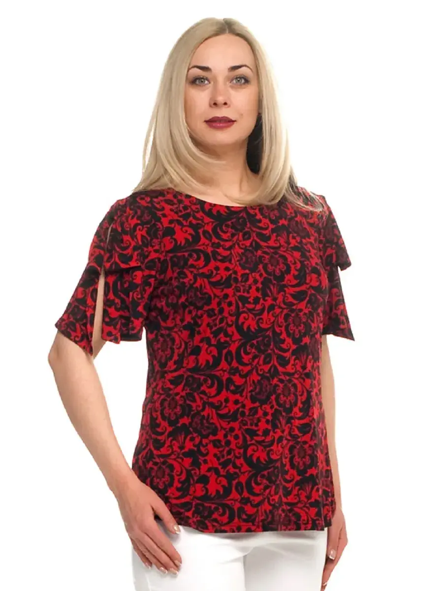 Яркая женская блузка-футболка больших размеров от бренда Олси выполнена из принтованного трикотажа масло. Длина блузки чуть ниже середины бедра. Рукав формы бабочка с разрезом сверху.