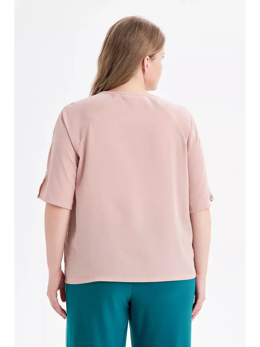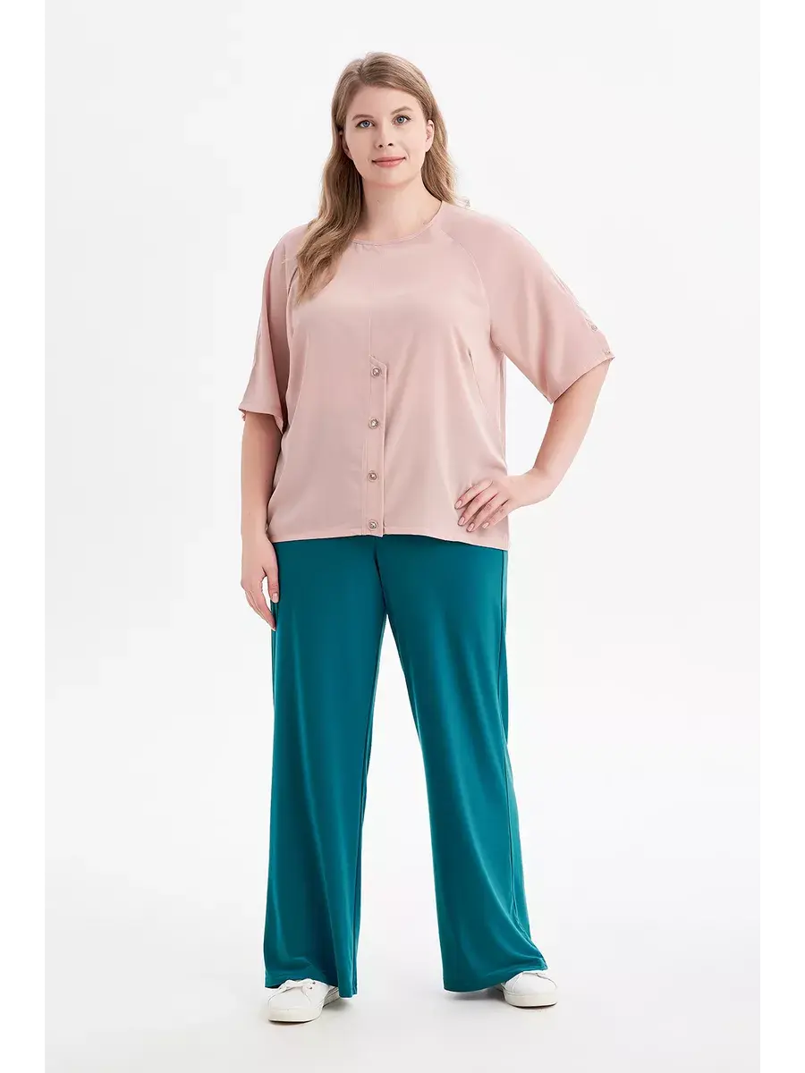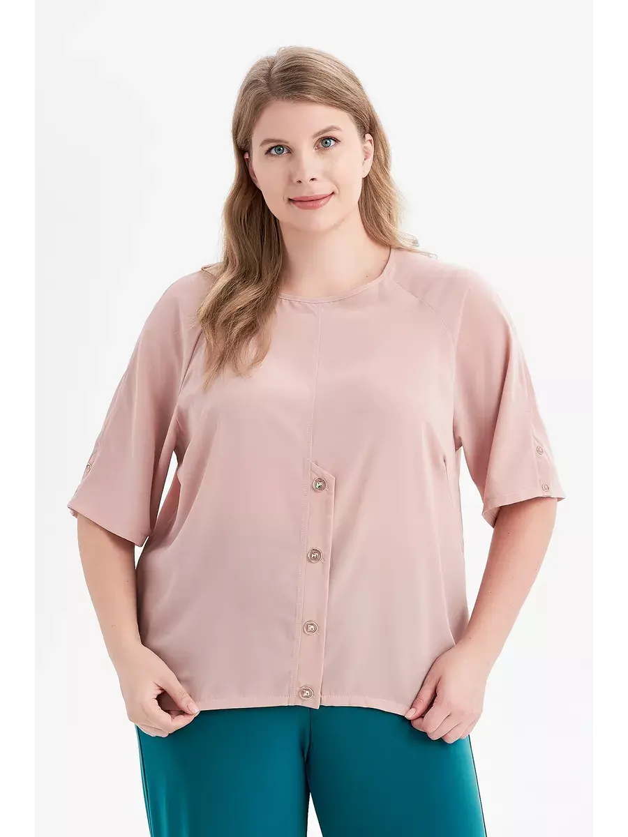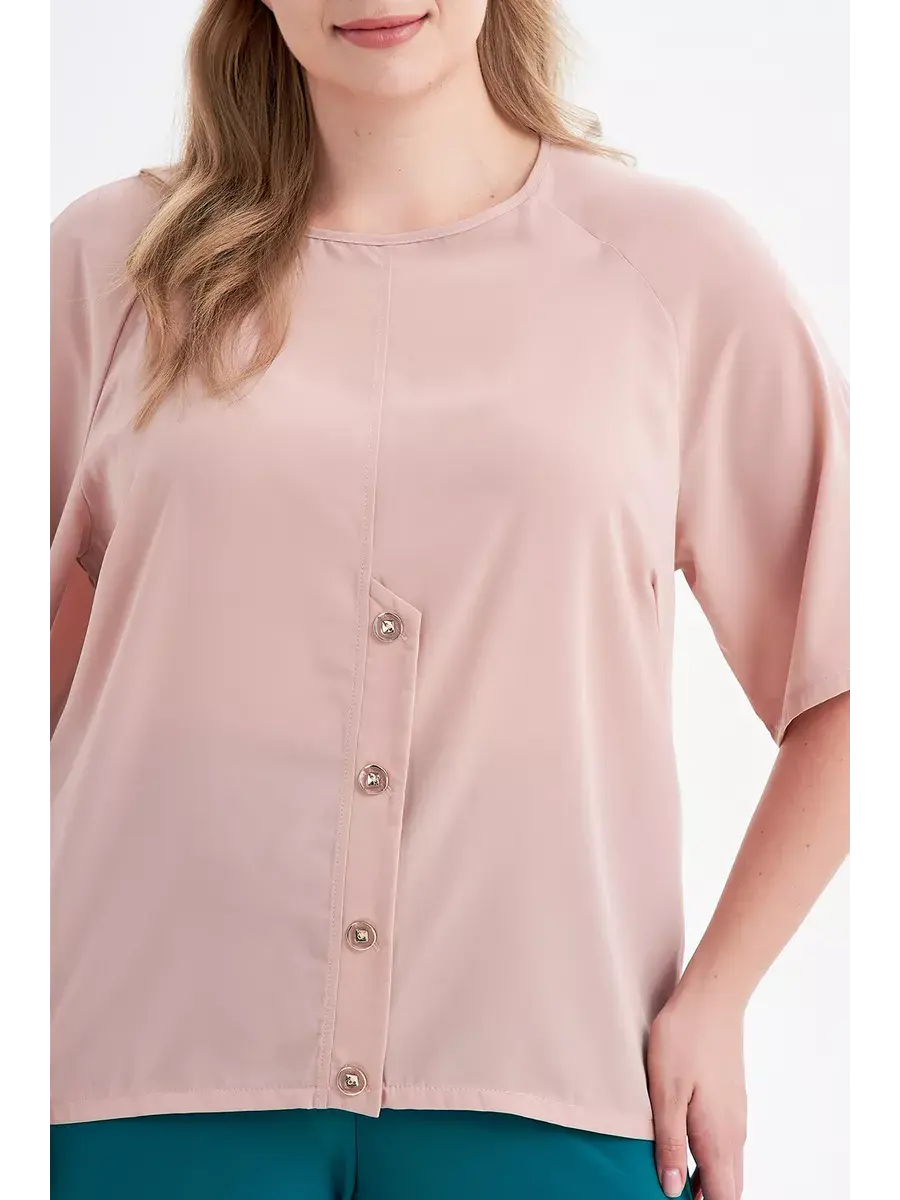 Нежная женская блузка больших размеров от бренда OLSI, выполнена из тонкого струющегося полотна по типу матового искусственного шелка, Летняя блузка свободного кроя, спереди и на рукавах декорирована пуговицами на планке. Блузка повседневная имеет круглую горловину, рукав реглан длиной до локтя. Длина блузки до середины бедра.
