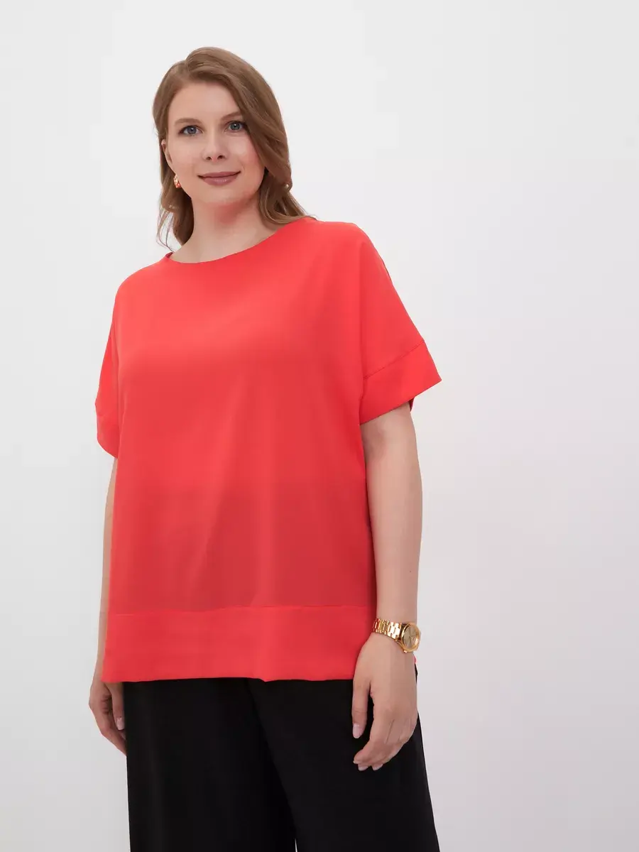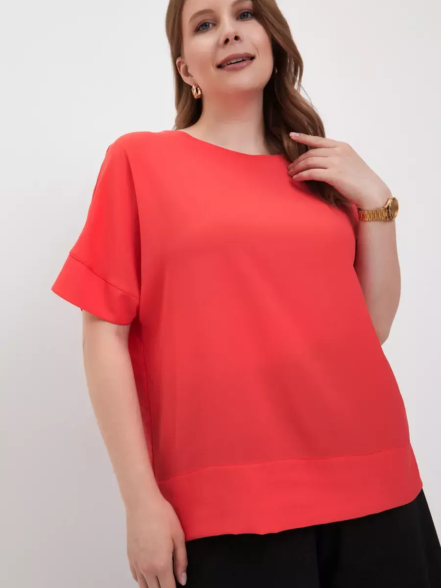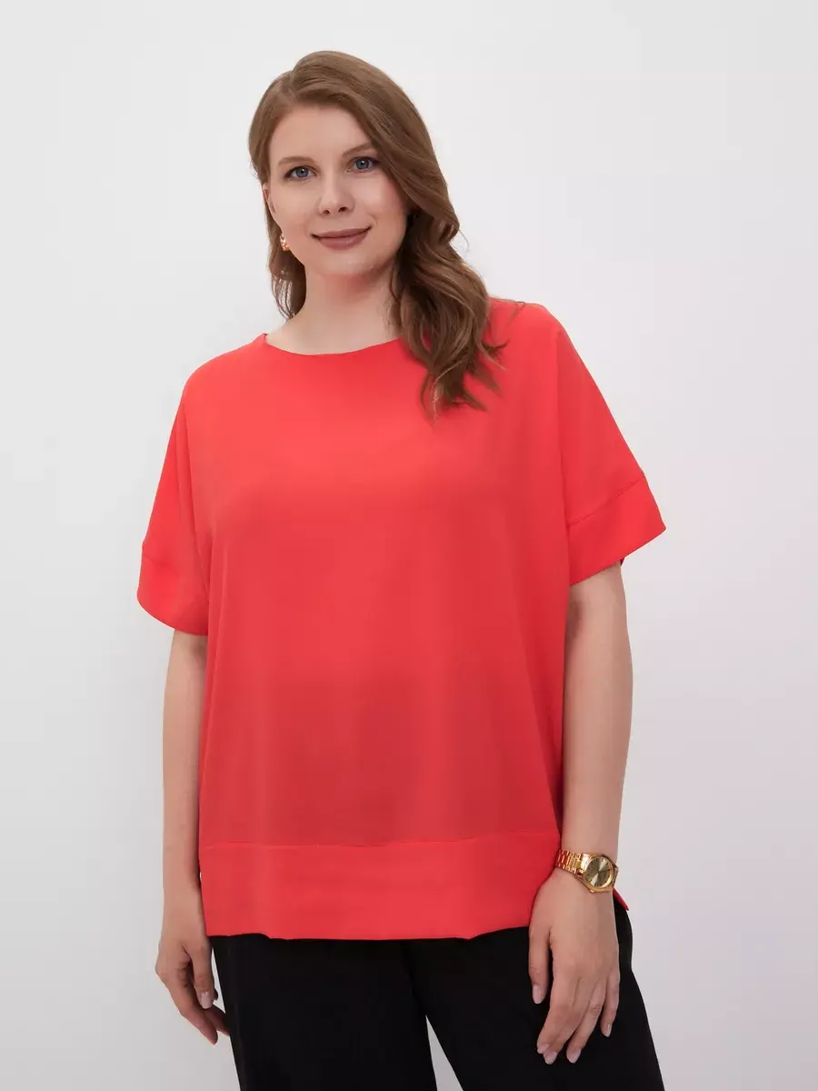 Легкая элегантная блузка больших размеров от бренда OLSI выполнена из премиум ткани переплетения по типу креп-шелка с матовой поверхностью. Однотонная женская блузка с короткими широкими рукавами с манжетой по низу, плечо приспущено; с круглым вырезом по горловине. По низу блузки широкая подгибка с отделочной строчкой, с разрезами по бокам, - что придает дорогой вид. Фасон блузки широкий и прямой. Лаконичный крой блузки топа подойдет девушкам и женщинам любого возраста. Шелковая женская блузка будет уместна в любой ситуации, как повседневная блузка на работу или учебу, так и на праздничное или вечернее мероприятие, свидание. Блузка футболка отлично сочетается с джинсами, классическими брюками, юбкой. Можно носить как футболка под пиджак или жилет. Данная модель станет базовой в гардеробе модниц. Бренд OLSI это высокое качество изделий, премиальные ткани из Южкой Кореи, и собственное производство в Москве.