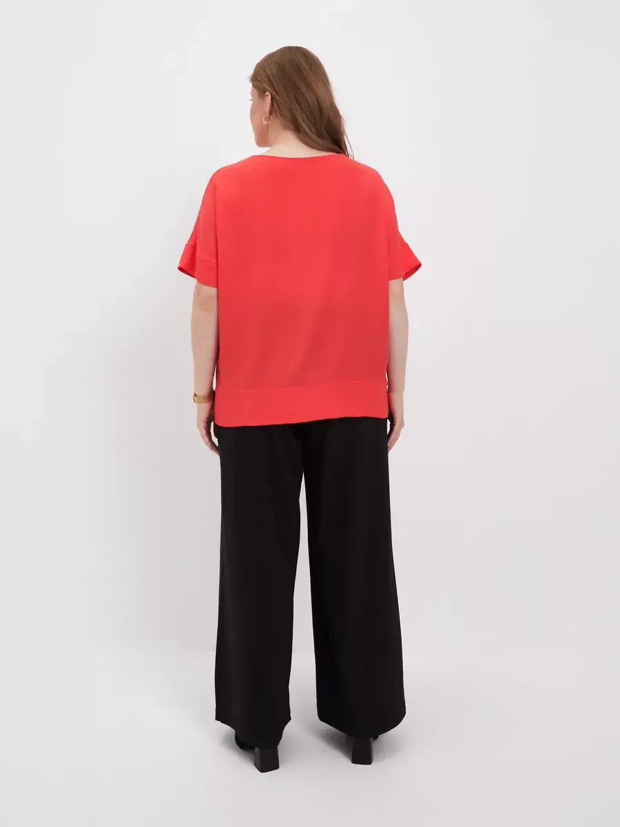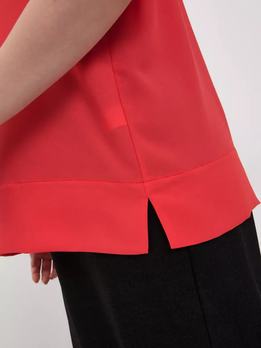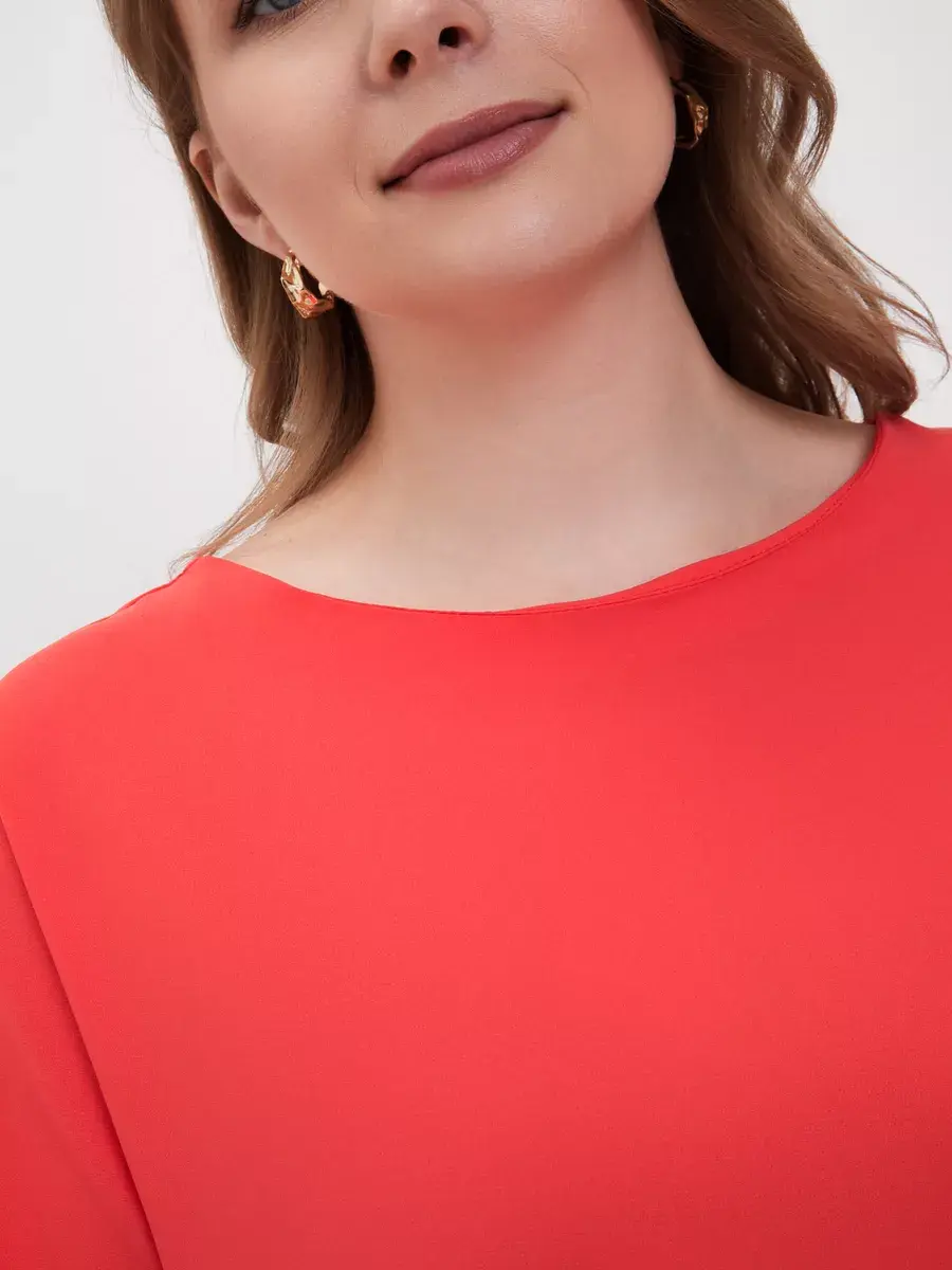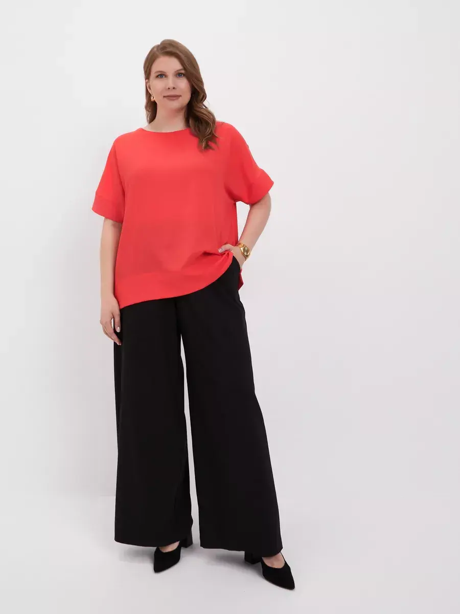 Легкая элегантная блузка больших размеров от бренда OLSI выполнена из премиум ткани переплетения по типу креп-шелка с матовой поверхностью. Однотонная женская блузка с короткими широкими рукавами с манжетой по низу, плечо приспущено; с круглым вырезом по горловине. По низу блузки широкая подгибка с отделочной строчкой, с разрезами по бокам, - что придает дорогой вид. Фасон блузки широкий и прямой. Лаконичный крой блузки топа подойдет девушкам и женщинам любого возраста. Шелковая женская блузка будет уместна в любой ситуации, как повседневная блузка на работу или учебу, так и на праздничное или вечернее мероприятие, свидание. Блузка футболка отлично сочетается с джинсами, классическими брюками, юбкой. Можно носить как футболка под пиджак или жилет. Данная модель станет базовой в гардеробе модниц. Бренд OLSI это высокое качество изделий, премиальные ткани из Южкой Кореи, и собственное производство в Москве.