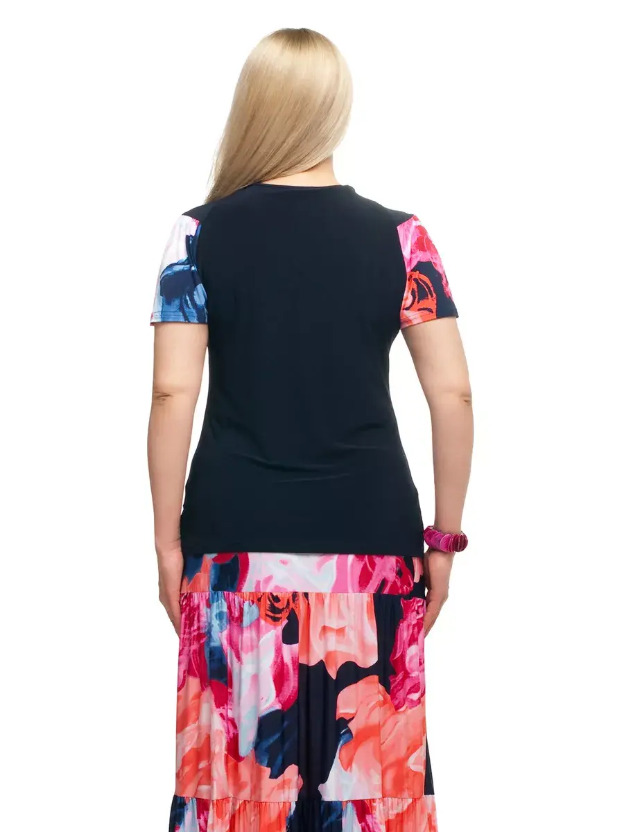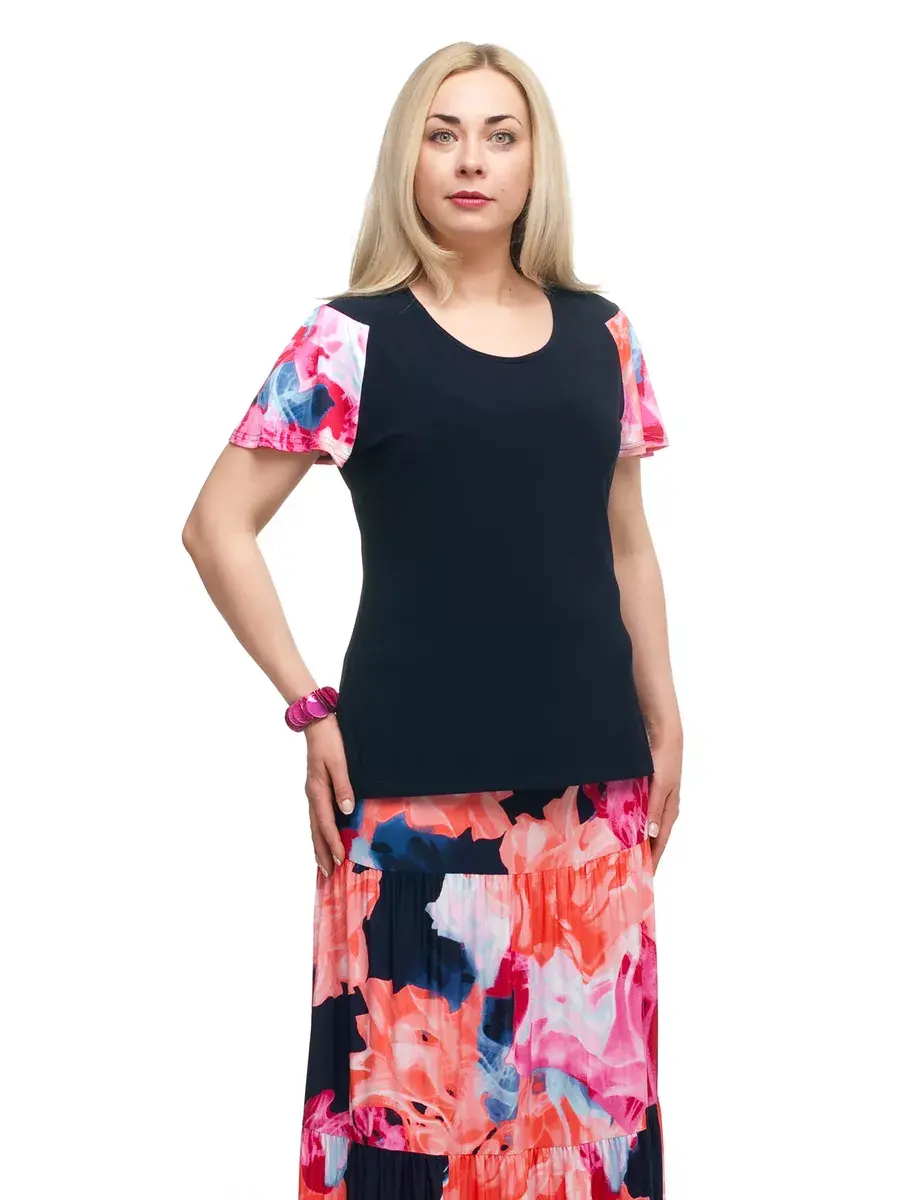Стильная женская блуза - топ от бренда OLSI, выполненный из комбинации однотонного трикотажа масло и цветного принтованного. Трикотаж-масло очень полюбился нашим клиентам. Не смотря на то, что состав материала - полиэстер, - ткань очень комфортна в носке и неприхотлива: не мнется, не требует глажки, в жаркую погоду холожит кожу. Такой материал почти не чувствуется на коже, при этом Вы будете выглядеть великолепно. Летняя блузка Олси фасона футболка хорошо сочетается как с брюками, так и с юбкой.
