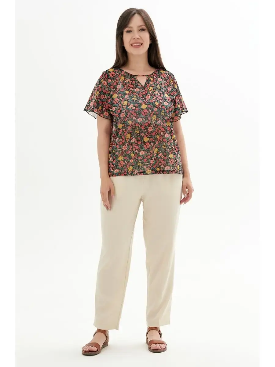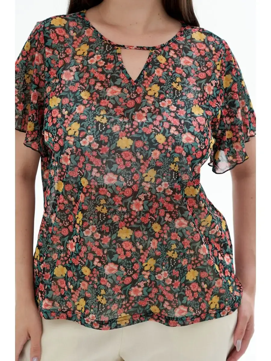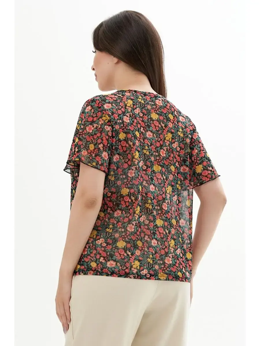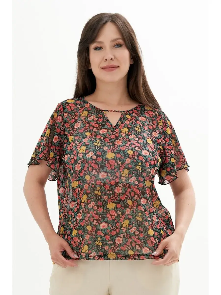 Женская блузка больших размеров, выполнена из полотна по типу сетка, без вытачек. Длина по спинке во всех размерах 62см.