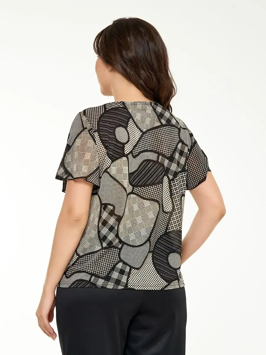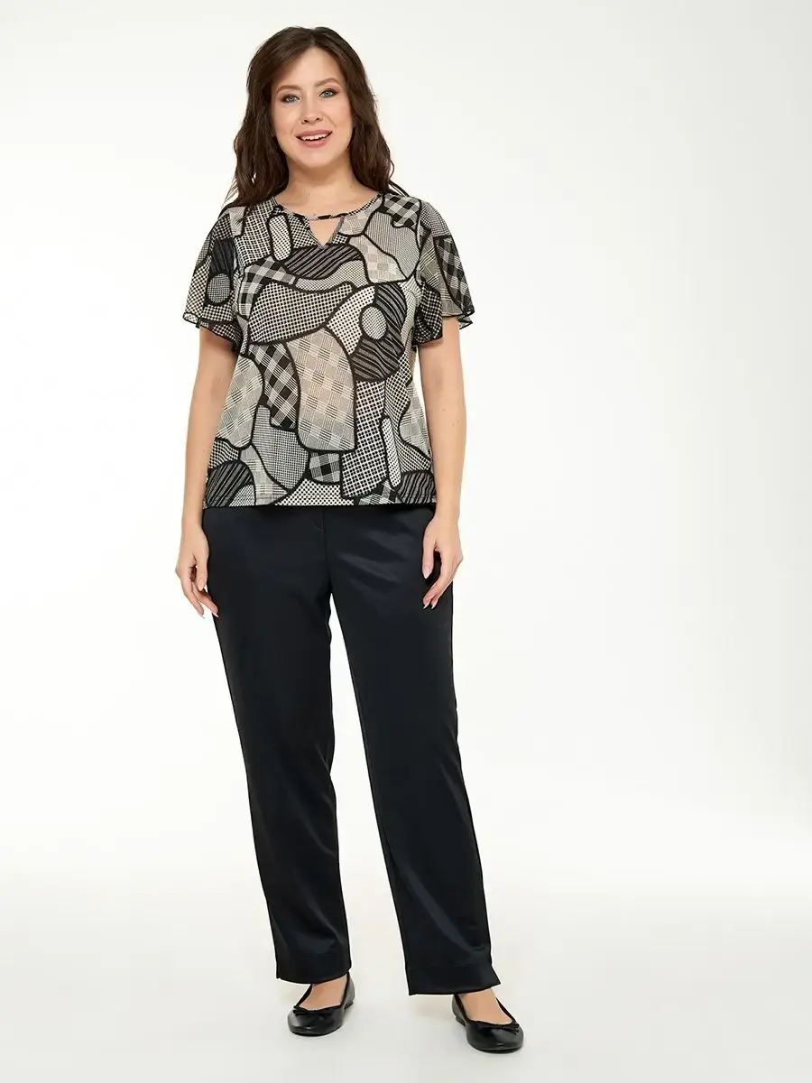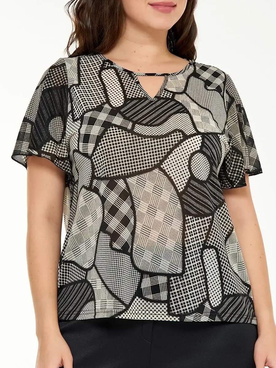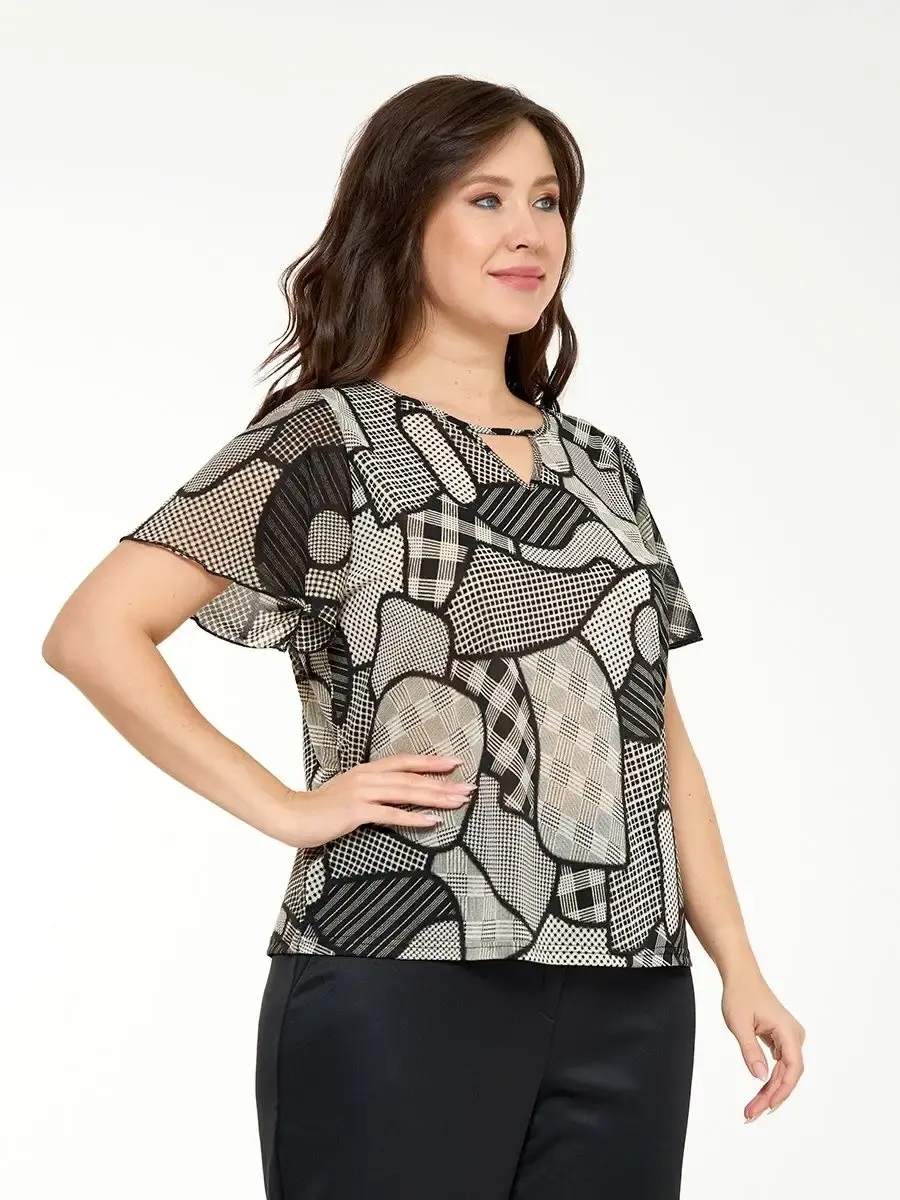 Женская блузка больших размеров, выполнена из полотна по типу сетка, без вытачек. Длина по спинке во всех размерах 62см.