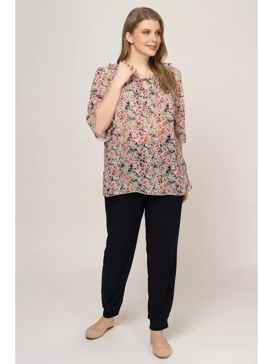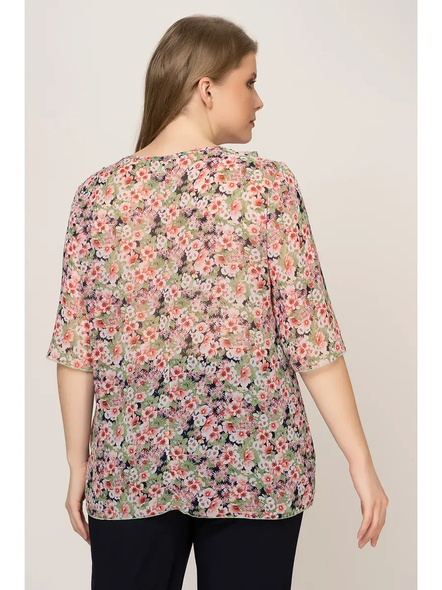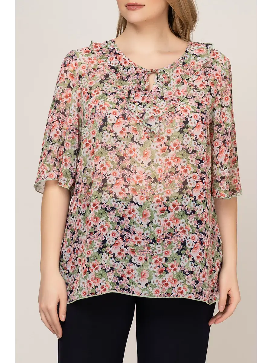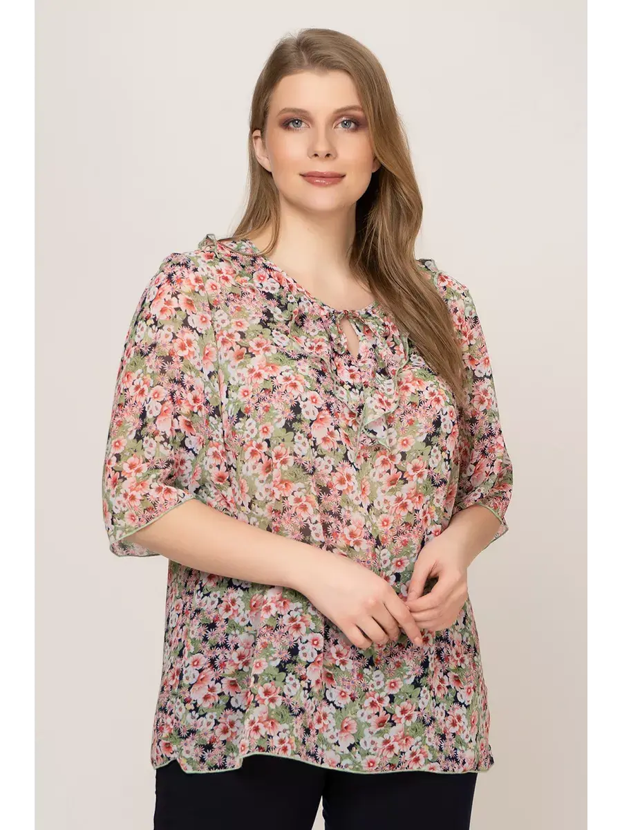 Нежная полупрозрачная блузка больших размеров от бренда OLSI. Летняя легкая туника выполнена их тонкого принтованного шифона в мелкий цветочек, прямого кроя, с широким рукавом-колокол до локтя и круглым вырезом с треугольным воротником - жабо на завязках. Кромки изделия обработаны опиковкой, что делает модель полностью воздушной. Прямой свободный крой блузки не стесняет движения, корректирует линию фигуры, идеальный вариант для романтичных жизнерадостных натур с аппетитными формами. Шифоновая блузка женская больших размеров свободного фасона. Длина по спинке: