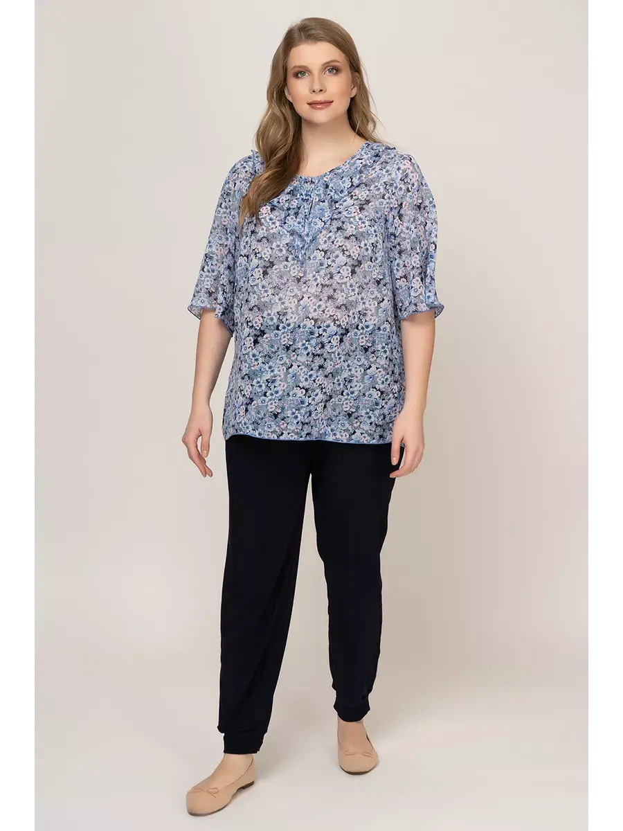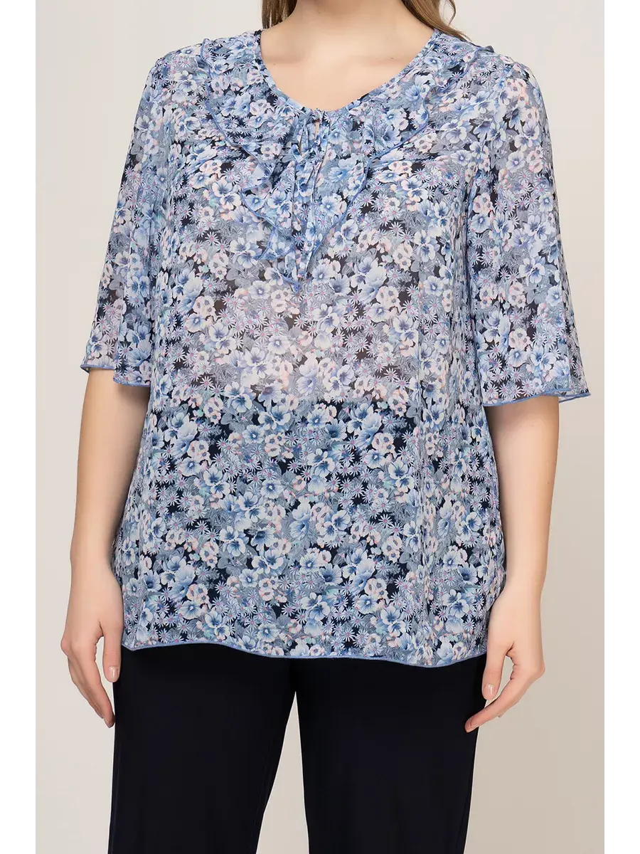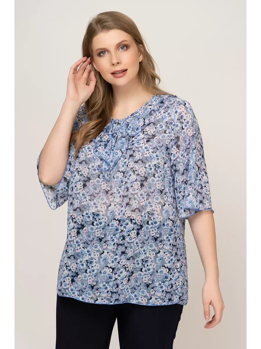 Нежная полупрозрачная блузка больших размеров от бренда OLSI. Летняя легкая туника выполнена их тонкого принтованного шифона в мелкий цветочек, прямого кроя, с широким рукавом-колокол до локтя и круглым вырезом с треугольным воротником - жабо на завязках. Кромки изделия обработаны опиковкой, что делает модель полностью воздушной. Прямой свободный крой блузки не стесняет движения, корректирует линию фигуры, идеальный вариант для романтичных жизнерадостных натур с аппетитными формами. Шифоновая блузка женская больших размеров свободного фасона. Длина по спинке: