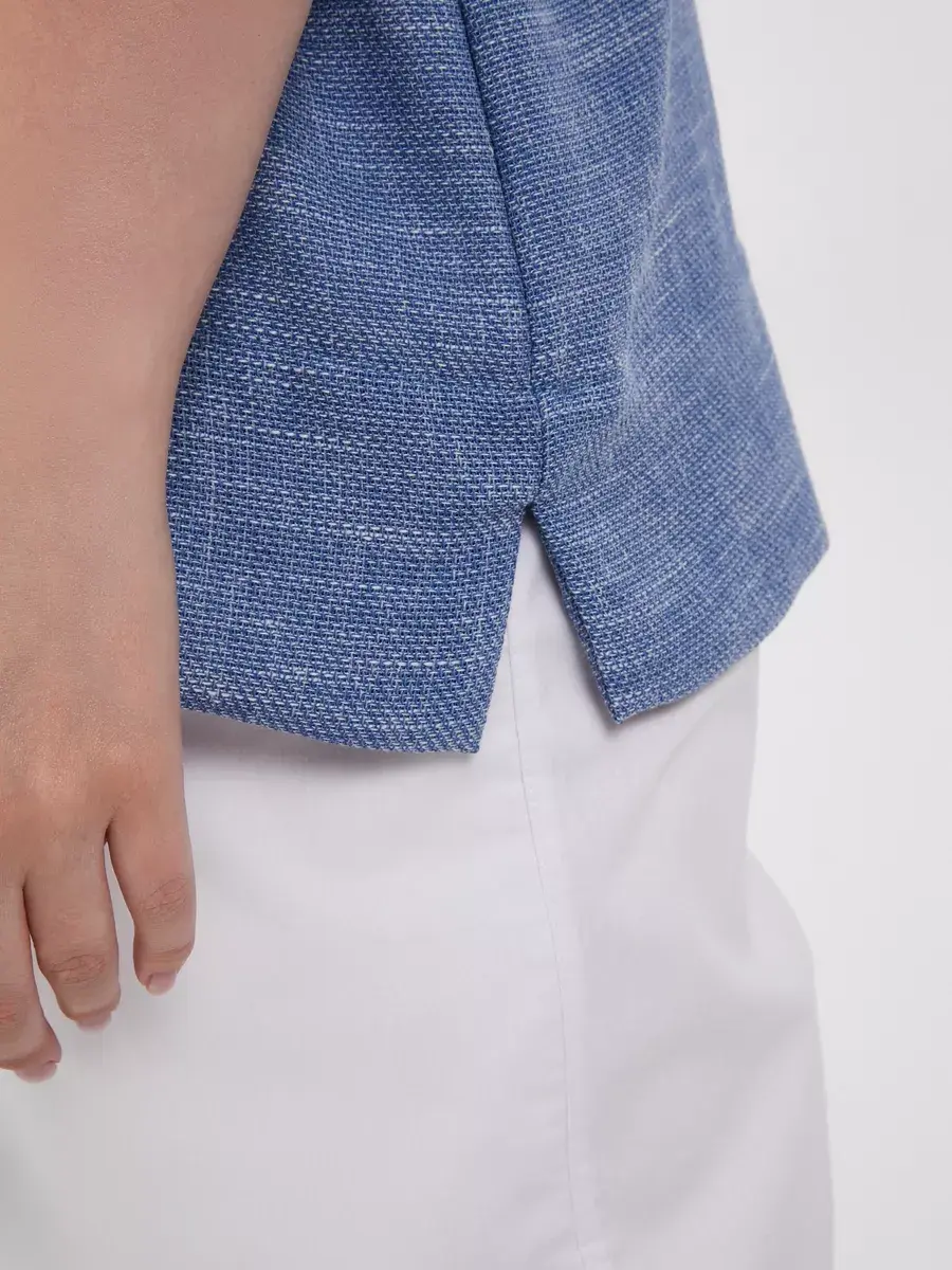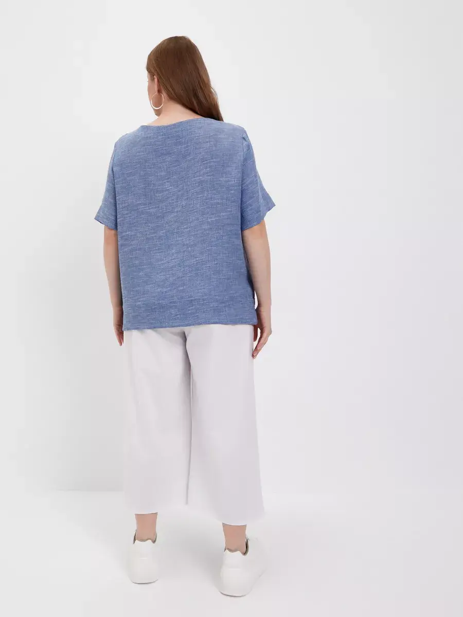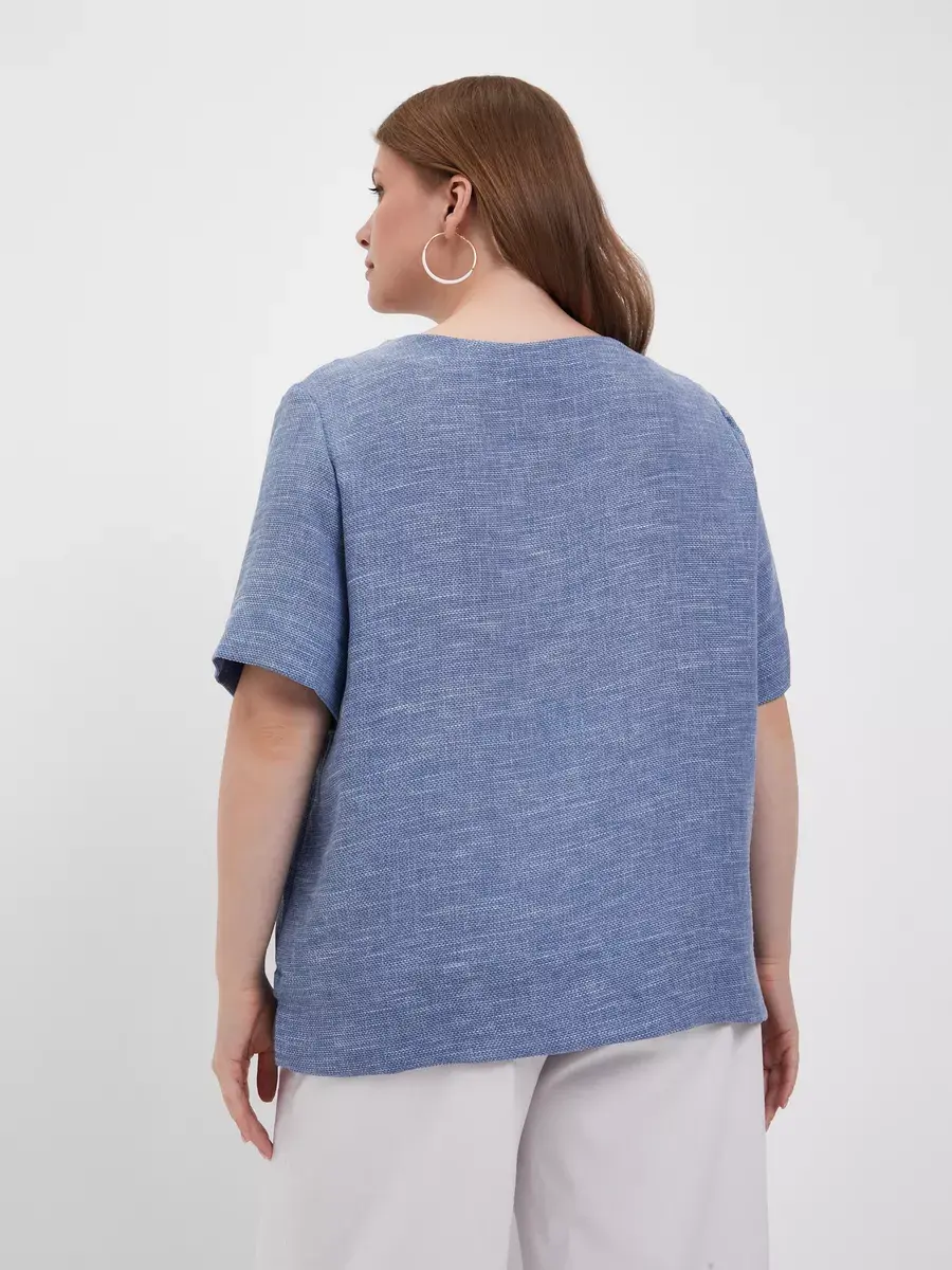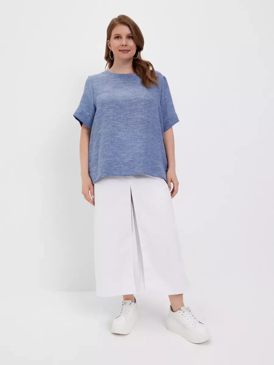Легкая элегантная блузка больших размеров от бренда OLSI выполнена из ткани рогожка. Однотонная женская блузка с короткими широкими рукавами с манжетой по низу, плечо приспущено; с круглым вырезом по горловине. По низу блузки широкая подгибка с отделочной строчкой, с разрезами по бокам, - что придает дорогой вид. Фасон блузки широкий и прямой. Лаконичный крой блузки топа подойдет девушкам и женщинам любого возраста. Модель будет уместна в любой ситуации, как повседневная блузка на работу, в офис или учебу, на свидание. Блузка футболка отлично сочетается с джинсами, классическими брюками, юбкой. Данная модель станет базовой в гардеробе модниц.