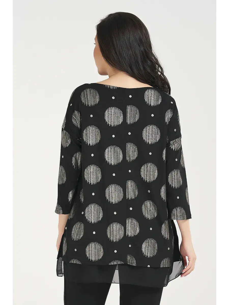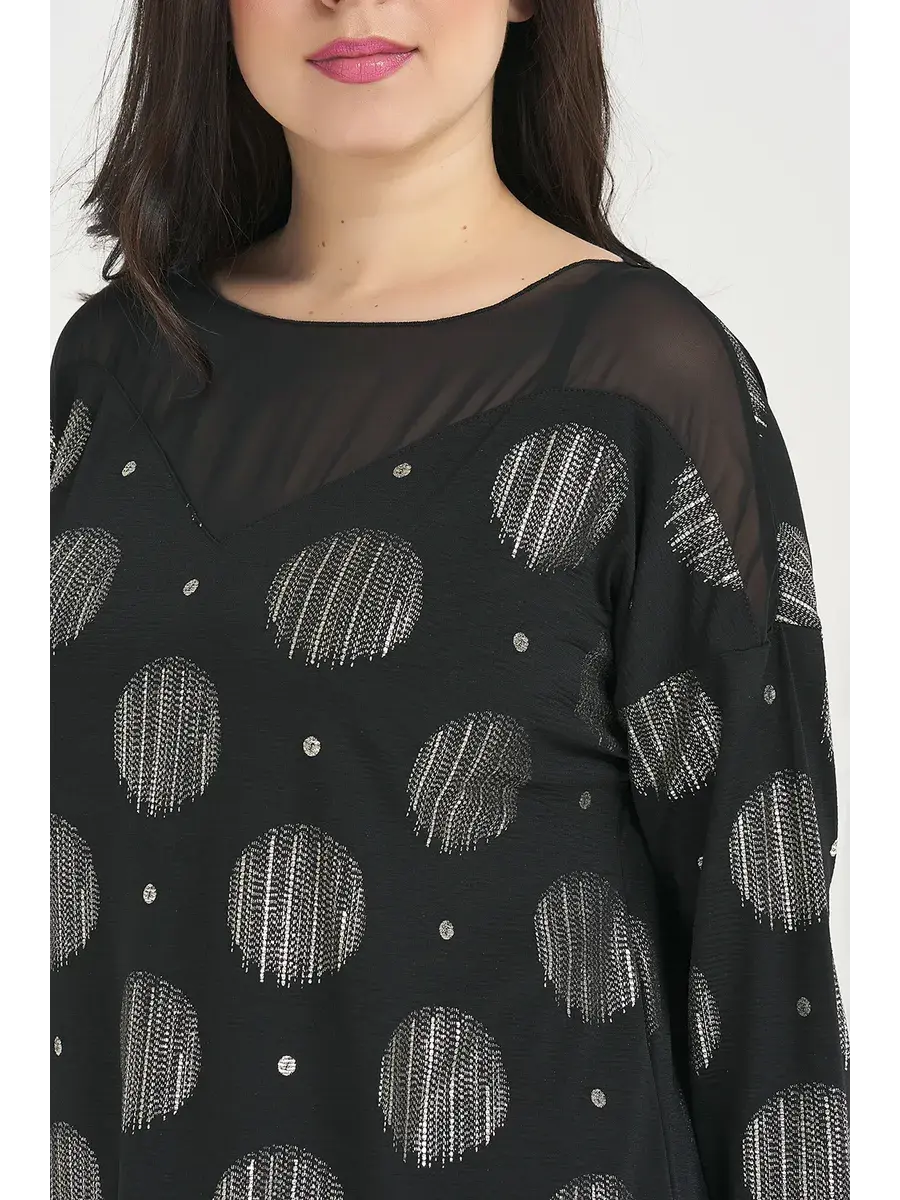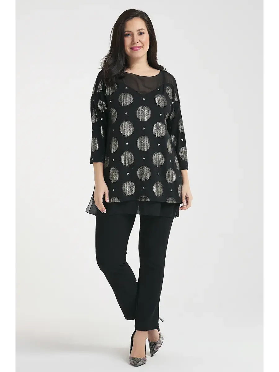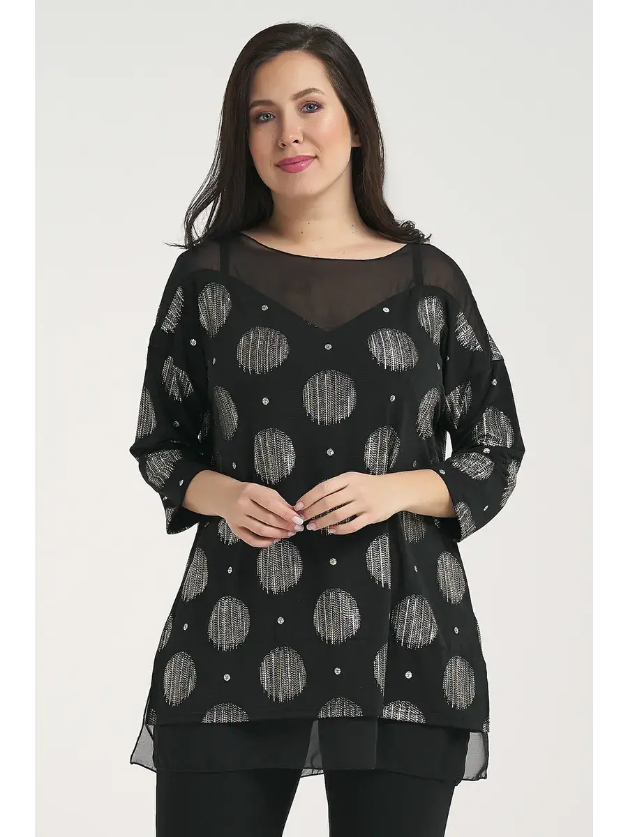Женская нарядная туника, прямого силуэта, выполненная из трикотажа. Перед с V-образной горловиной, обработан косой бейкой.Рукава полу реглан, обработаны притачными манжетами. Низ изделия обработан притачной обтачкой. Длина изделия по спинке от 79см в р.48 до 84,5см в р.70, длина рукава 43см.