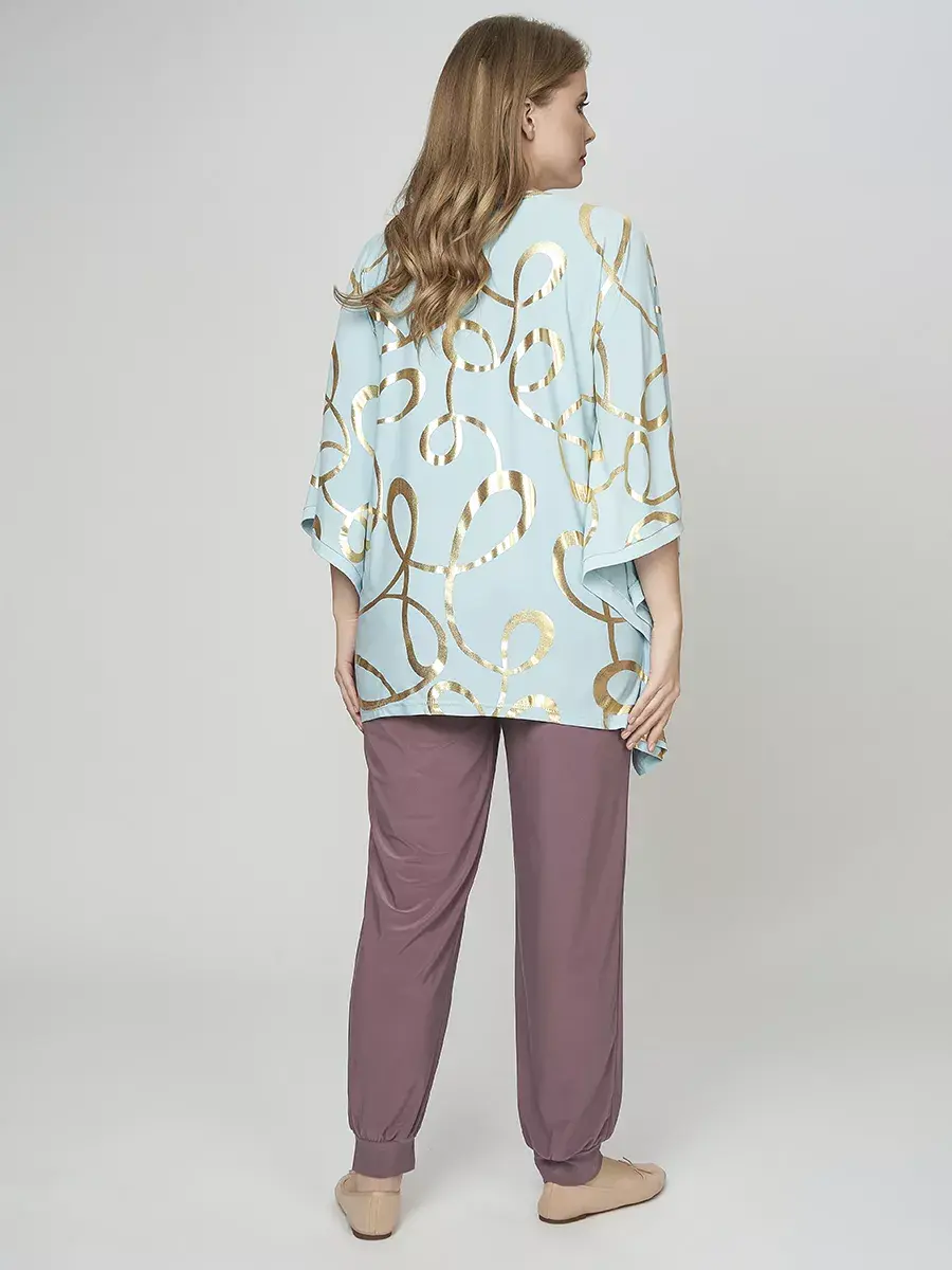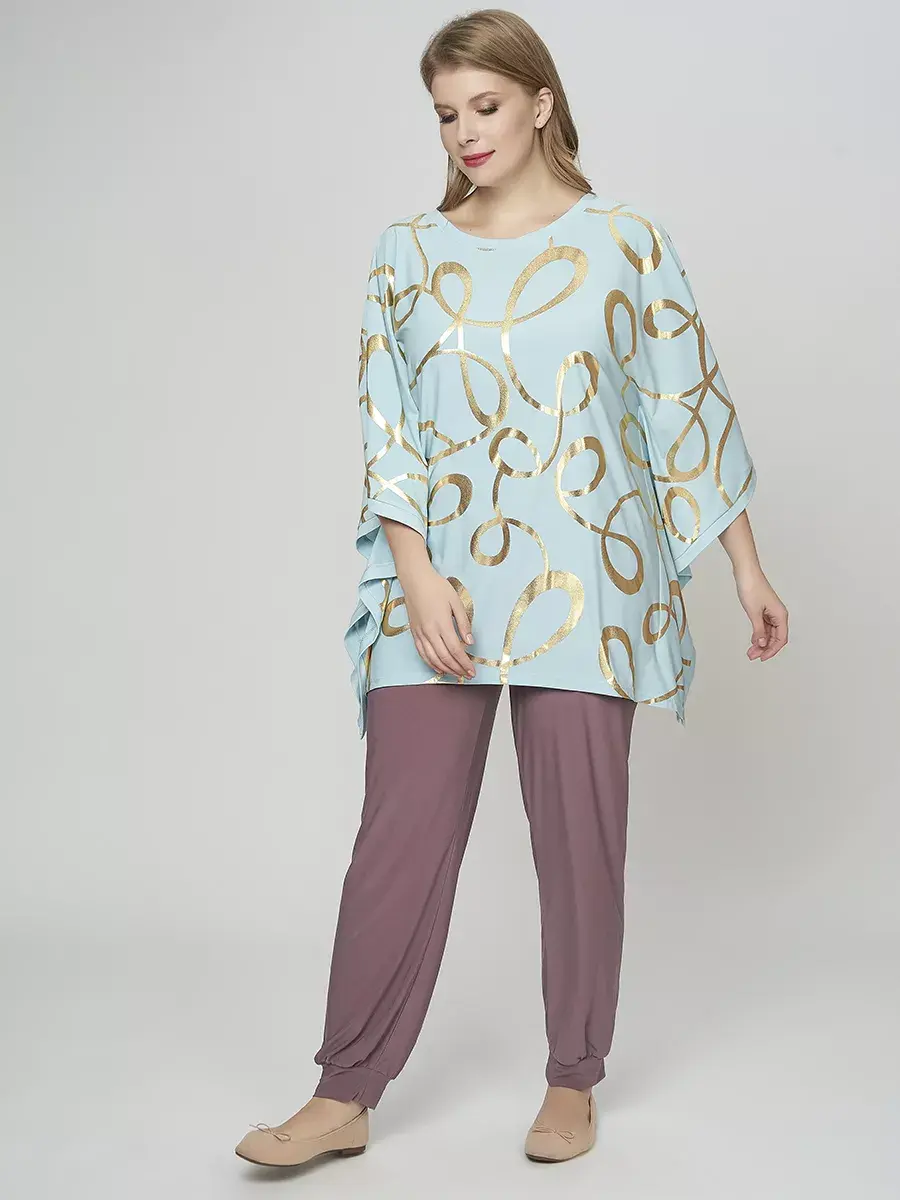 Нарядная праздничная блуза от бренда OLSI из струящегося трикотажа масло с блестящим принтом фойлом. Нарядная блузка летучая мышь. Идеально на праздник, вечернее мероприятие или Новый Год. Модель с округлым вырезом горловины; широкими цельнокроеными ассиметричными рукавами с разрезами на обшлагах, длиной 3/4, мягко переходящие в волнистые боковые швы. Свободный крой изделия придает ему сходство с накидкой, красиво обнажает руки и придает плавность движениям, визуально делает силуэт женственным и грациозным. Туника безупречно сядет на фигуру любого типа.