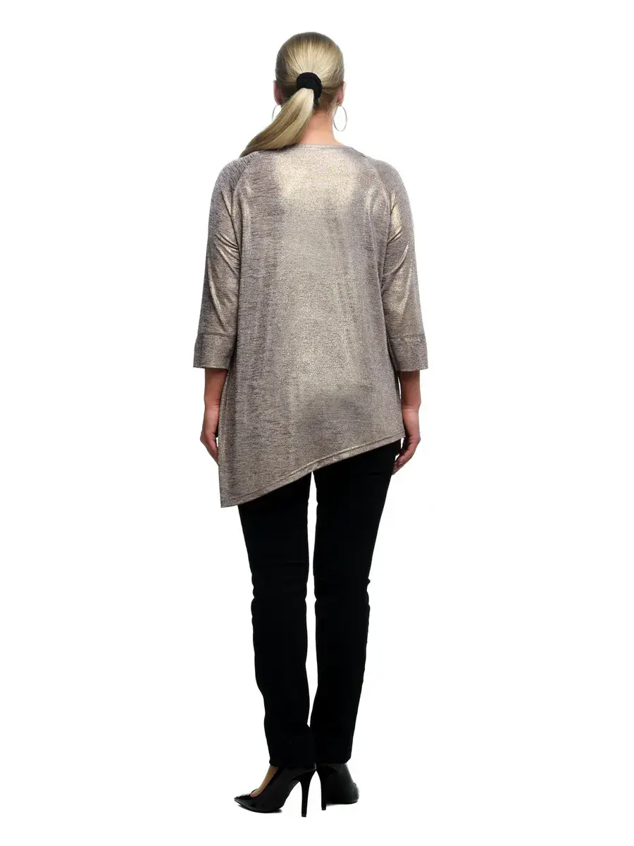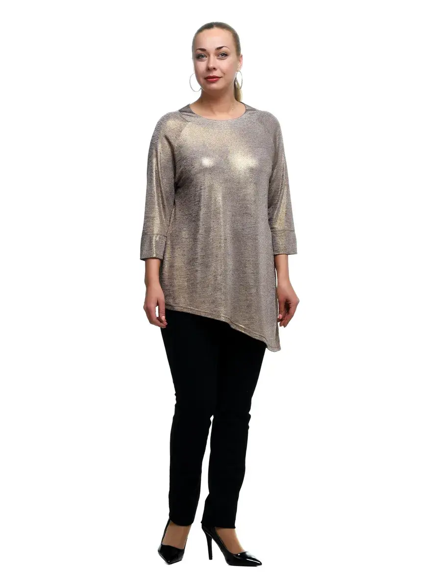 Восхитительная женская блуза туника из трикотажа масло с напылением. Модель A- силуэта; с округлым вырезом горловины, отделанным окантовкой; укороченными рукавами реглан с манжетами; ассиметричного диагонального кроя по низу, корректирующего длину ног. Простые мягкие линии изделия придают силуэту стройность, а образу женственность. В таком наряде женщина с любым типом фигуры будет выглядеть празднично и элегантно. Прекрасный недорогой вариант на праздник, новый год, юбилей, свадьбу и для корпоратива. Сочетается с брюками любых фасонов, и с юбкой. Длина изделия по спинке/длина рукава соответственно:р.48-71,5см/55,5смр.50-72,0см/55,5смр.52-72,5см/55,6смр.54-73,0см/55,6смр.56-73,5см/55,7смр.58-74,0см/55,8смр.60-74,5см/55,8смр.62-75,0см/56,0смр.64-75,5см/56,1смр.66-76,0см/56,2смр.68-76,5см/56,4смр.70-77,0см/56,4см