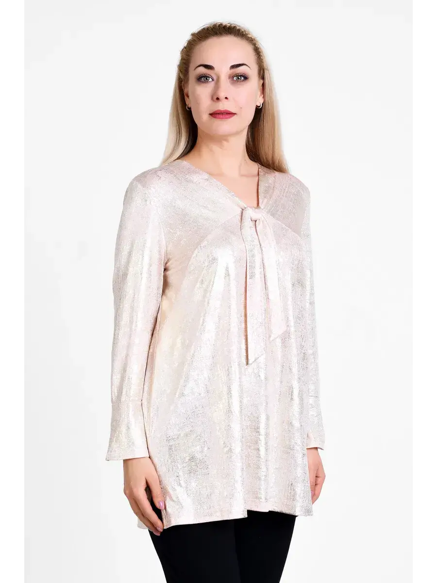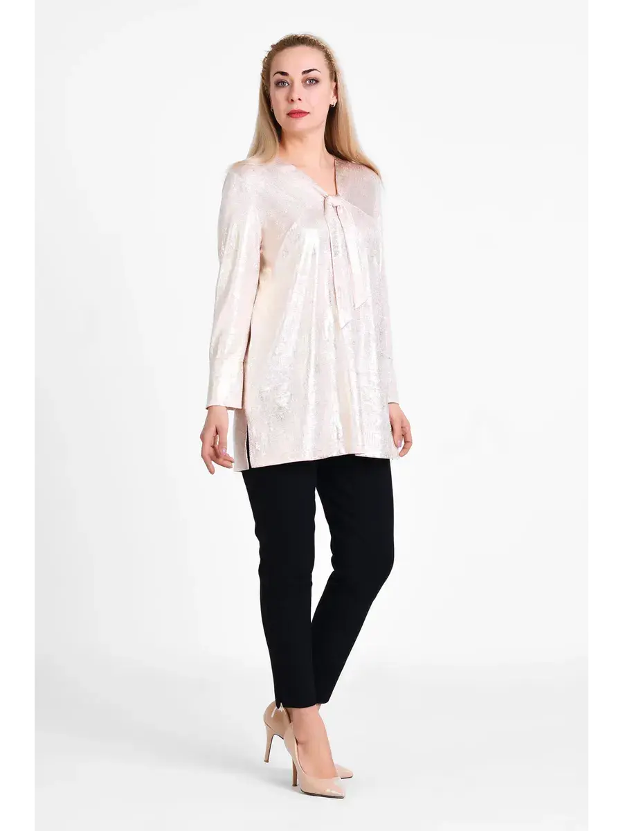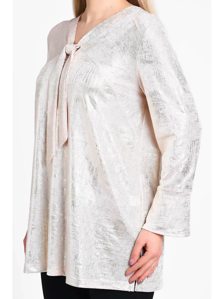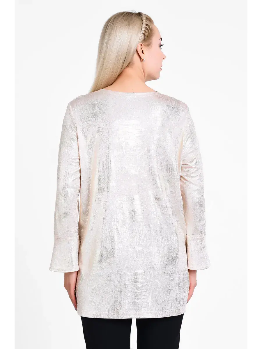 Эффектная туника шифт из тонкого трикотажа меланж с блестящим напылением фойлом. Модель A-силуэта с разрезами по бокам; с длинными рукавами-колокол; глубоким круглым вырезом горловины, отделанным декоративным плетением спереди. Лаконичность кроя и чистота линий придают изделию легкость, нивелируют особенности фигуры, придают плавность движениям. Идеальное сочетание элегантности и женственности. В таком наряде будет трудно остаться незаметной.