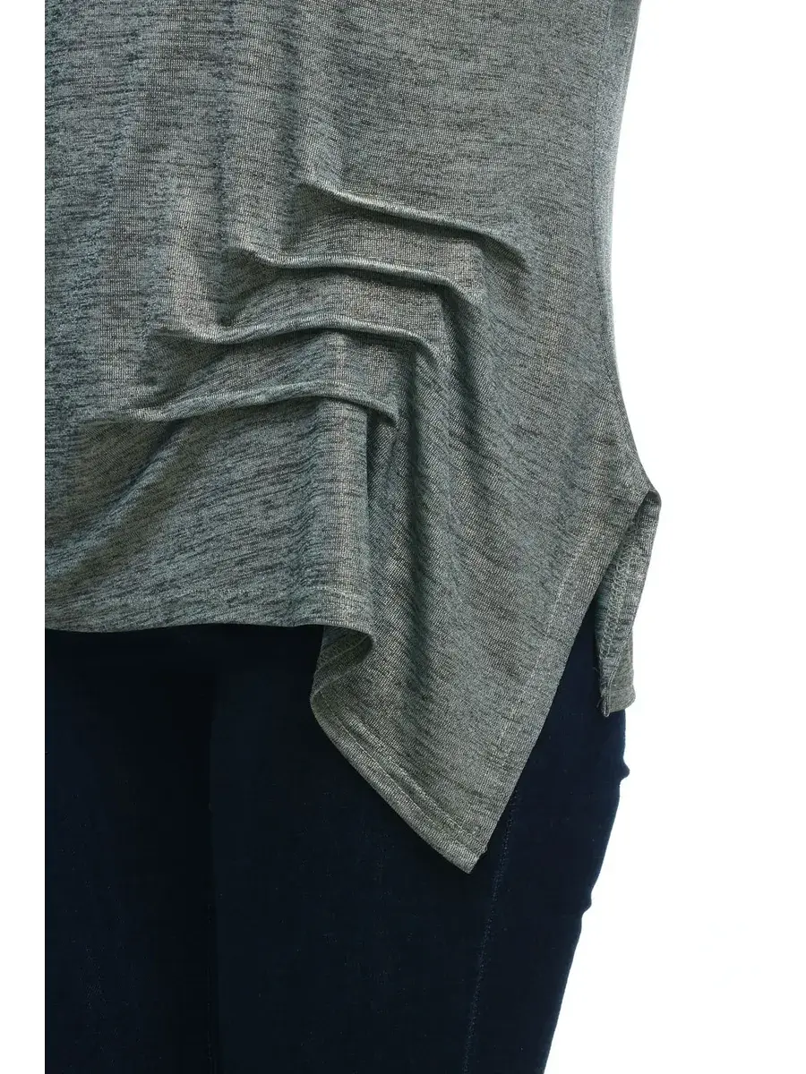 Нарядная женская блуза из трикотажа масло с напылением. Модель полуприлегающего силуэта с асимметричным кроем; с округлым вырезом горловины, отделанным окантовкой. Туника выполнена из блестящего струящегося трикотажа-меланж; переди декоративная прошивка, игриво приподнимающая боковой косой срез. Модель визуально уравновешивает фигуру, укороченные рукава красиво открывают запястья, делают образ более изящным. Простые линии изделия придают силуэту стройность, а образу женственность. В таком наряде женщина с любым типом фигуры будет выглядеть празднично и элегантно. Подойдет любящим праздник, жизнерадостным кокеткам. Прекрасный недорогой вариант на праздник, новый год, юбилей, свадьбу и для корпоратива. Сочетается с брюками любых фасонов, и с юбкой.