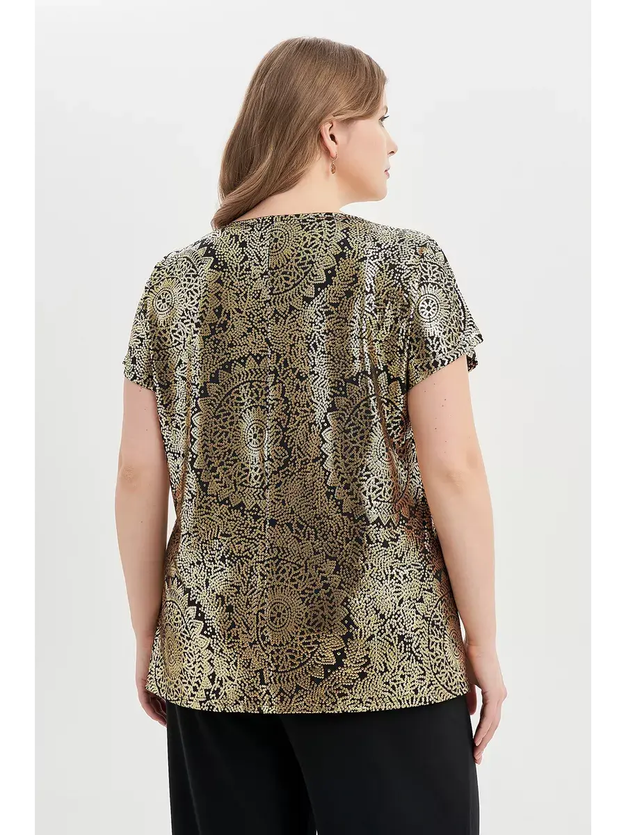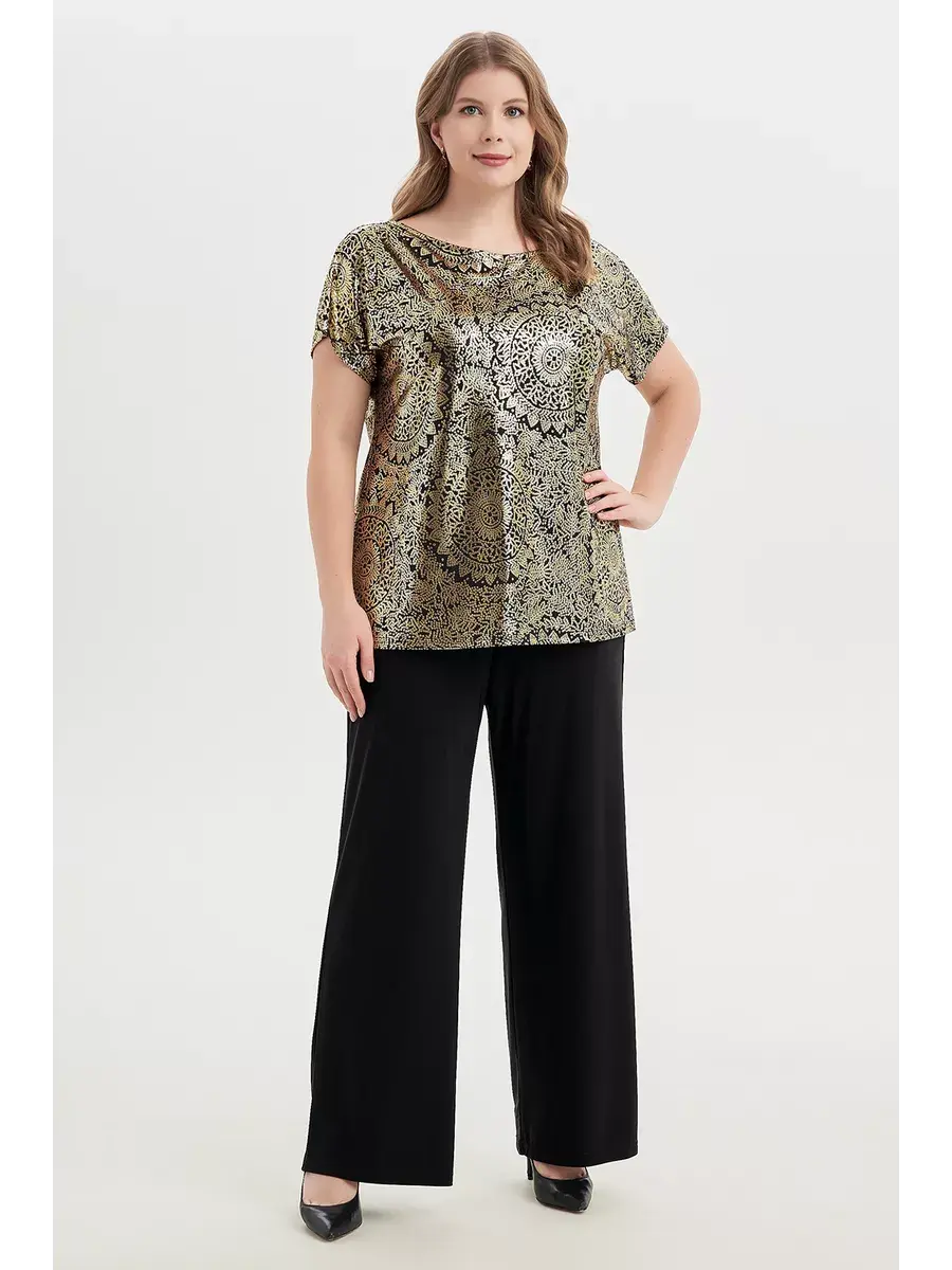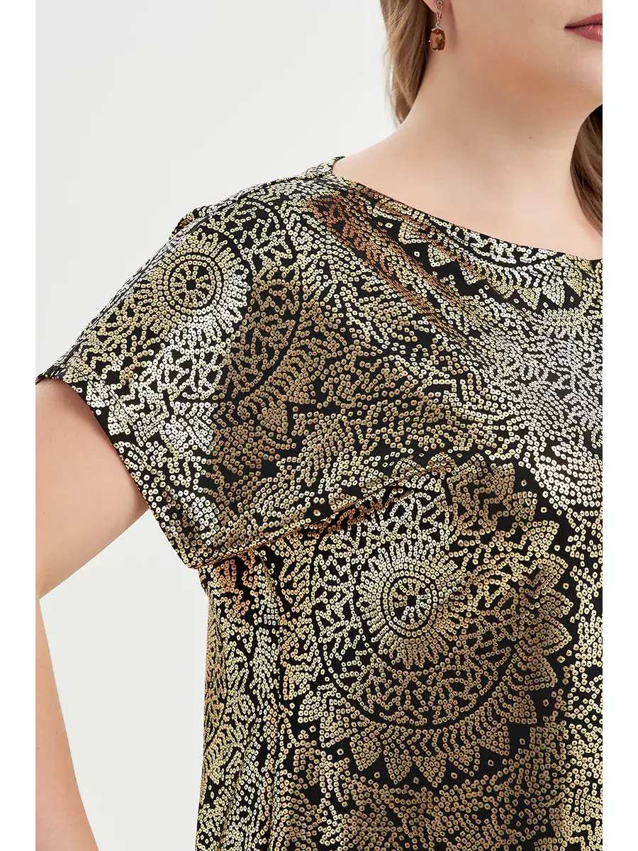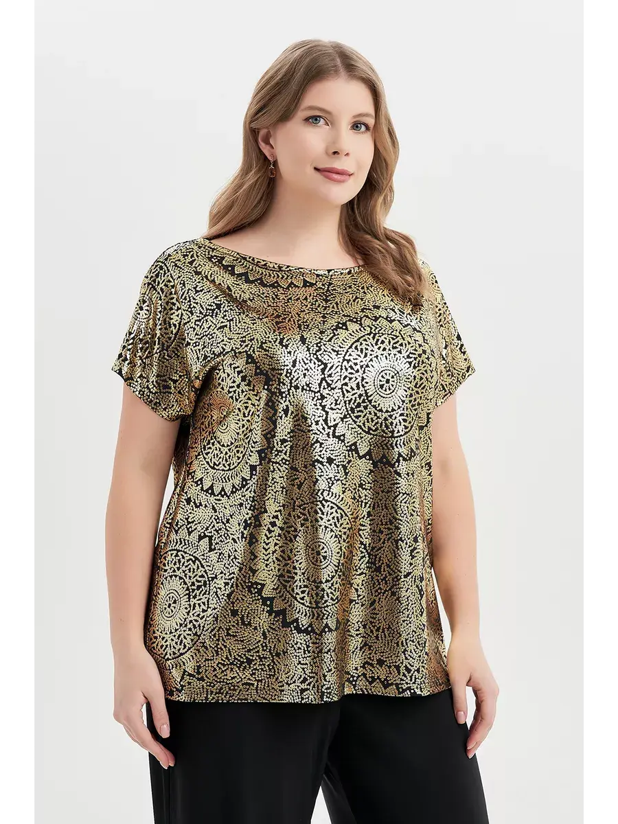 Женский нарядный топ больших размеров от бренда OLSI выполнен из трикотажного полотна по типу масло с блестящим принтом-фойлом. Эффектная нарядная блузка с коротким цельнокроенным рукавом. Блузка праздничная золотая выполнена из струящегося и немнущегося материала. Изюминкой кофточки является его блестящая мягкая ткань, создающая эффектное сияние. Она станет прекрасным выбором для тех, кто ценит свой стиль и стремится быть в центре внимания. Эта сверкающая блузка станет незаменимым дополнением к вашему гардеробу в любое время года. Изнанка изделия приятна к телу, позволяя вам чувствовать уверенность и элегантность. Нарядная кофта оверсайз подходит женщинам разного роста, как высоким, так и невысоким.