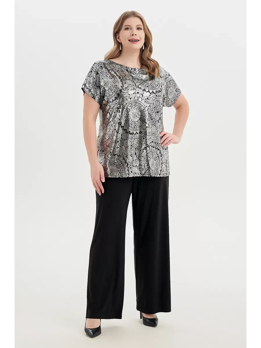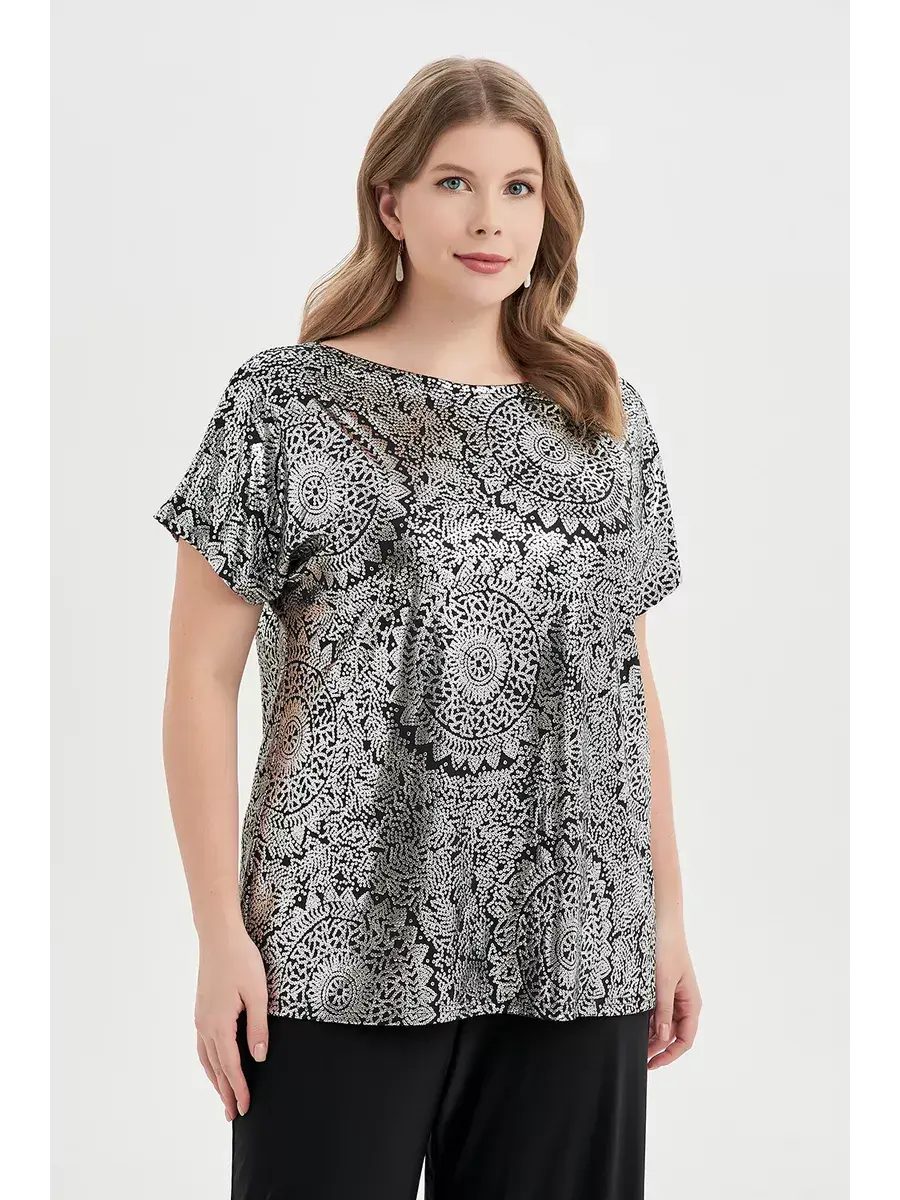 Широкий размерный ряд — от 52 до 74 размеров — делает посадку изделия идеальной как для стройных, так и для полных женщин. Нарядная футболка с коротким рукавом станет основой для создания различных образов — от офисного стиля до вечерних мероприятий и праздничных выходов. Эта стильная модная блуза представлена в разных вариантах исполнения: в золотом и серебряном цвете. Рукава имеют свободный крой, не стесняющий движения, и подойдут даже для полных рук. Вырез горловины «лодочка» придает вашей внешности элегантность, акцентируя внимание на линии плеч и шеи. Качественный немнущийся трикотаж струится прост в уходе, в отличие от нежных блузок с пайетками. Тонкий материал обеспечивает мягкость изделия. Блузы «масло» с фойлом станут ярким акцентом в наряде на Новый год 2025, корпоратив или день рождения, создавая праздничный образ, и украсят ваш зимний гардероб. Этот стильный топ отличается лаконичным дизайном, соответствующим современным модным тенденциям 2025 года. Он легко сочетается с юбкой или джинсами, становясь частью как повседневного офисного комплекта, так и вечернего ансамбля. Этот яркий джемпер подойдет девушкам любого возраста, гармонично вписываясь в любую обстановку — от деловой встречи до новогодней вечеринки, свидания, юбилея, похода в театр и других праздников.