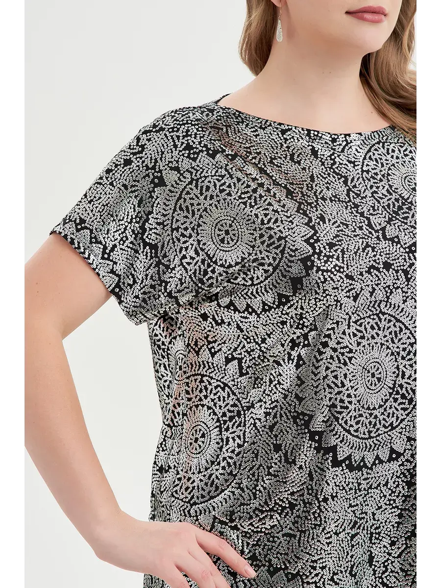 Женский нарядный топ больших размеров от бренда OLSI выполнен из трикотажного полотна по типу масло с блестящим принтом-фойлом. Эффектная нарядная блузка с коротким цельнокроенным рукавом. Блузка праздничная золотая выполнена из струящегося и немнущегося материала. Изюминкой кофточки является его блестящая мягкая ткань, создающая эффектное сияние.Эта сверкающая блузка станет незаменимым дополнением к вашему гардеробу в любое время года. Подходит женщинам разного роста, как высоким, так и невысоким.