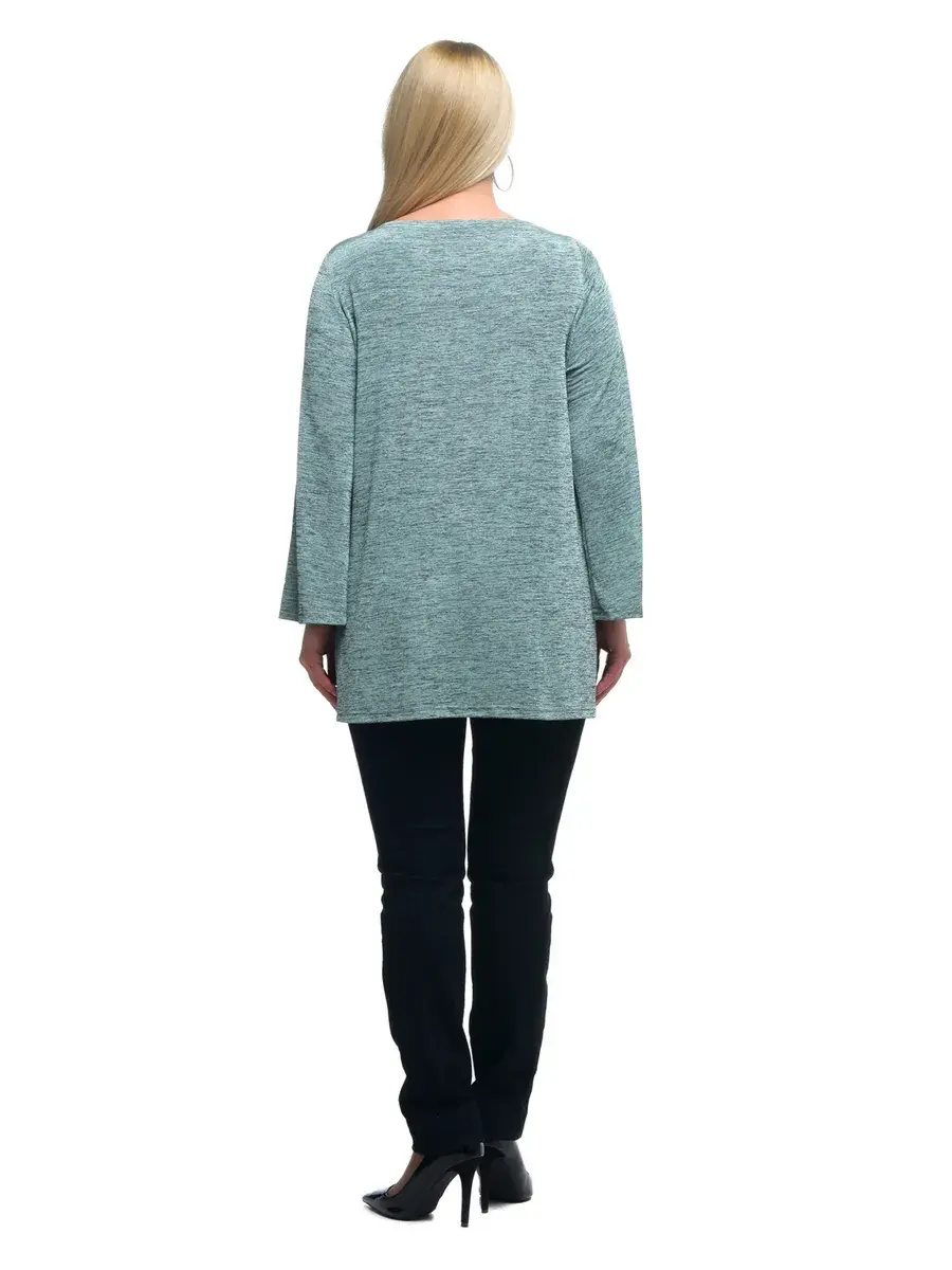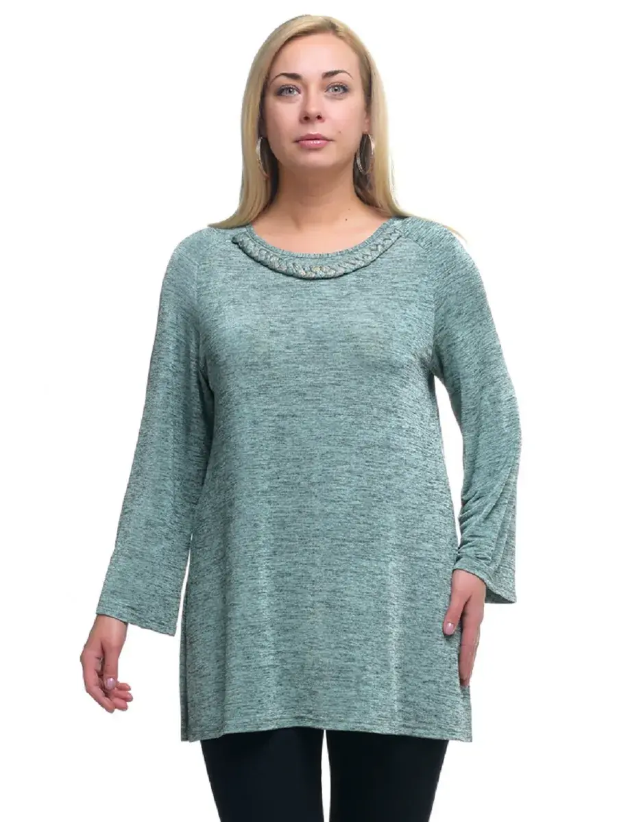 Эффектная туника шифт из тонкого трикотажа меланж с блестящим напылением фойлом. Модель A-силуэта с разрезами по бокам; с длинными рукавами-колокол; глубоким круглым вырезом горловины, отделанным декоративным плетением спереди. Лаконичность кроя и чистота линий придают изделию легкость, нивелируют особенности фигуры, придают плавность движениям. Идеальное сочетание элегантности и женственности. В таком наряде будет трудно остаться незаметной.