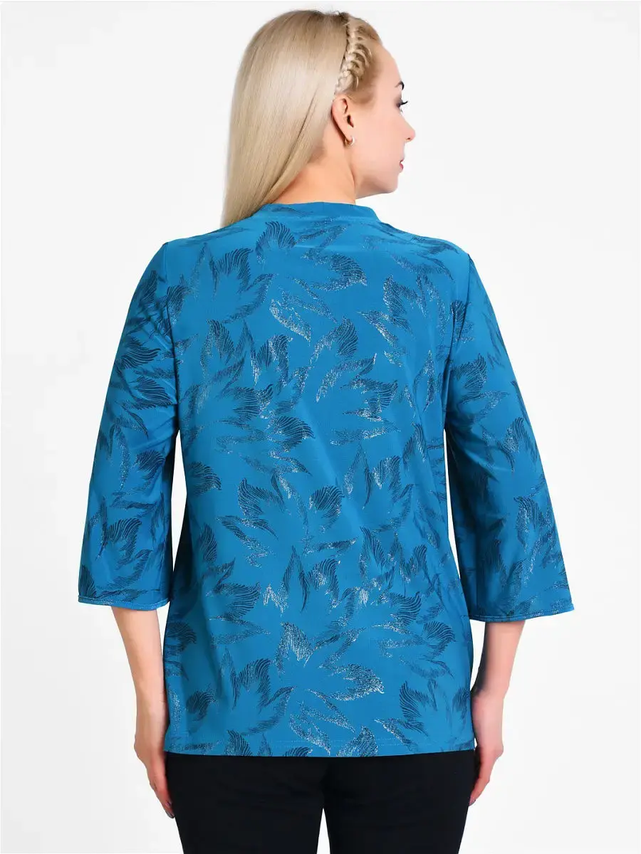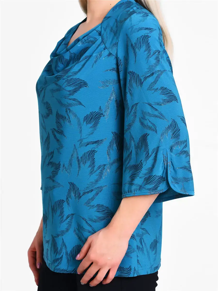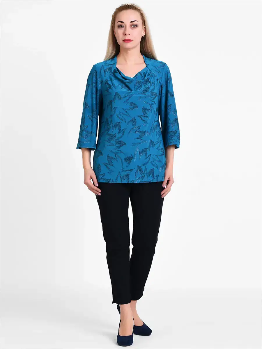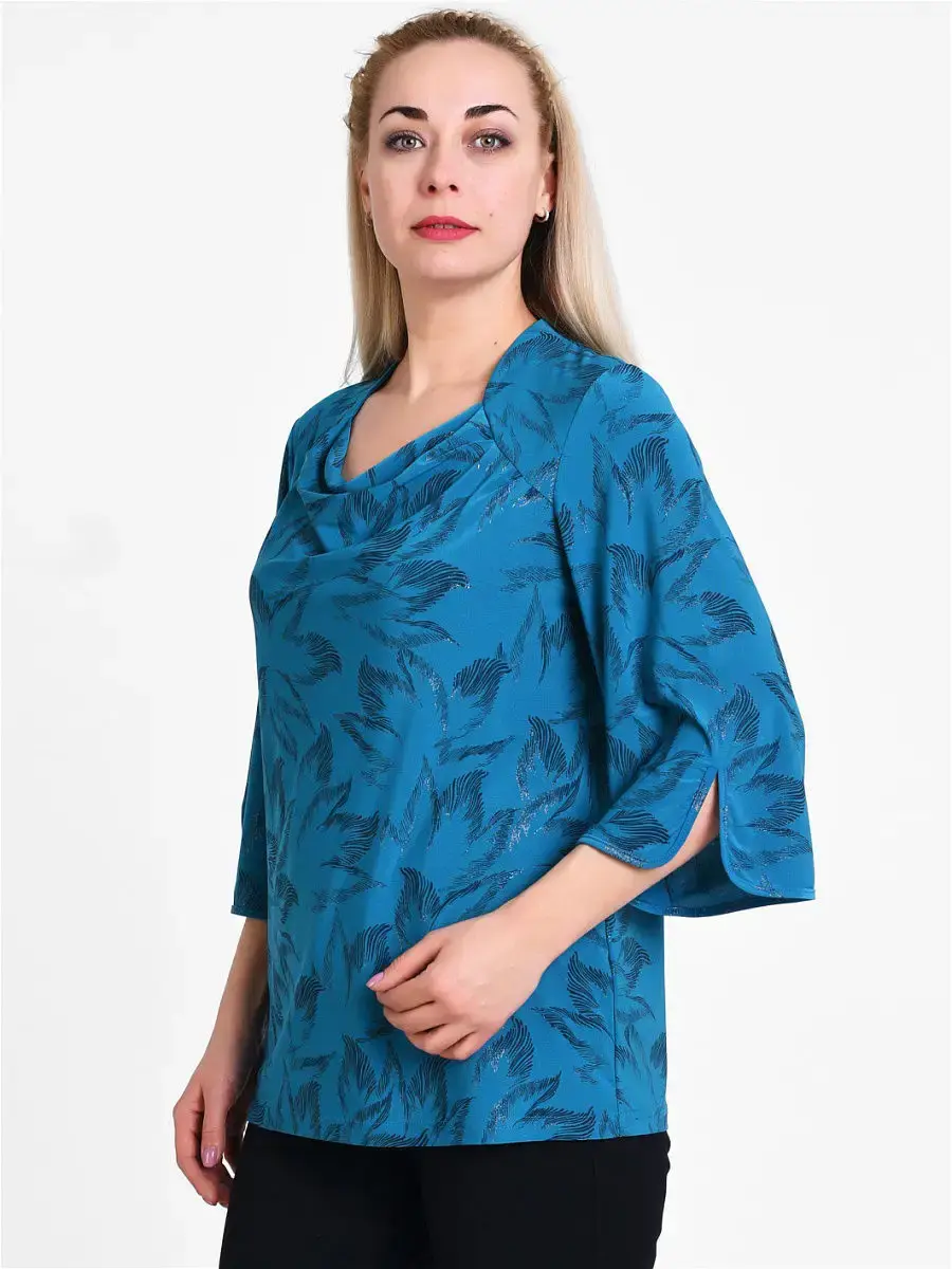 Элегантная блуза с набивным мерцающим рисунком, широкими у запястья рукавами с разрезами длиной 3/4, фантазийным воротником-водопад, соблазнительно приоткрывающим ключицы. Изделие выполнено из трикотажа-масло, который мягко обволакивает, но не обтягивает силуэт. Блуза подойдет как для торжественных случаев, так и для праздника в домашнем кругу. Длина изделия по спинке от 67см в р.48 до 72,5см в р.70, длина рукава 45см.