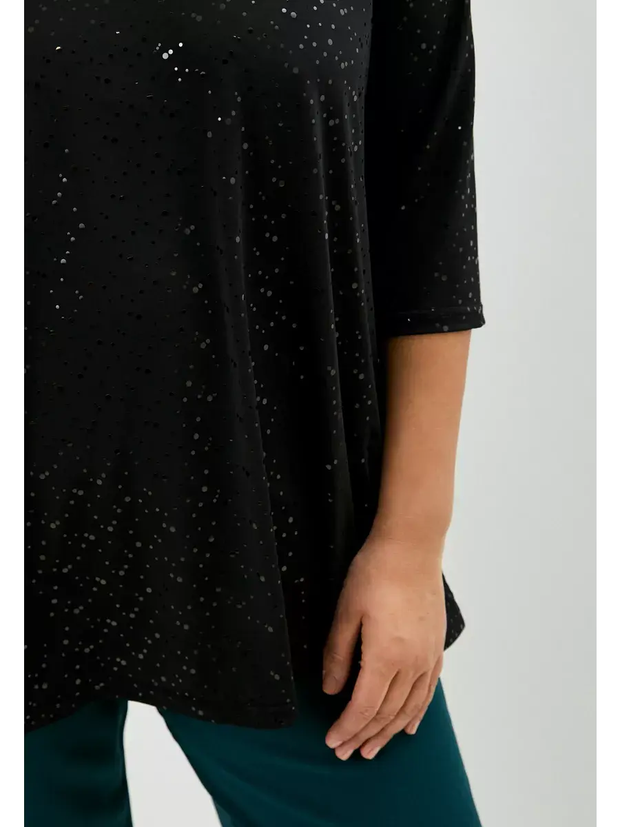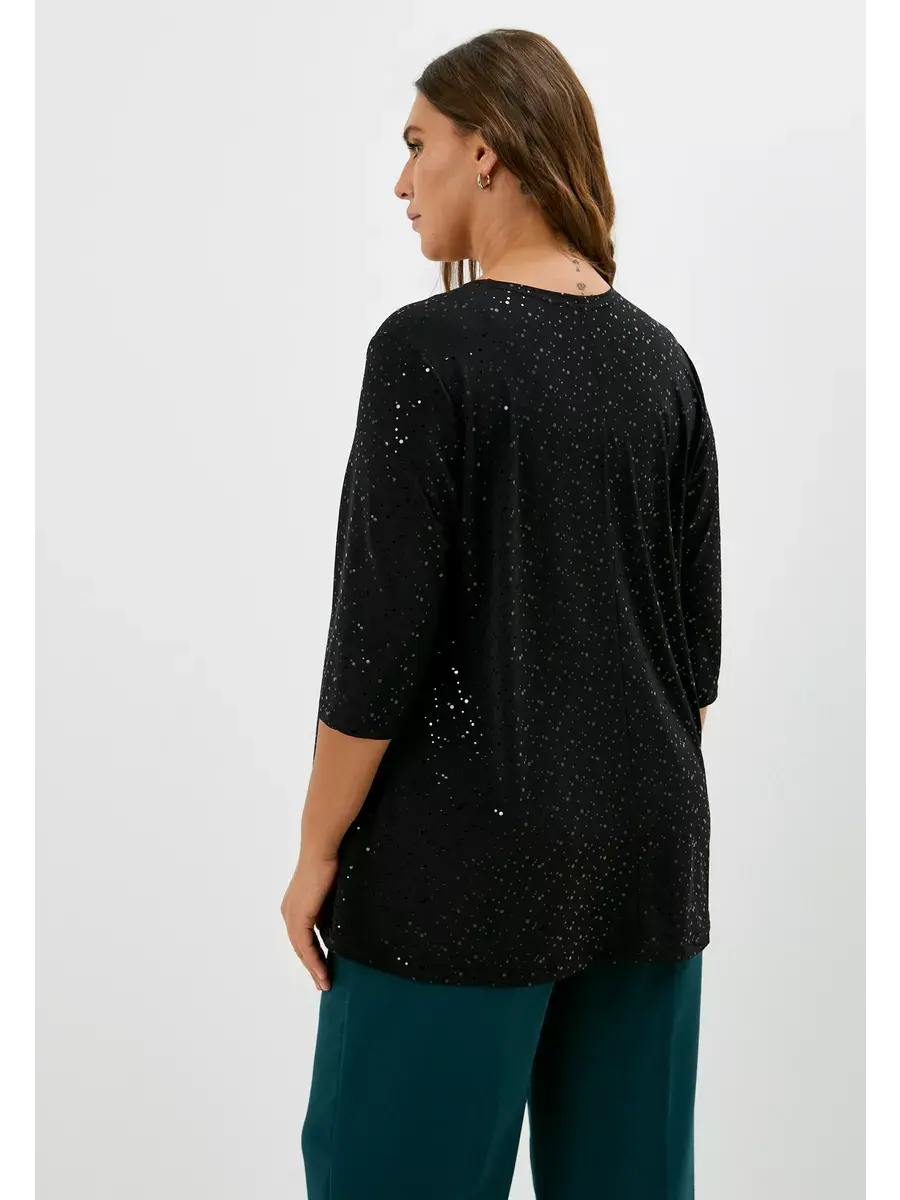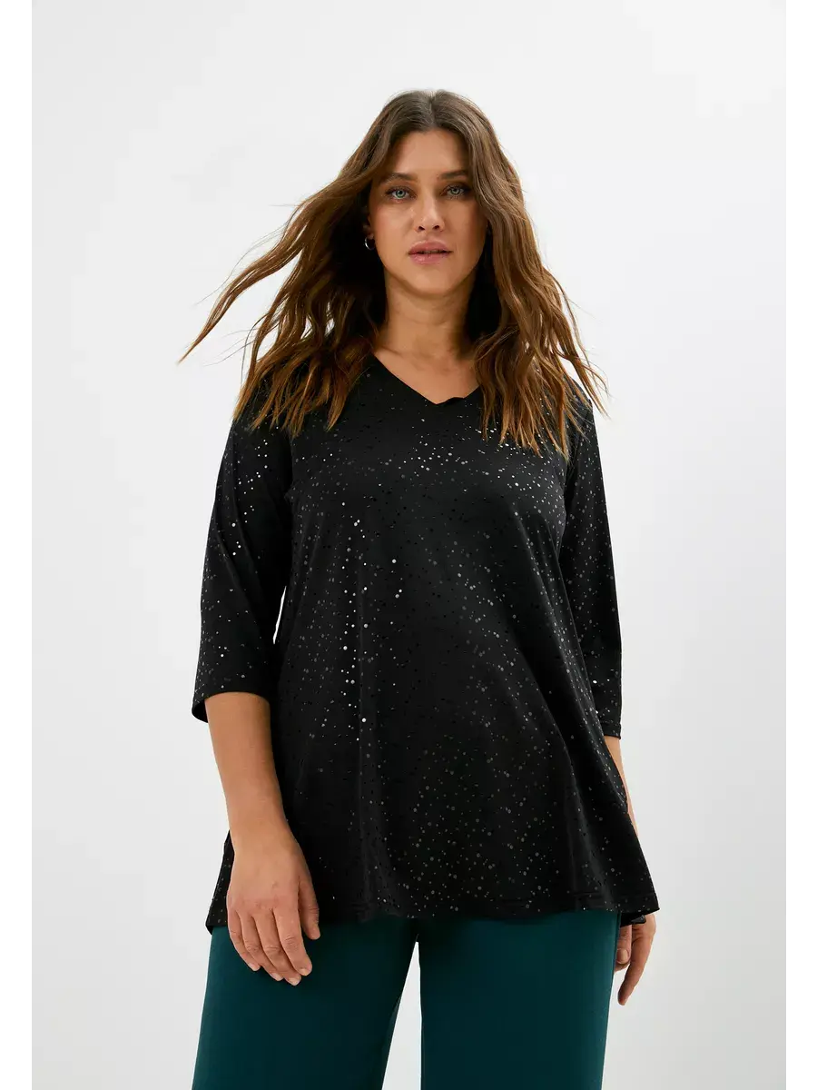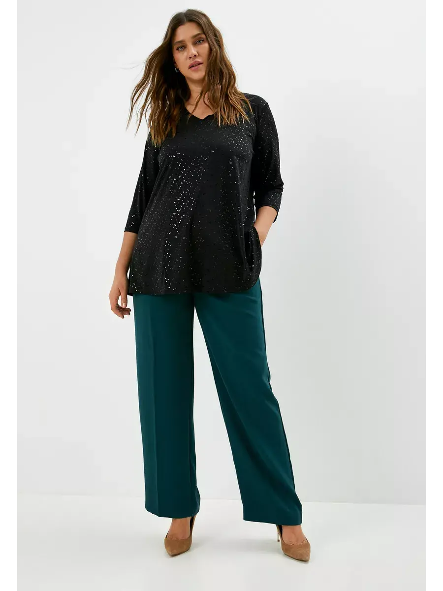 Нарядная туника больших размеров выполнена из трикотажного полотна масло с пайетками, V-образный вырез, рукав 3/4, расклешенная. Женская блузка праздничная имеет удлиненный силуэт. Нарядная блузка больших размеров с пайетками - в ней Вы будете блистать на любом мероприятии. Длина изделия по спинке:р.50-75см;р.52-76см;р.54-77см;р.56-77,5см;р.58-78,5см;р.60-79,5см;р.62-80см;р.64-81см;р.66-82см;р.68-83см;р.70-84см.Длина рукава во всех размерах 41см.