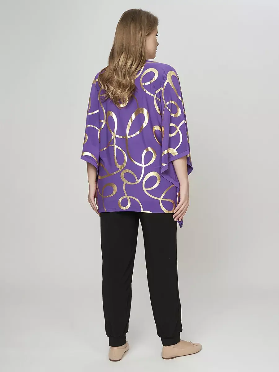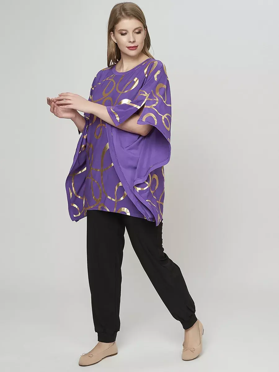 Нарядная праздничная блуза от бренда OLSI из струящегося трикотажа масло с блестящим принтом фойлом. Нарядная блузка летучая мышь. Идеально на праздник, вечернее мероприятие или Новый Год. Модель с округлым вырезом горловины; широкими цельнокроеными ассиметричными рукавами с разрезами на обшлагах, длиной 3/4, мягко переходящие в волнистые боковые швы. Свободный крой изделия придает ему сходство с накидкой, красиво обнажает руки и придает плавность движениям, визуально делает силуэт женственным и грациозным. Туника безупречно сядет на фигуру любого типа.