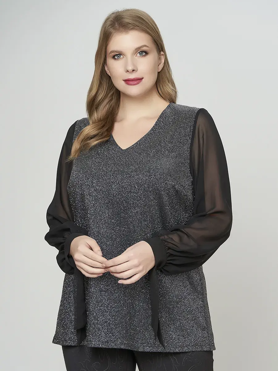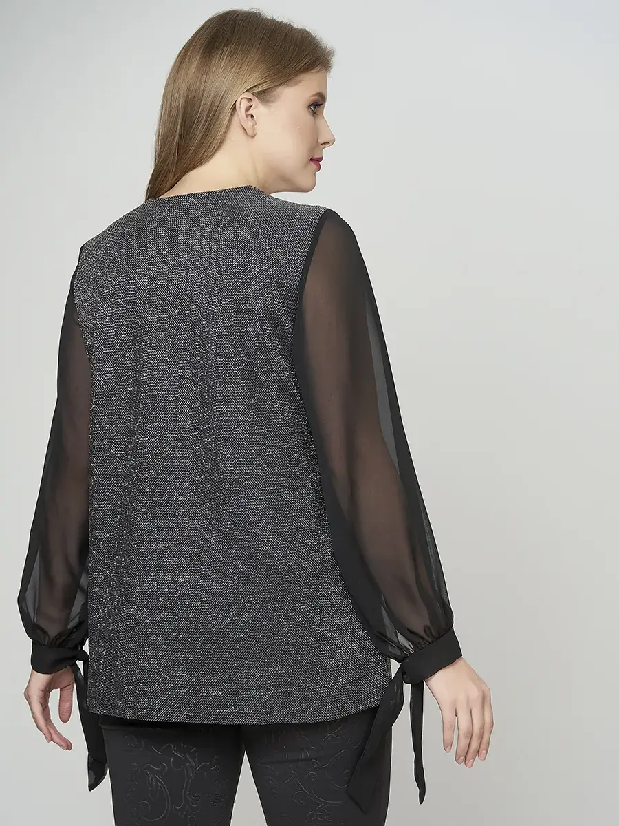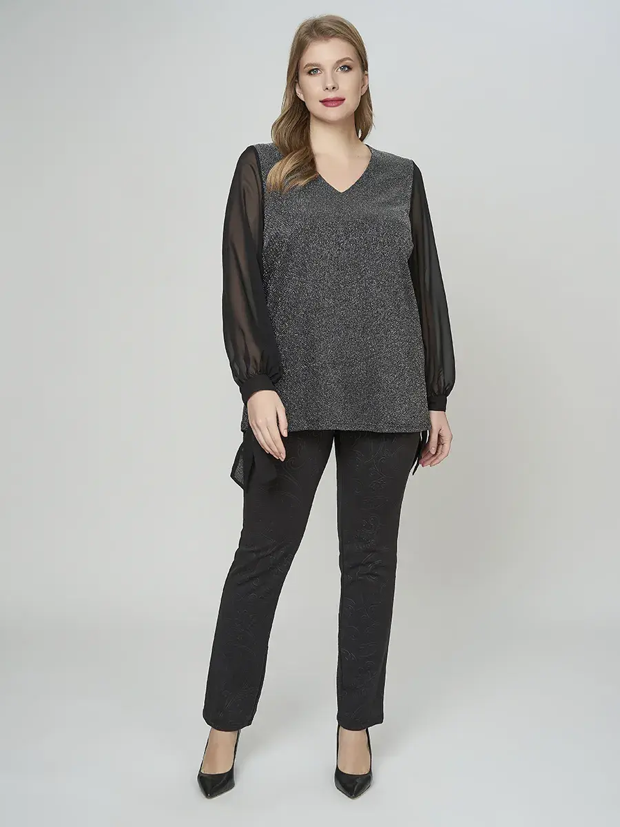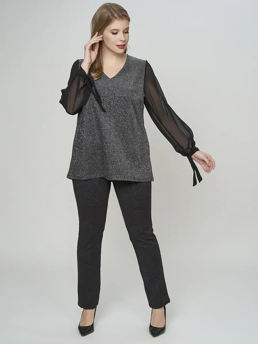 Элегантная нарядная туника, выполненная в комбинации блестящего трикотажа с люрексом и полупрозрачной ткани. Модель, чуть расклешенная книзу; с глубоким V-образным вырезом горловины, открывающим ключицы; втачными длинными рукавами-епископ из шифона, с завязывающимися на банты манжетами. Туника подчеркивает красоту рук и шеи, трикотаж со стрейчем корректирует несовершенство линий. Придает образу лоск и женственность.