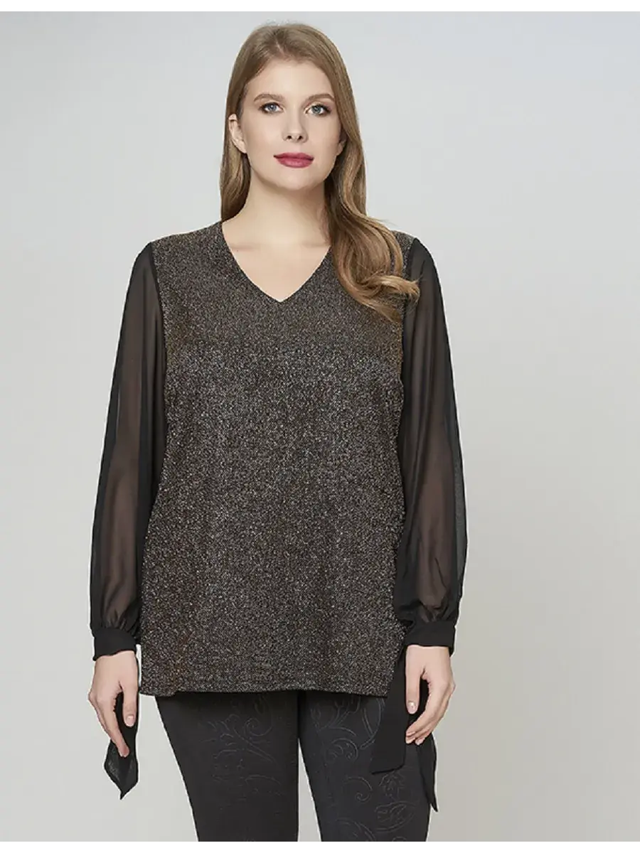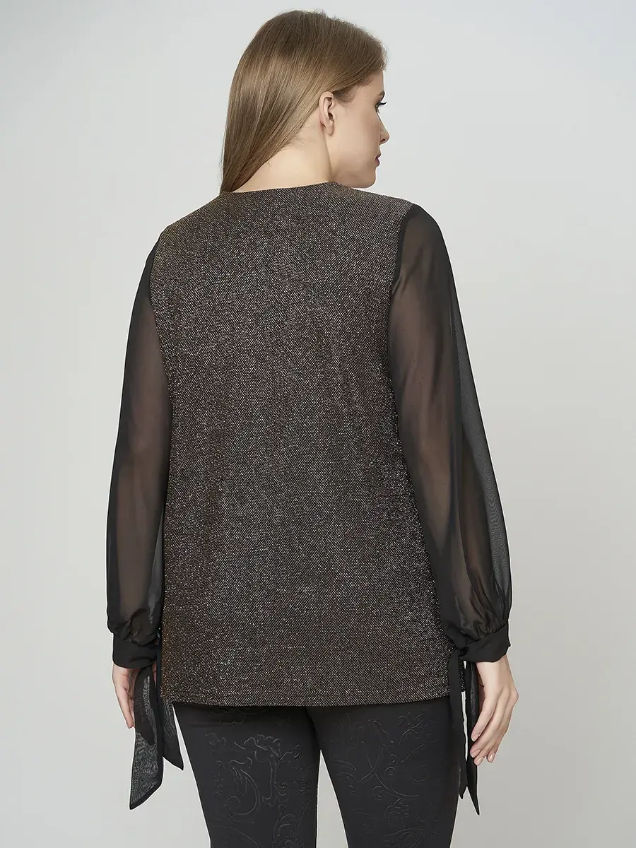 Элегантная нарядная туника, выполненная в комбинации блестящего трикотажа с люрексом и полупрозрачной ткани. Модель, чуть расклешенная книзу; с глубоким V-образным вырезом горловины, открывающим ключицы; втачными длинными рукавами-епископ из шифона, с завязывающимися на банты манжетами. Туника подчеркивает красоту рук и шеи, трикотаж со стрейчем корректирует несовершенство линий. Придает образу лоск и женственность.