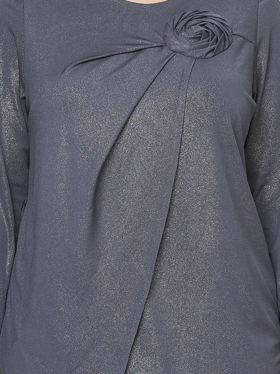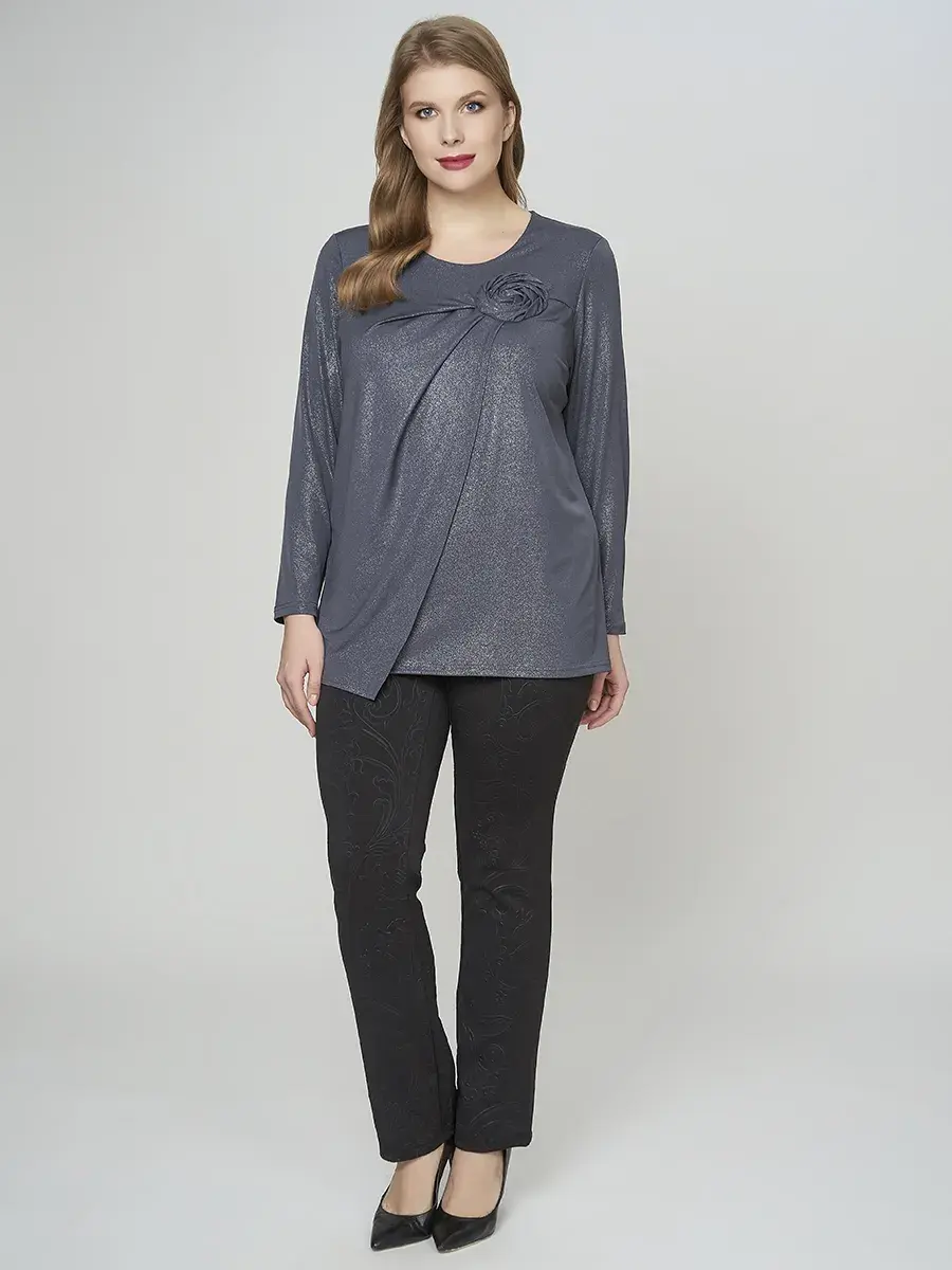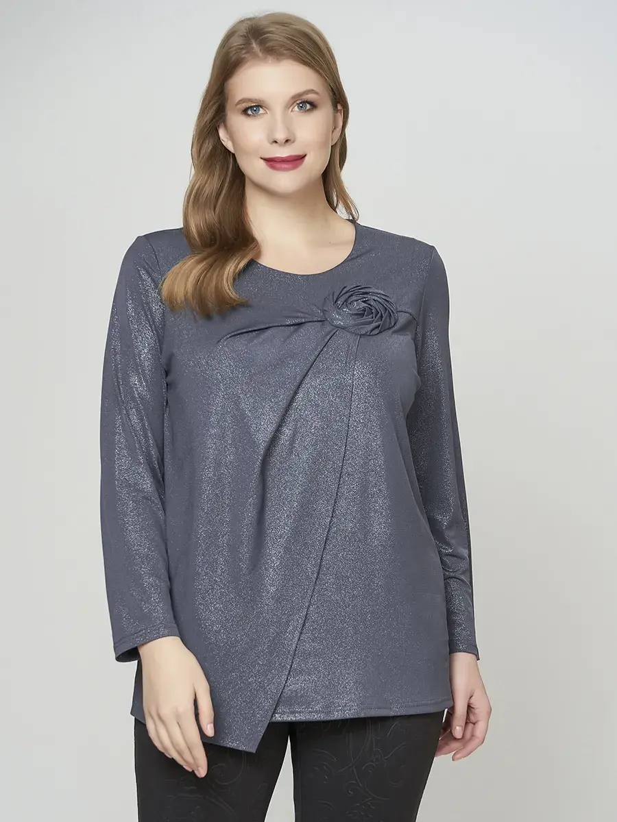 Нарядная блузка из блестящего трикотажа-масло с длинными рукавами и ассиметричным косым запахом спереди. Благодаря крою и декору модель выглядит празднично и благородно. Классическая круглая горловина подчеркивает линию шеи. Крупная текстильная роза, выступающая в качестве декоративной застежки, красиво драпирует ткань, акцентирует внимание на груди и красоте линии плеча. Длина изделия по спинке от 71,5см в р.48 до 77см в р.70, длина рукава 61см.