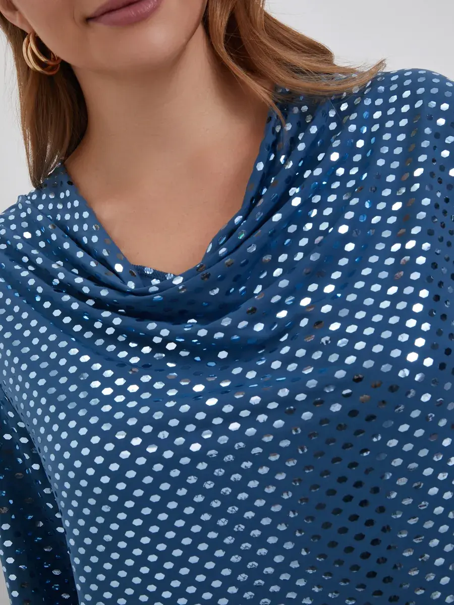 Благодаря пайеткам и приятной на ощупь ткани «масло», эта блуза идеально подходит для торжественных мероприятий, где вы будете в центре внимания: юбилеев, свадеб, новогодних корпоративов и свиданий.