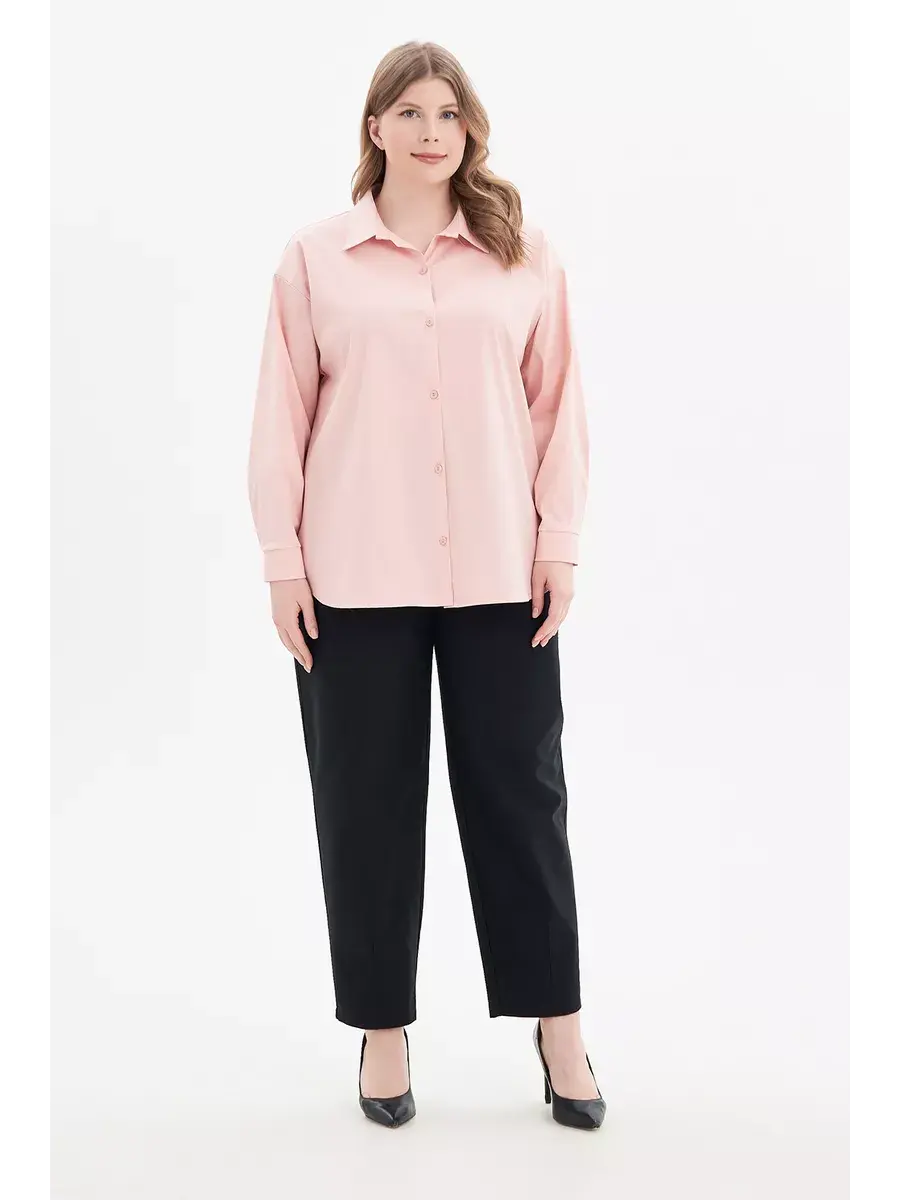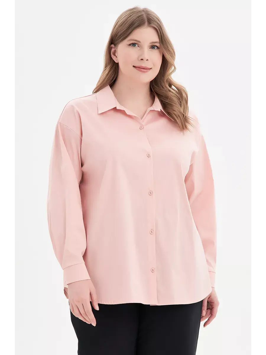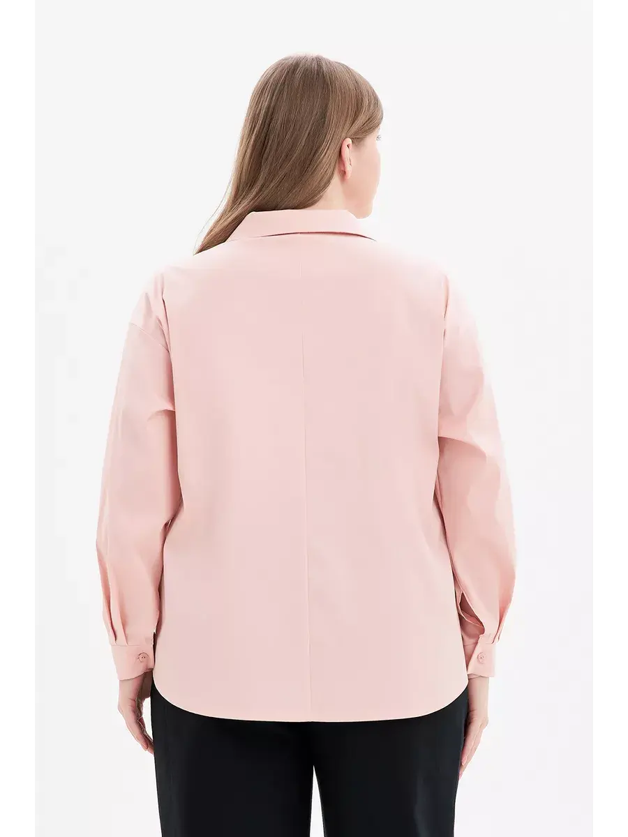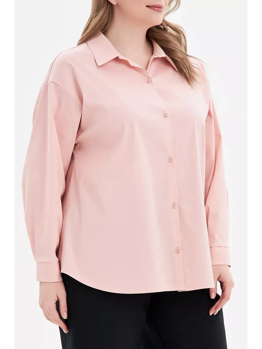 Женская блузка рубашка больших размеров от бренда OLSI прямого кроя с длинным рукавом, застёгивается на пуговицы, отложной воротник. Выполнена из хлопка с эластаном. Однотонная хлопковая рубашка свободного фасона - современная классика базового женского гардероба.