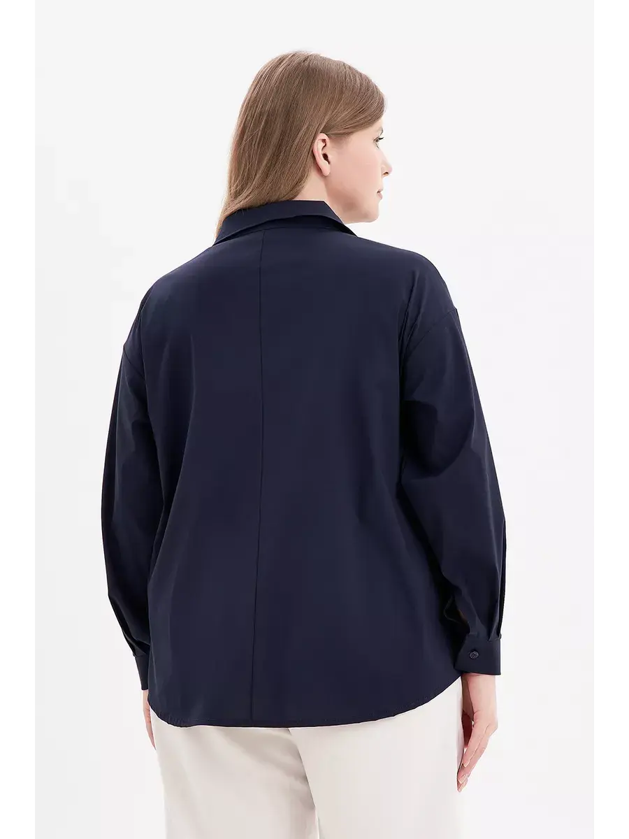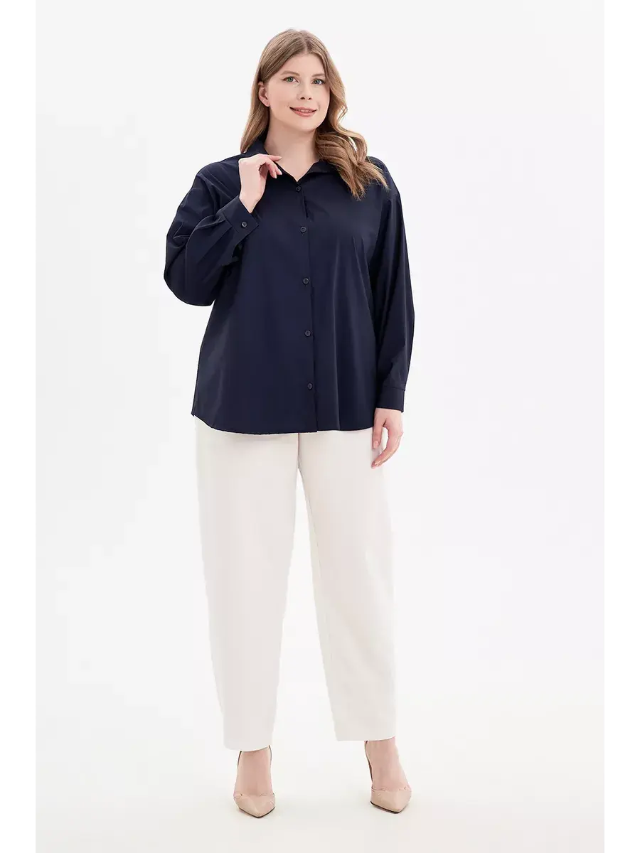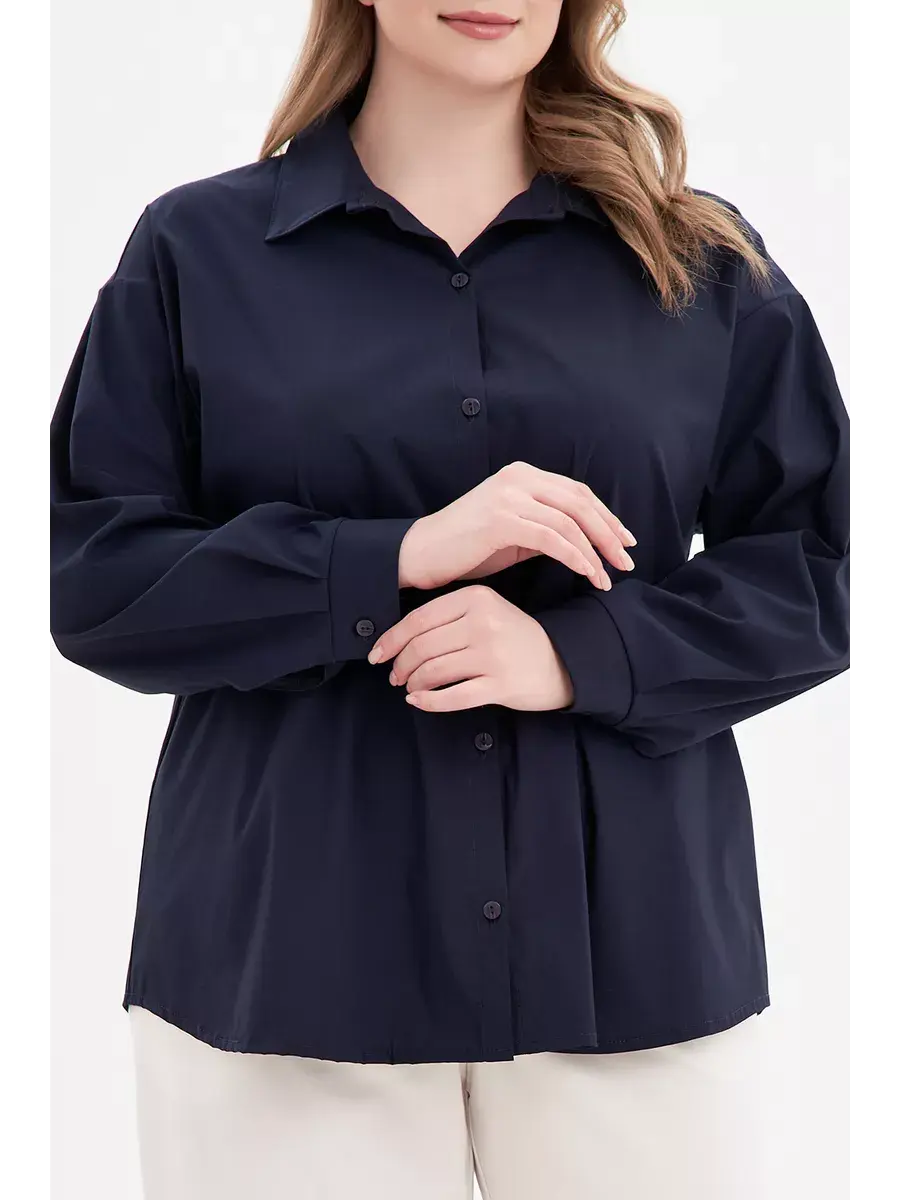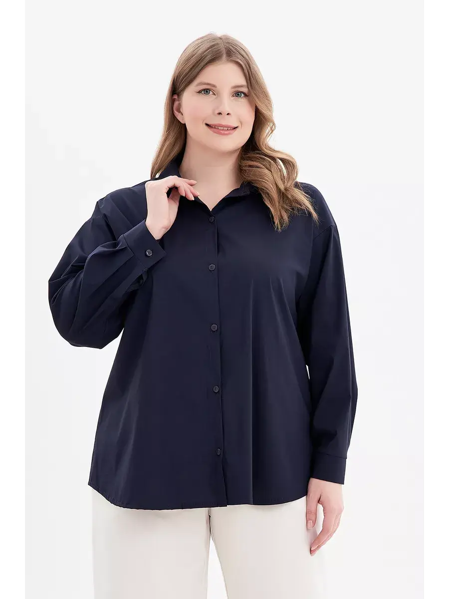 Женская блузка рубашка больших размеров от бренда OLSI прямого кроя с длинным рукавом, застёгивается на пуговицы, отложной воротник. Выполнена из хлопка с эластаном. Однотонная хлопковая рубашка свободного фасона - современная классика базового женского гардероба.