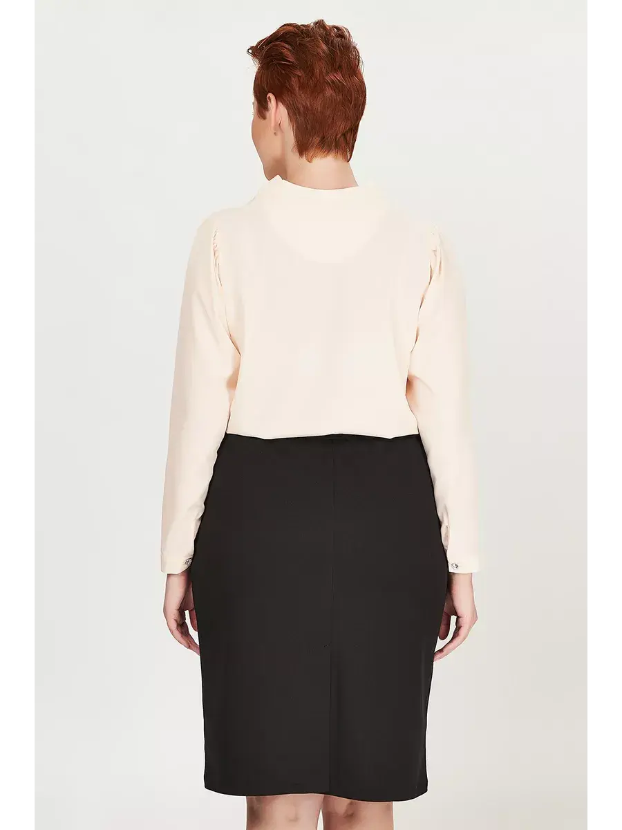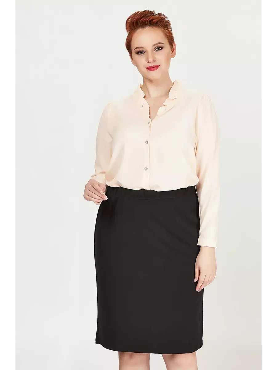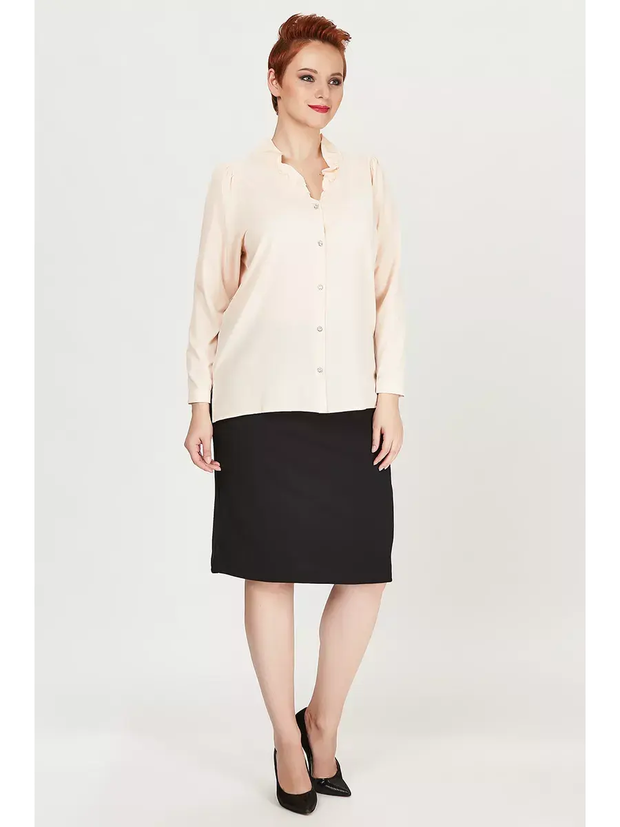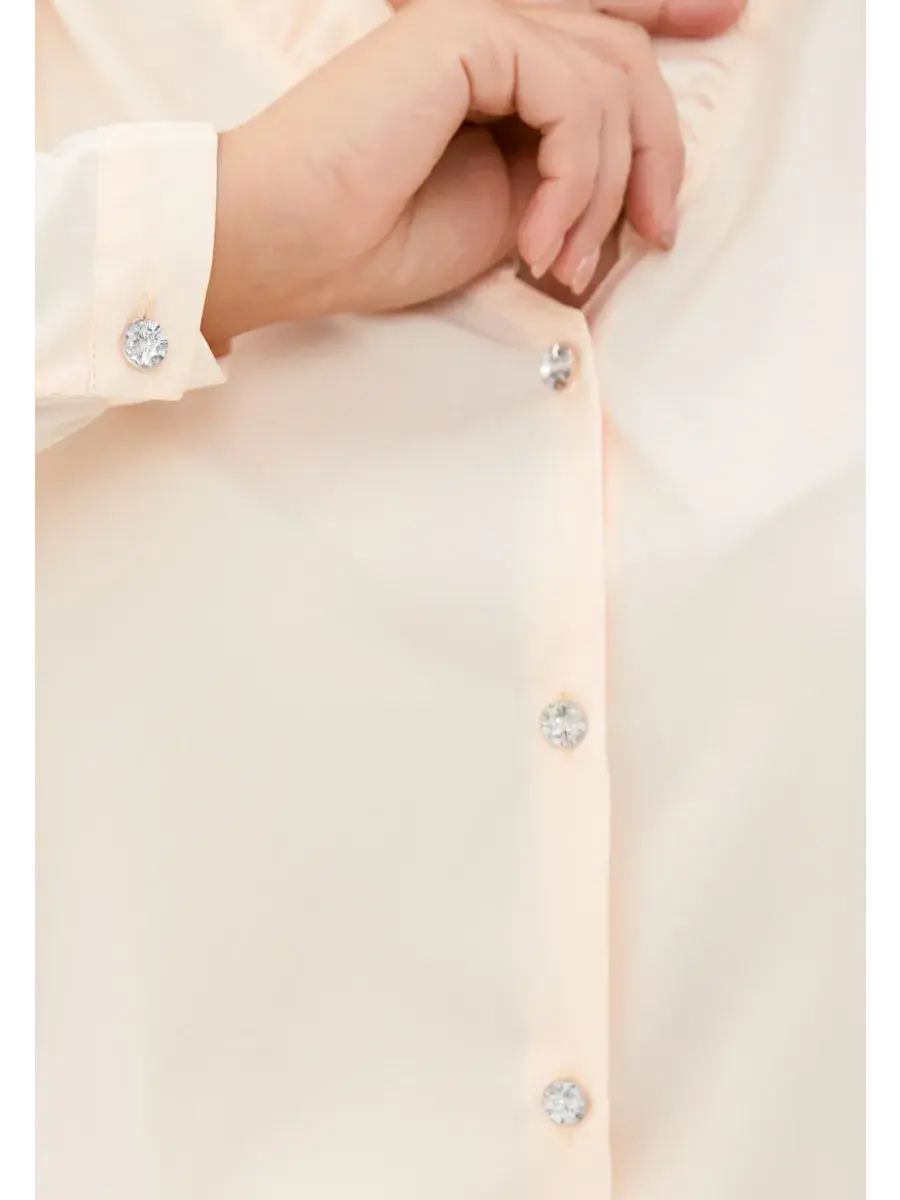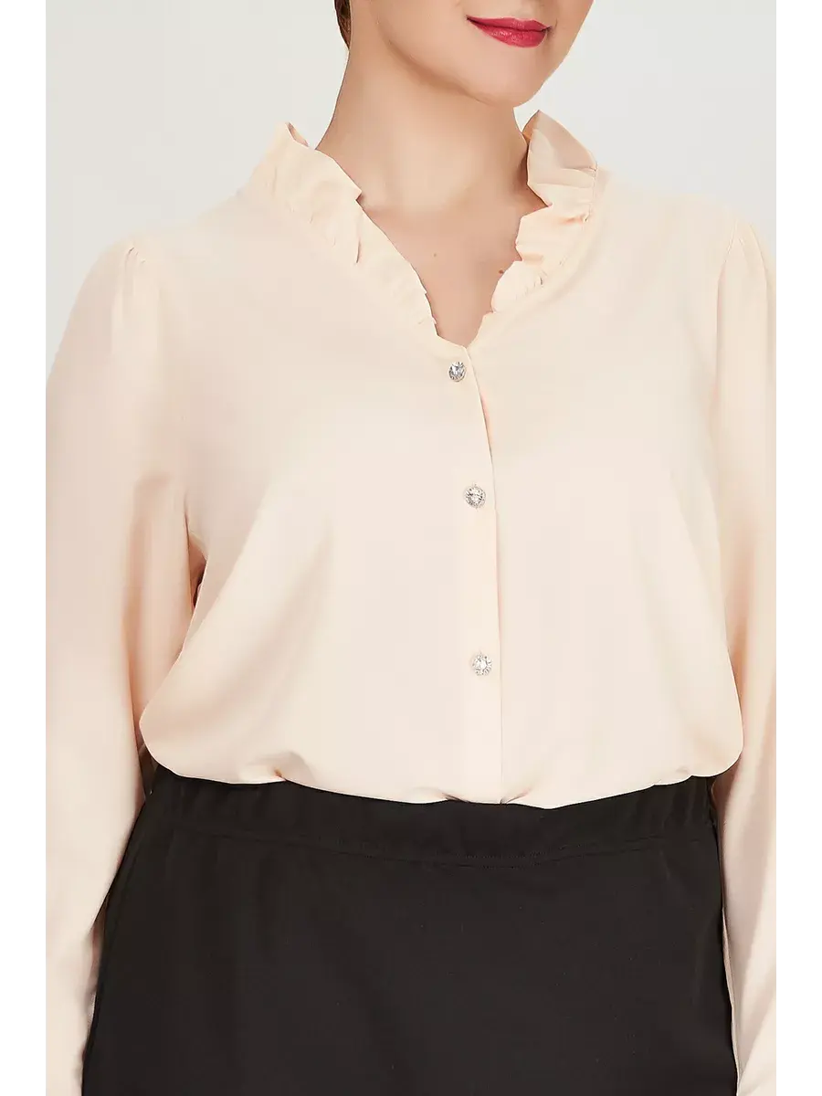 Элегантная блузка на потайной французской планке, с длинными, присборенными у плеча, рукавами-паж. Модель подойдет романтичным и чувственным натурам. V- образная горловина, отделанная рюшами, придает образу легкую ветреность, акцентирует внимание на линии шеи. Пуговицы-стразы на застежке, перекликаясь со стразами на манжетах, создают праздничный вид. Длина изделия по спинке от 67см в р.48 до 72,5см в р.70, длина рукава 62см.