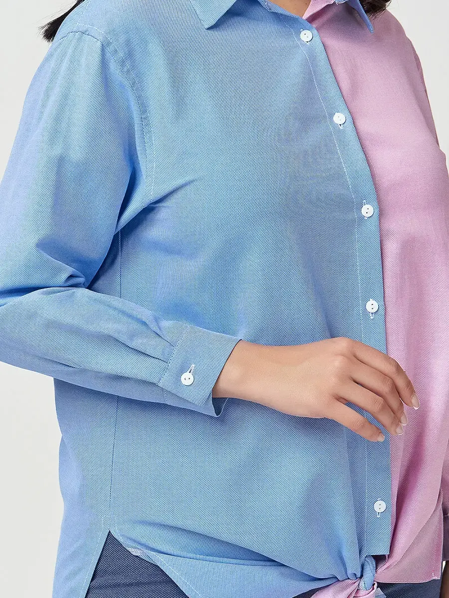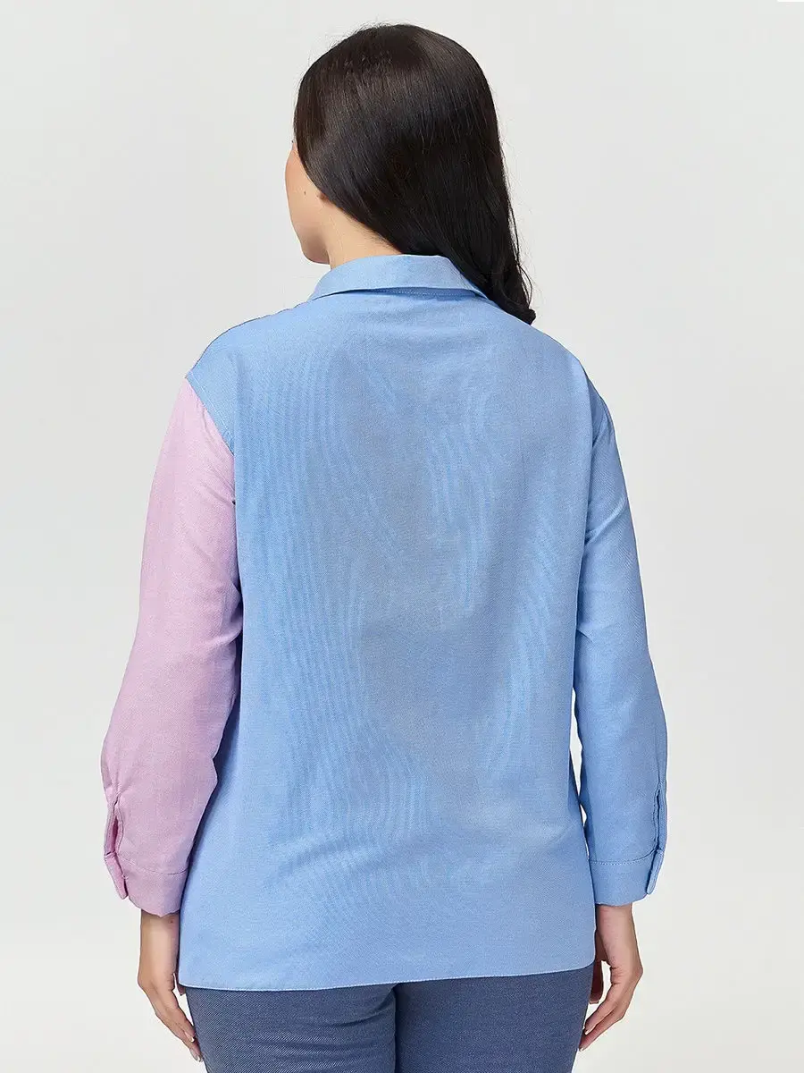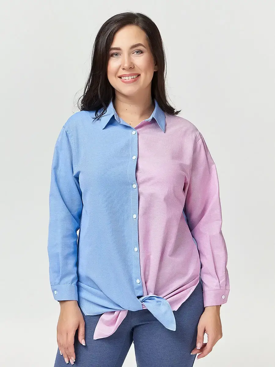 Блузка женская больших размеров, из цветной ткани оксфорд. Спинка разрезная, перед цельнокроеный с односторонними складками. Часть горловины со складками обработана обтачкой, оставшаяся часть переда и спинки обработана кантом, длинный рукав. Длина изделия по спинке от 70см в р.48 до 75,5см в р.70, длина рукава 62см.