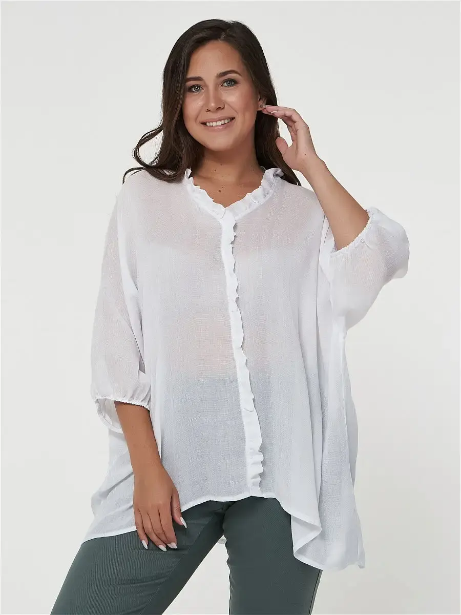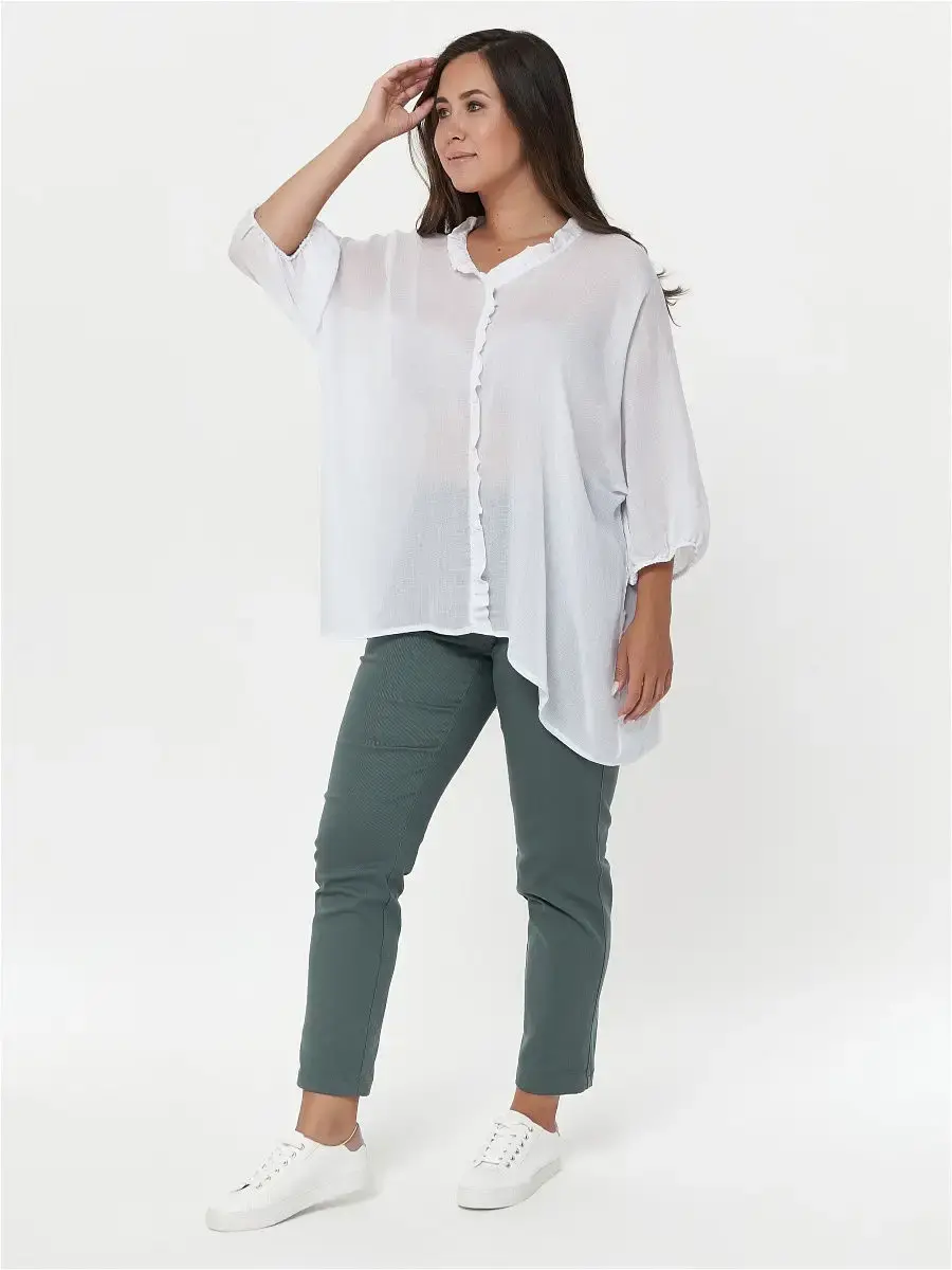 Женская повседневная блузка, свободного покроя, выполнена из однотонной хлопчатобумажной ткани. Перед и спинка с цельнокроеным рукавом. Низ рукава оформлен сборкой на резинку. Перед разрезной по центру, шов и горловина обработаны рюшами. Низ изделия фигурный. Длина изделия по спинке от 75,5см в р.48 до 81см в р.70, длина рукава 45см.