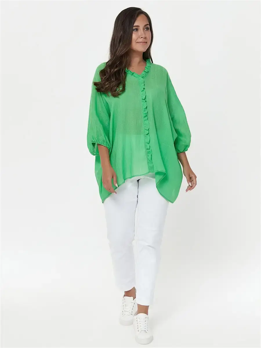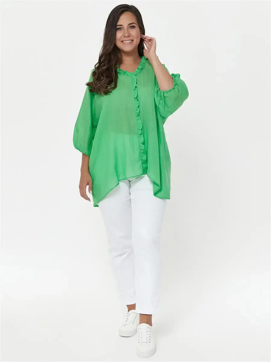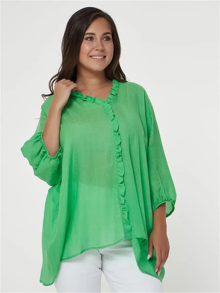 Женская повседневная блузка, свободного покроя, выполнена из однотонной хлопчатобумажной ткани. Перед и спинка с цельнокроеным рукавом. Низ рукава оформлен сборкой на резинку. Перед разрезной по центру, шов и горловина обработаны рюшами. Низ изделия фигурный. Длина изделия по спинке от 75,5см в р.48 до 81см в р.70, длина рукава 45см.