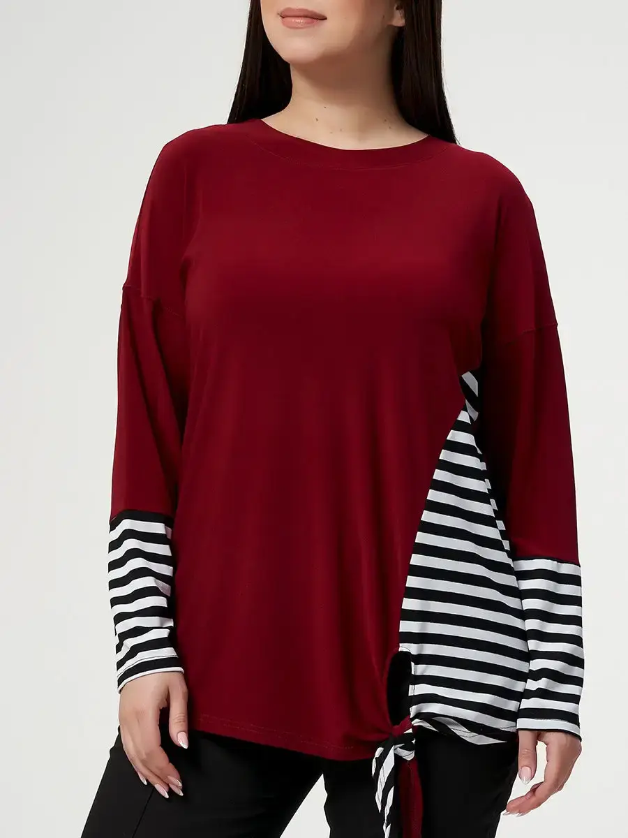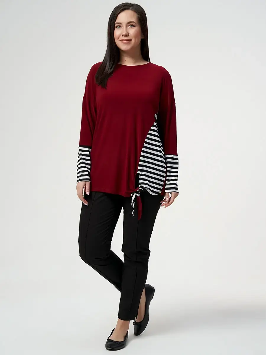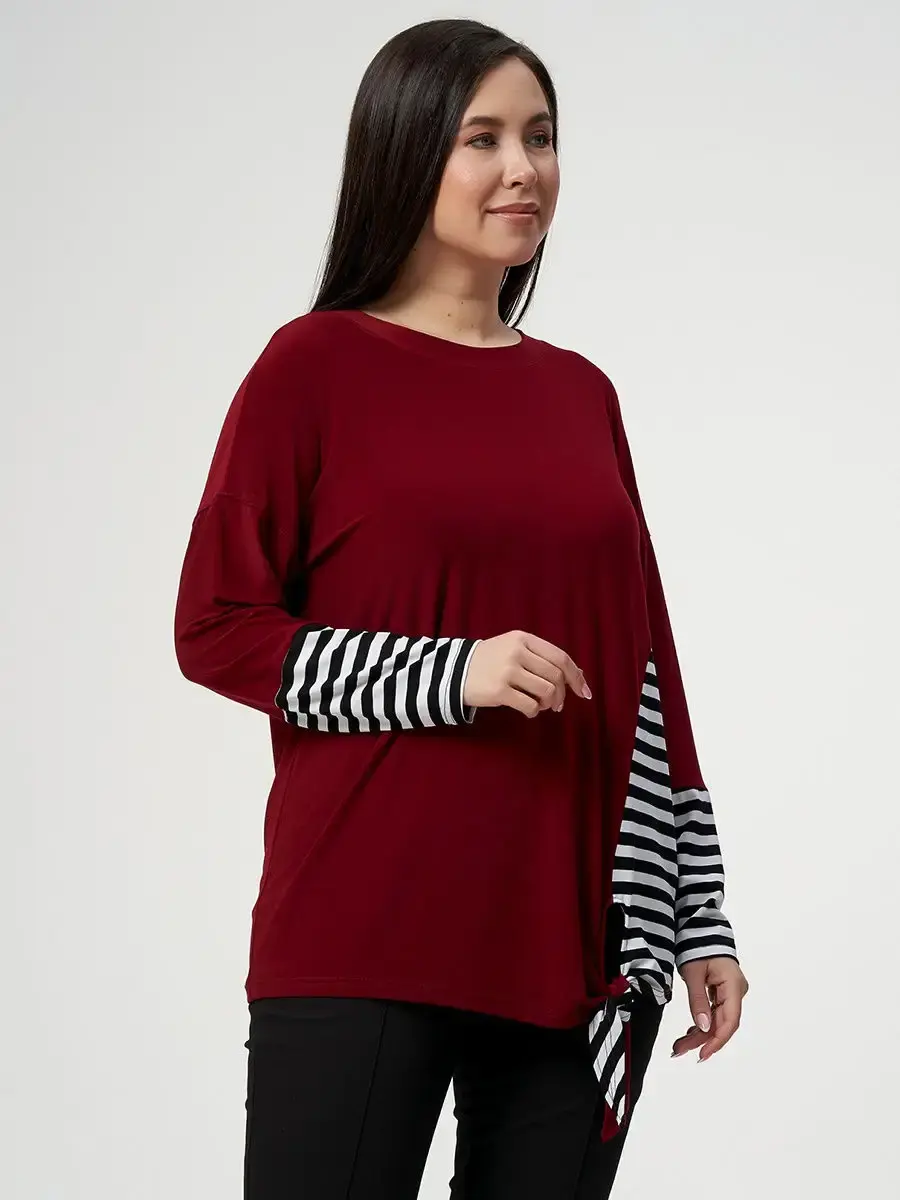 Женская повседневная блузка, свободного покроя, выполненная из комбинации однотонного трикотажа и трикотажной ткани в полоску. Перед асимметричный с отрезным бочком, выполненный из отделочной ткани в полоску. Низ переда с декоративным узлом. Спинка со средним швом. Рукав одношовный рубашечный, состоящий из двух частей. Нижняя часть рукава выполнена из декоративной ткани в полоску. Длина изделия ниже бёдер. Длина изделия по спинке от 72см в р.48 до 77,5см в р.70, длина рукава 60см.