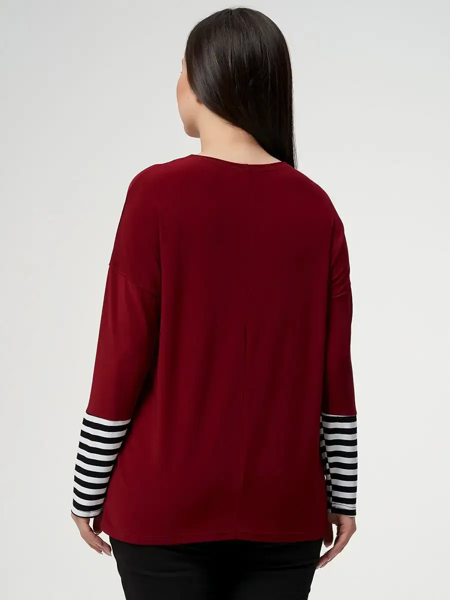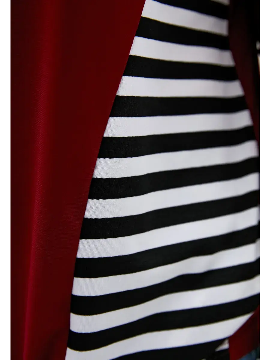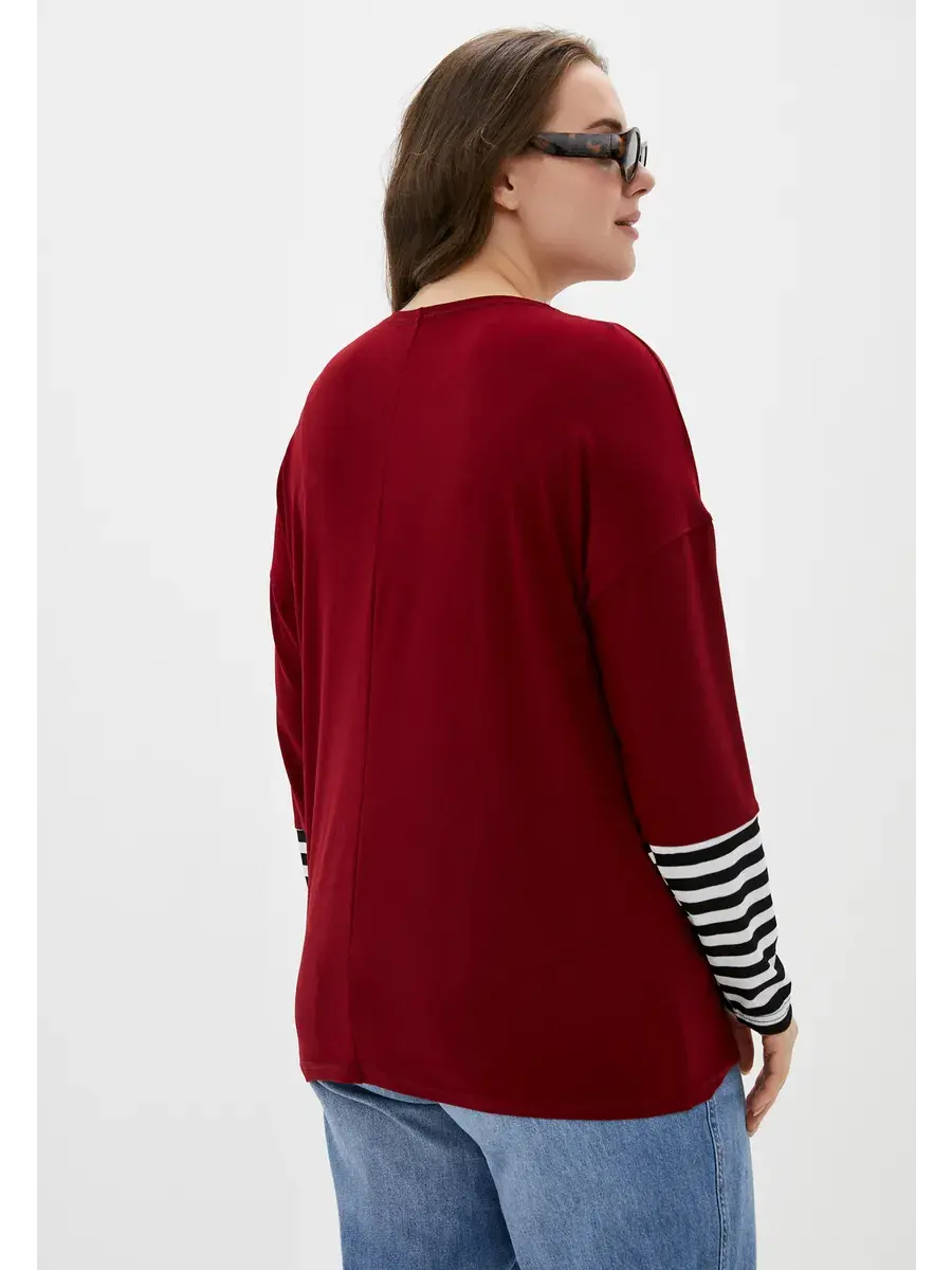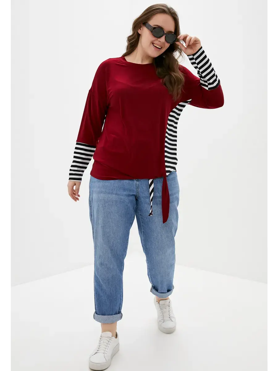 Женская повседневная блузка, свободного покроя, выполненная из комбинации однотонного трикотажа и трикотажной ткани в полоску. Перед асимметричный с отрезным бочком, выполненный из отделочной ткани в полоску. Низ переда с декоративным узлом. Спинка со средним швом. Рукав одношовный рубашечный, состоящий из двух частей. Нижняя часть рукава выполнена из декоративной ткани в полоску. Длина изделия ниже бёдер. Длина изделия по спинке от 72см в р.48 до 77,5см в р.70, длина рукава 60см.