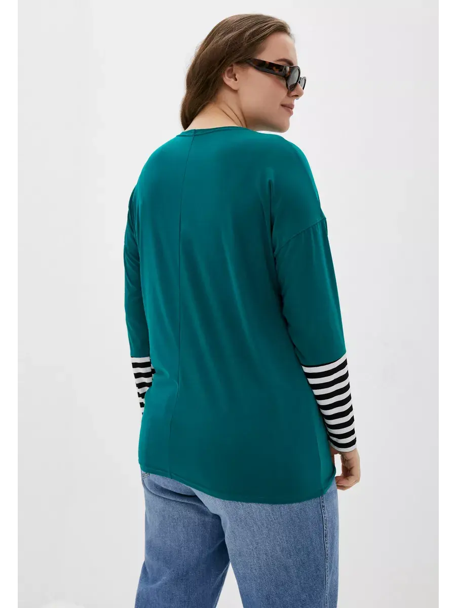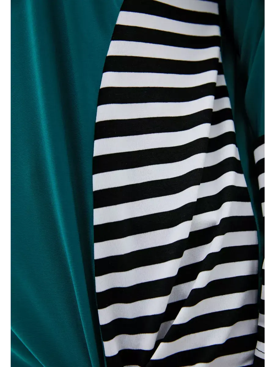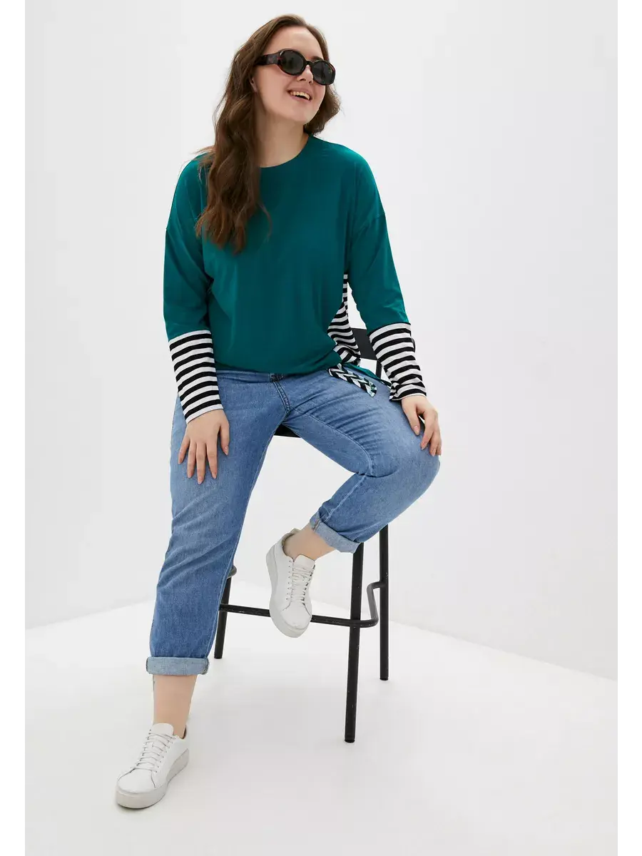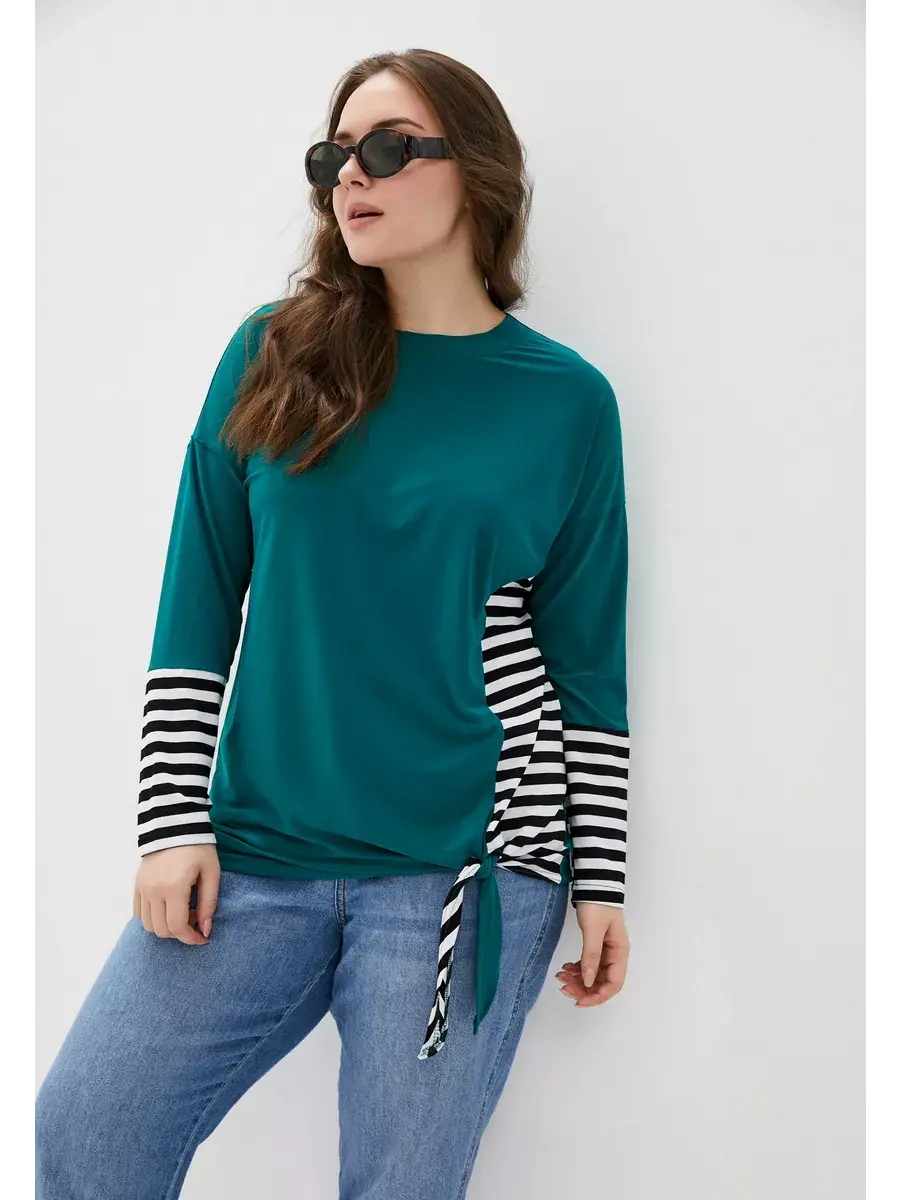 Женская повседневная блузка, свободного покроя, выполненная из комбинации однотонного трикотажа и трикотажной ткани в полоску. Перед асимметричный с отрезным бочком, выполненный из отделочной ткани в полоску. Низ переда с декоративным узлом. Спинка со средним швом. Рукав одношовный рубашечный, состоящий из двух частей. Нижняя часть рукава выполнена из декоративной ткани в полоску. Длина изделия ниже бёдер. Длина изделия по спинке от 72см в р.48 до 77,5см в р.70, длина рукава 60см.