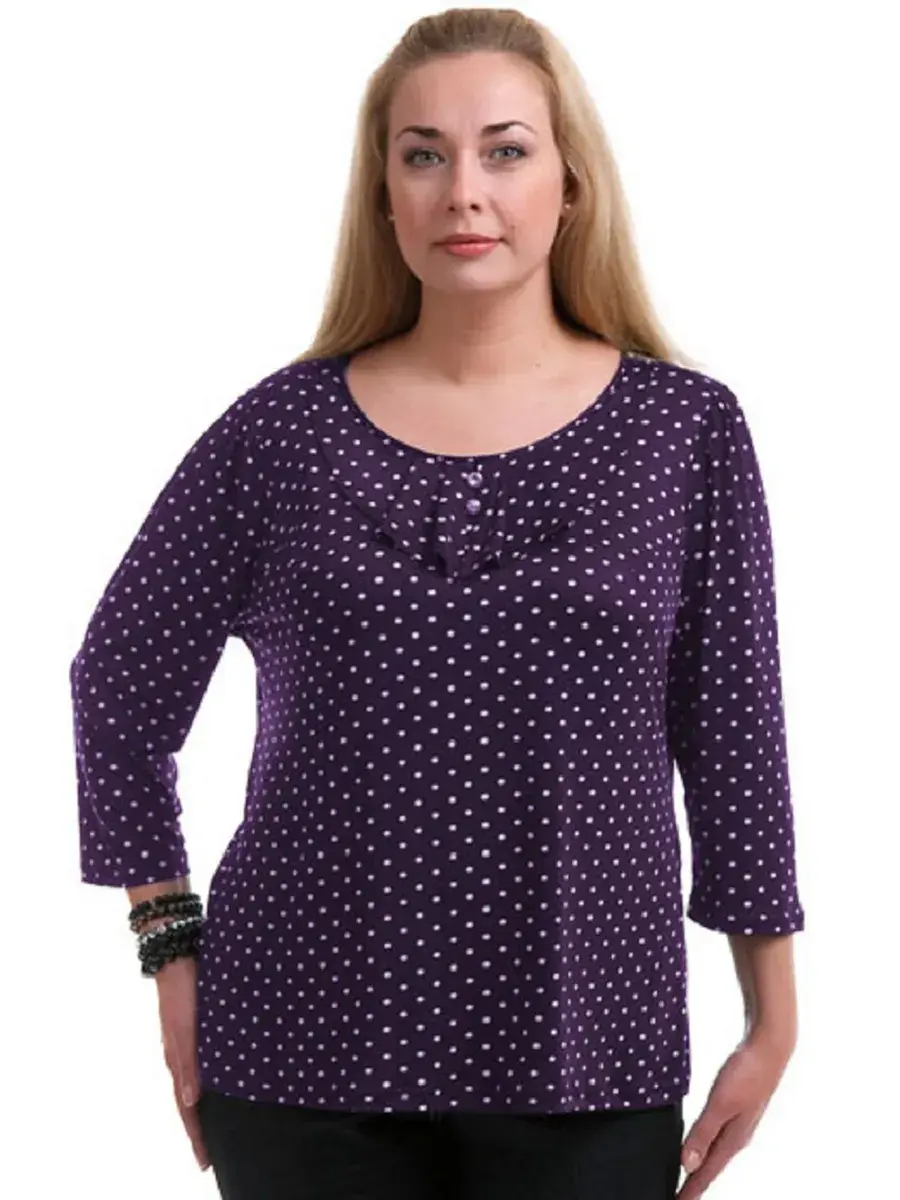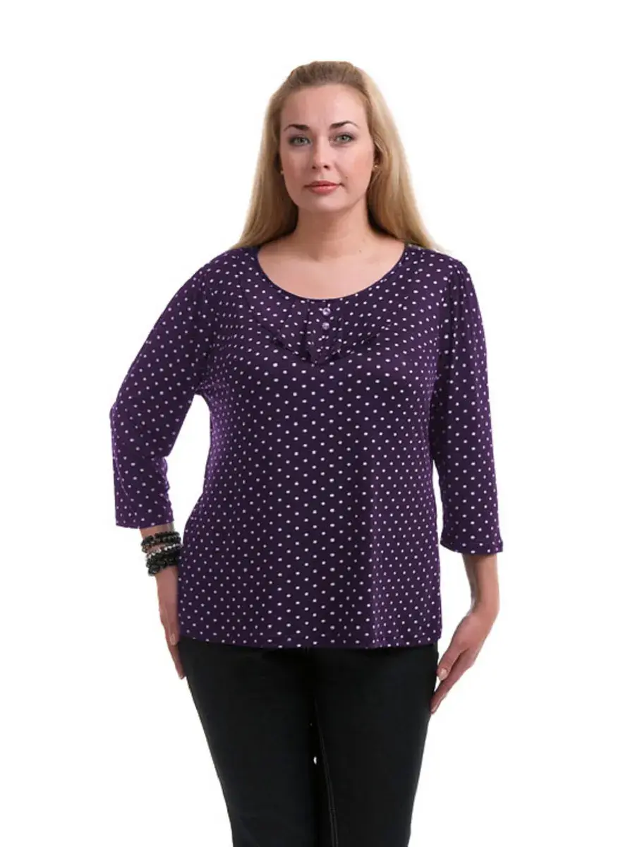 Блузка OLSI в сиреневом цвете с очаровательным принтом в горошек станет стильным дополнением к вашему гардеробу. Эта модель, выполненная из мягкой трикотажной ткани с добавлением эластана, обеспечивает комфорт и свободу движений. Прямой покрой и отсутствие застежки создают лаконичный и элегантный силуэт, подходящий как для офиса, так и для повседневных прогулок. Оборки на рукавах 3/4 придают блузке женственность и романтичность. Благодаря своей универсальности, блузка OLSI станет незаменимой вещью для создания разнообразных образов. Модель представлена в широкой размерной сетке, включая большие размеры, что позволит каждой женщине найти свой идеальный вариант.