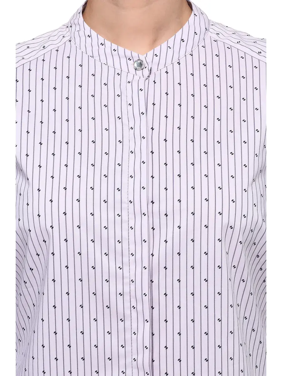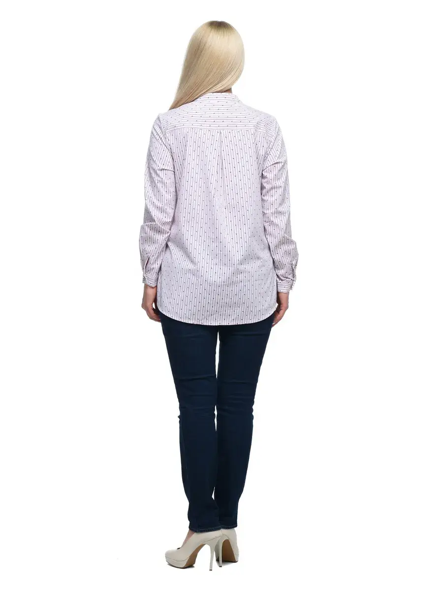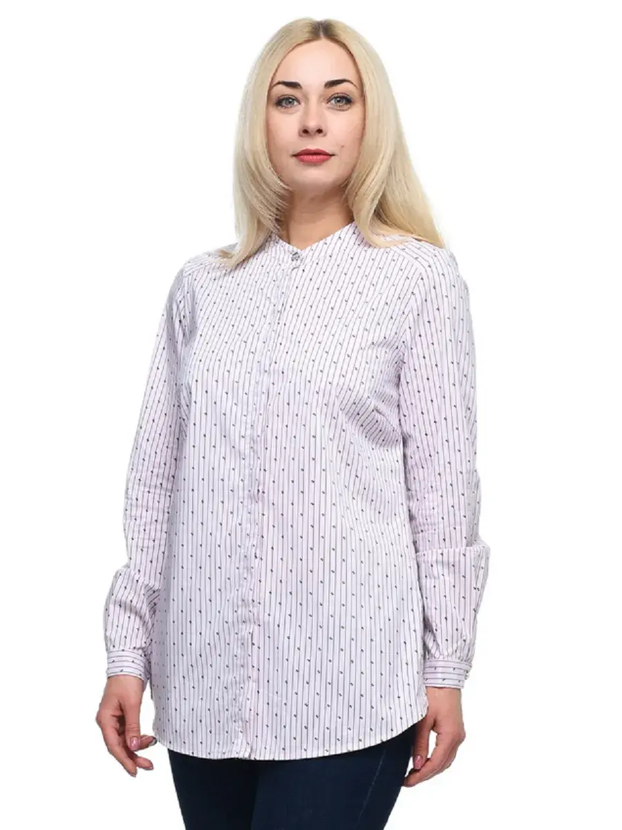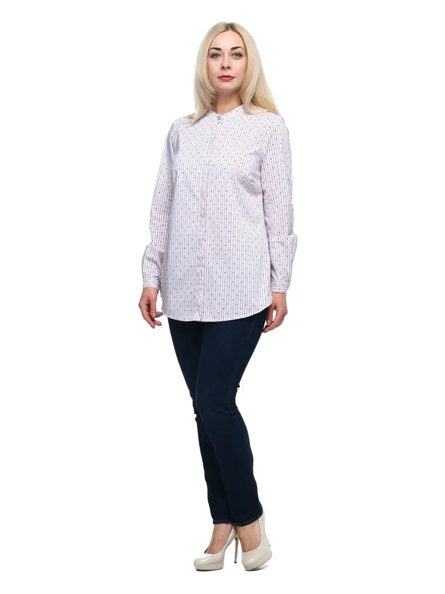 Стильная блузка-рубашка из хлопка в вертикальную полоску и мелким принтом. Модель без воротника, с потайной застежкой на планке, декоративной пуговицей-стразом под горлом и на манжетах длинных рукавов. Спинка модели на кокетке со встречной планкой. Крой и расцветка визуально стройнят фигуру, задают деловой тон. Декоративные элементы смягчают образ, делают его более нарядным и женственным.