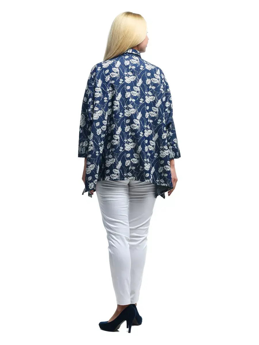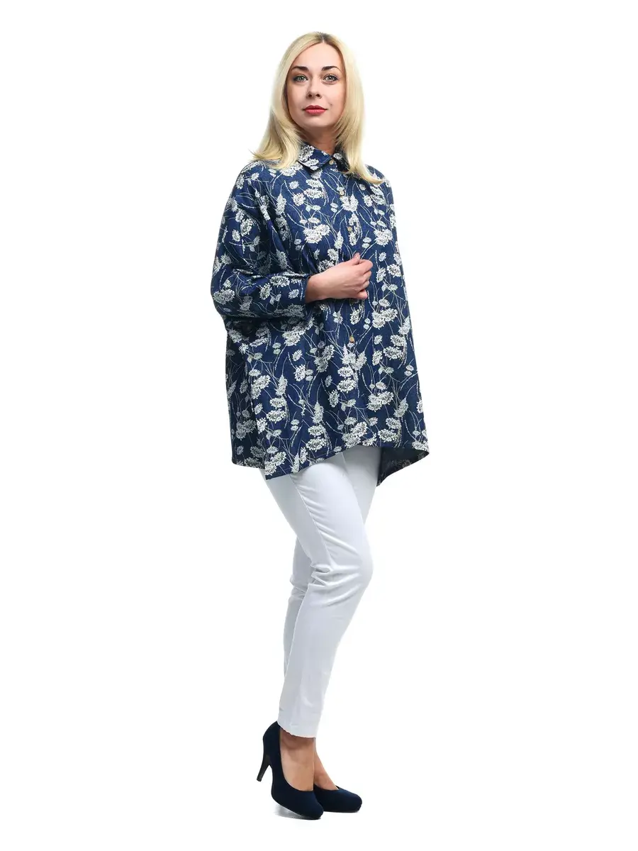 Модная блузка-рубашка из хлопковой дышащей ткани, напоминающей деним. Модель свободного A-силуэта, с асимметричным низом, длинными рукавами на широких манжетах с двумя пуговицами, воротником-спрэдом и рубашечной застежкой на планке. Сочетание женственного силуэта модели и классических для джинсовой рубашки деталей, придает образу индивидуальность. А крой позволяет скрыть несовершенства фигуры.