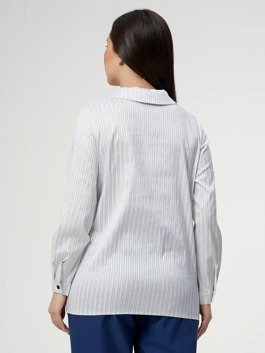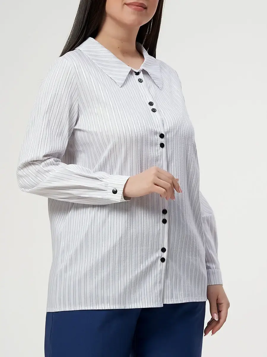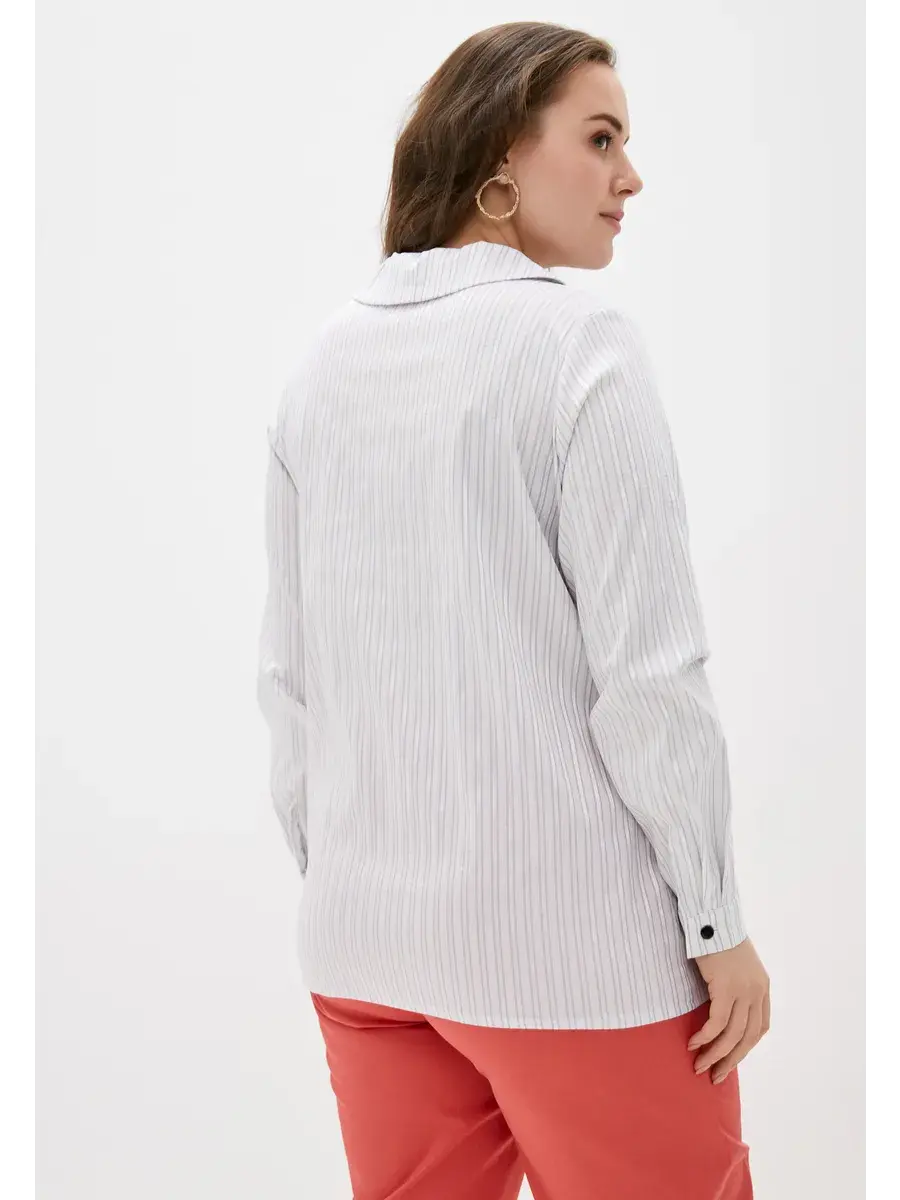 Блузка прямого силуэта свободной формы из ткани в полоску, фурнитура-пуговицы. Блузка с центральной бортовой застёжкой на 6 прорезных петель-пуговиц. Воротник стояче-отложной, отлёт воротника с острыми концами. Рукав втачной однородный, низ рукава оформлен манжетой с разрезом, на манжете одна прорезнаягоризонтальная петля и пуговица. Отделка: декоративные пуговицы на планке. Длина по спинке от 70 см в р.48 до 75,5 см в р.70
