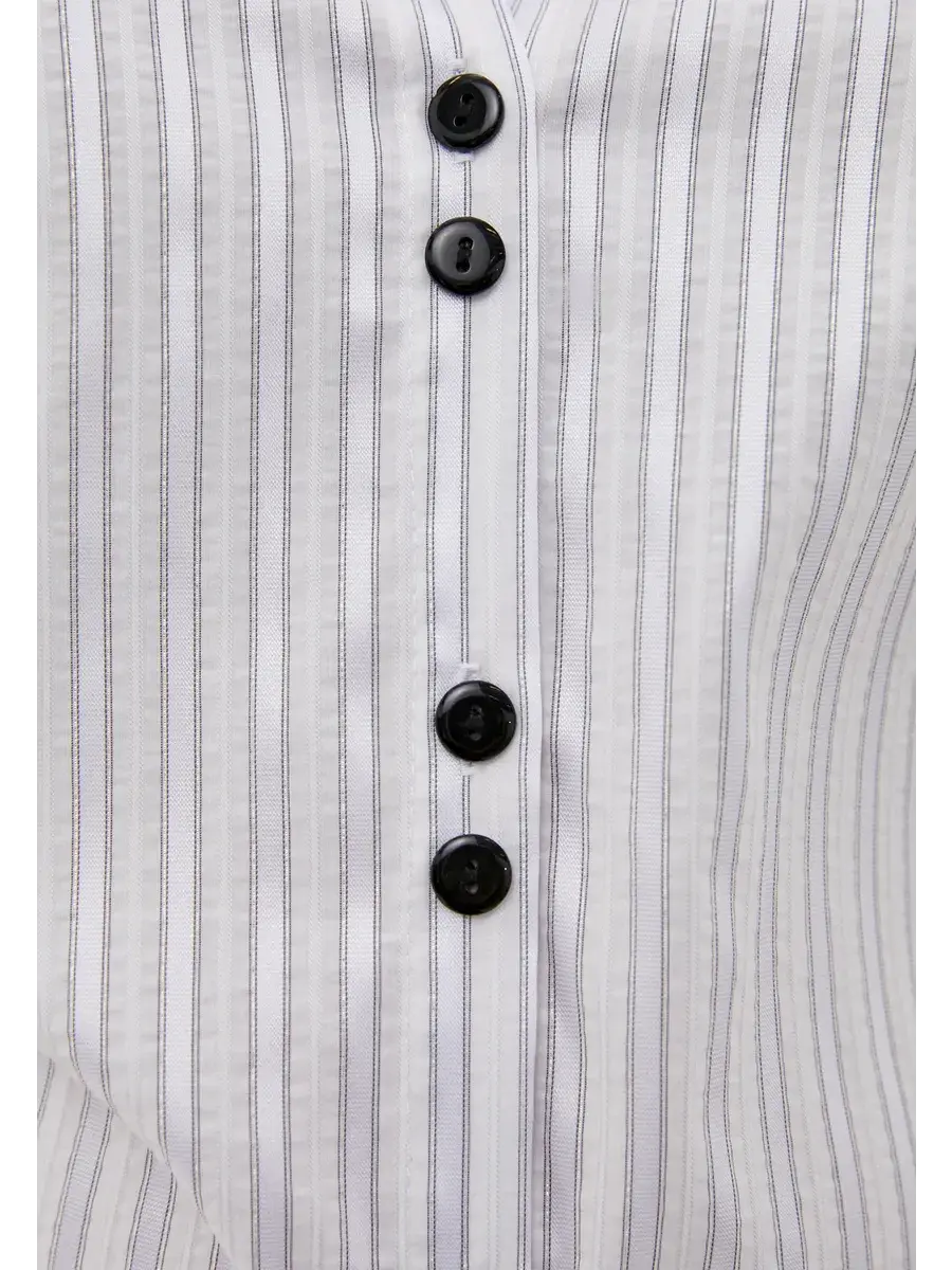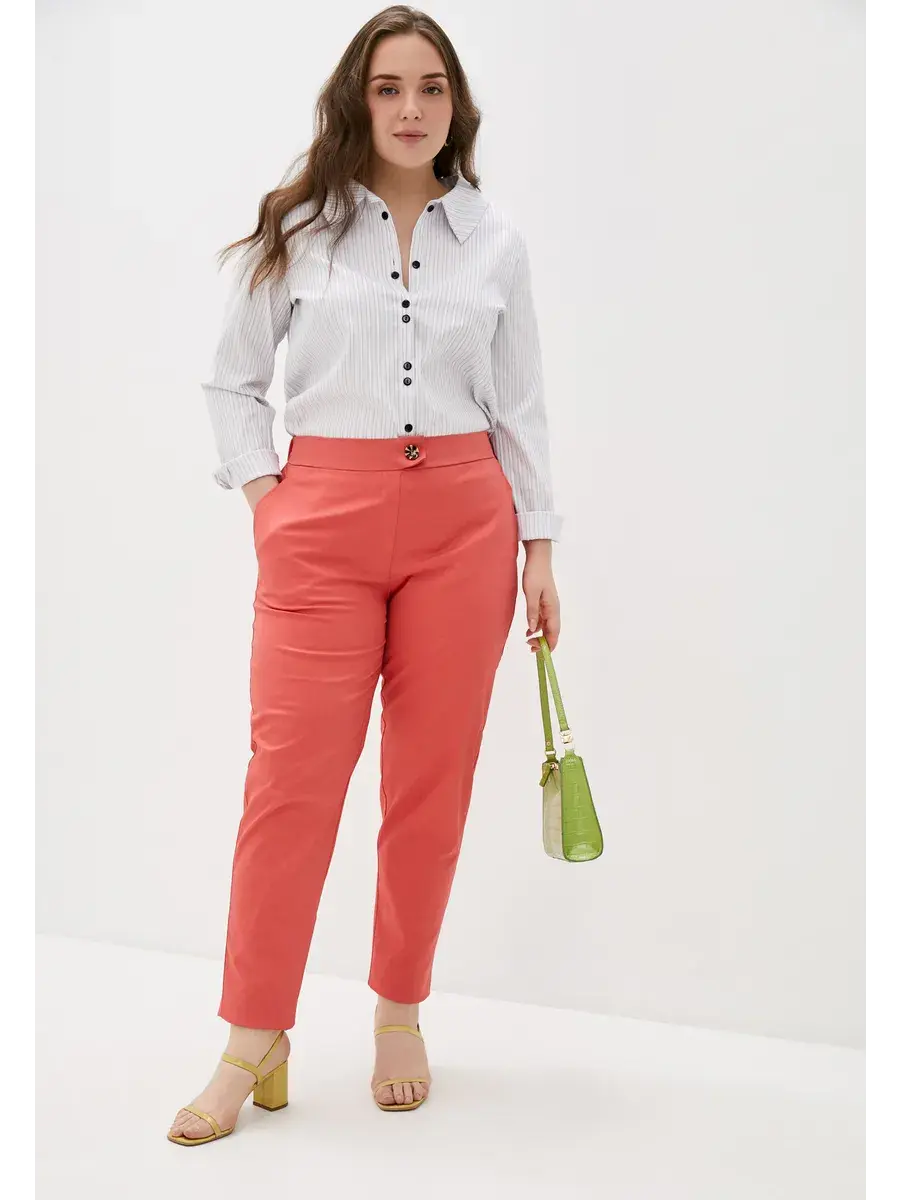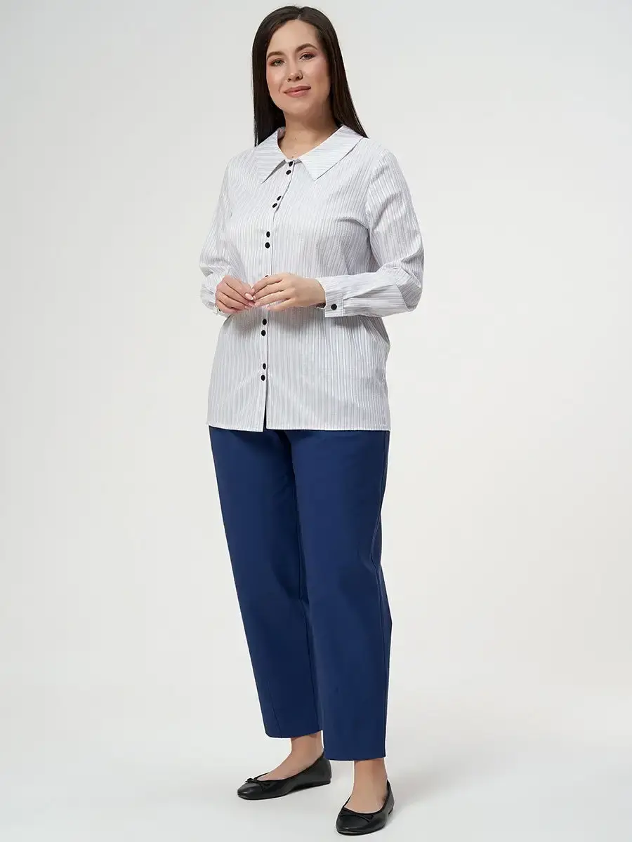 Блузка прямого силуэта свободной формы из ткани в полоску, фурнитура-пуговицы. Блузка с центральной бортовой застёжкой на 6 прорезных петель-пуговиц. Воротник стояче-отложной, отлёт воротника с острыми концами. Рукав втачной однородный, низ рукава оформлен манжетой с разрезом, на манжете одна прорезнаягоризонтальная петля и пуговица. Отделка: декоративные пуговицы на планке. Длина по спинке от 70 см в р.48 до 75,5 см в р.70