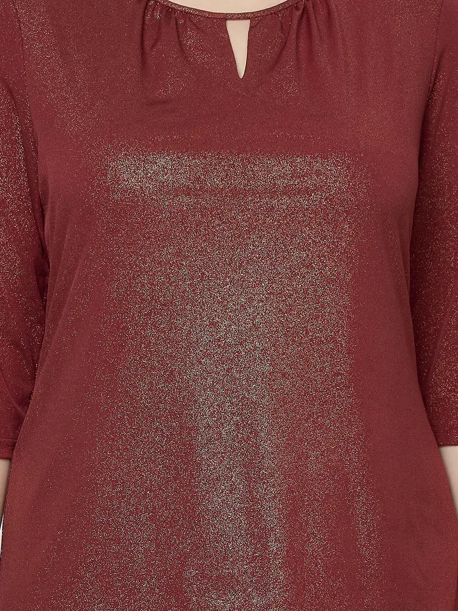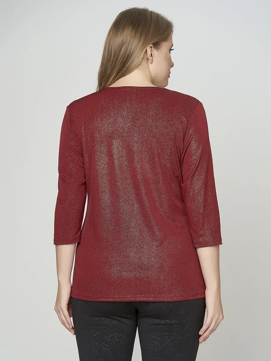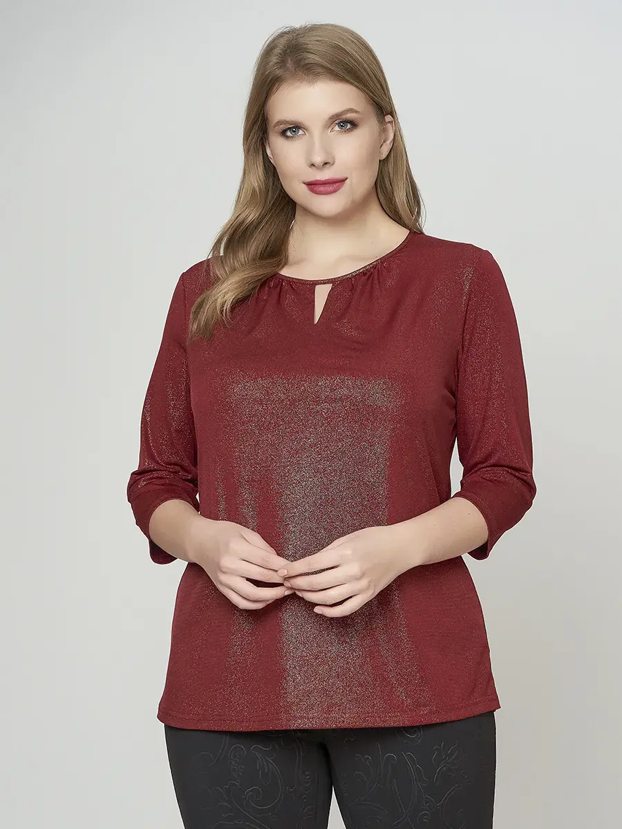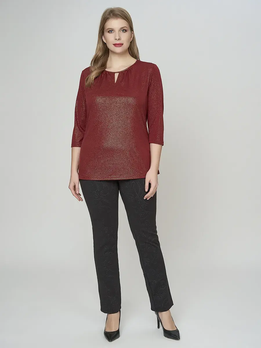 Нарядная блузка элегантного кроя, из блестящего мягкого трикотажа-масло с фойлом, с пикантной круглой горловиной «замочная скважина», придающей женщине сдержанную чувственность. Узкие рукава длиной 3/4 подчеркивают красоту рук, лаконичный прямой крой зрительно стройнит фигуру, рефлексы на ткани маскируют особенности фигуры и выгодно обрисовывают линию груди. Длина изделия по спинке от 66,5см в р.48 , длина рукава 46см.
