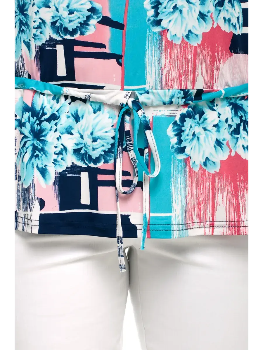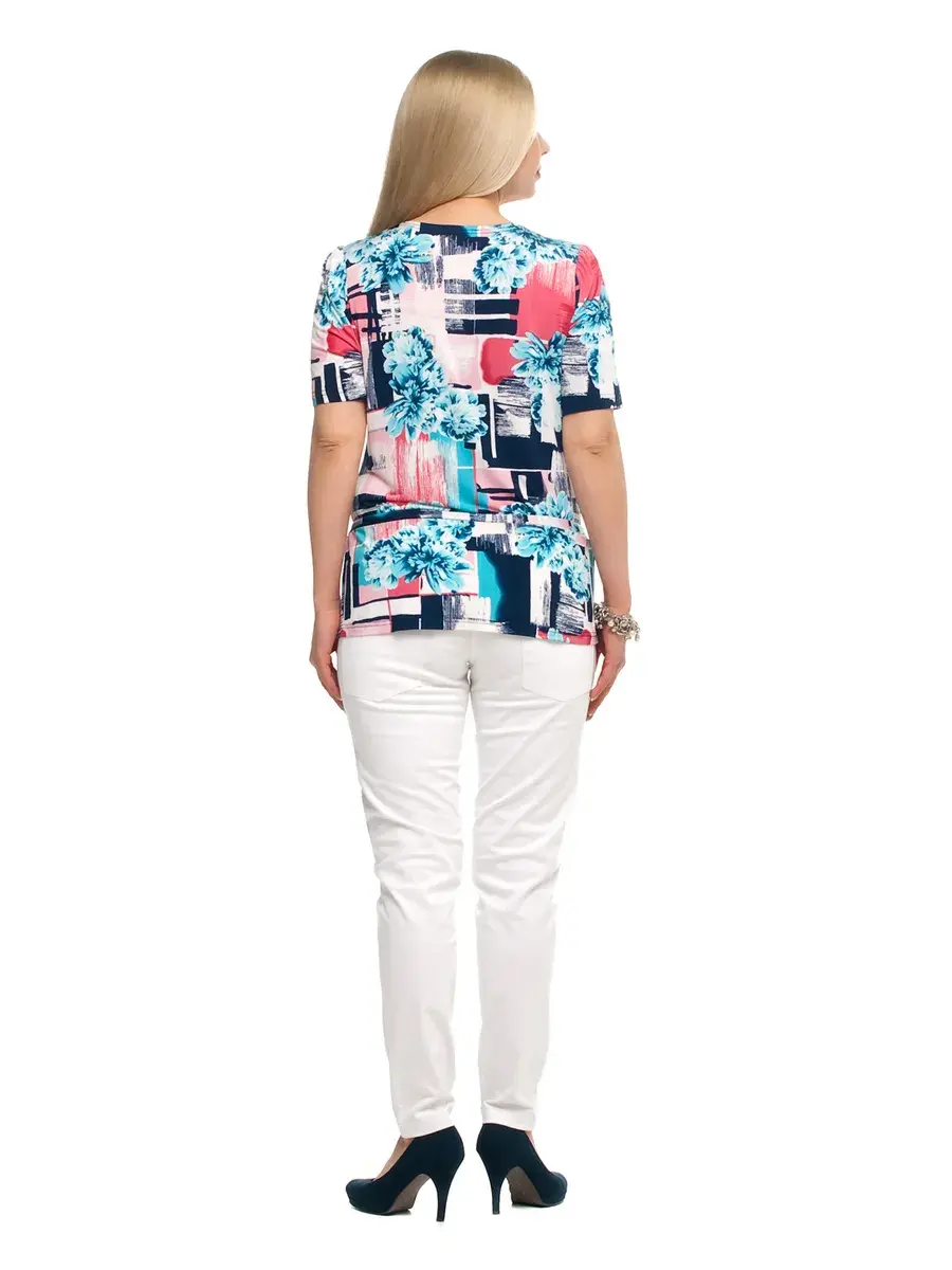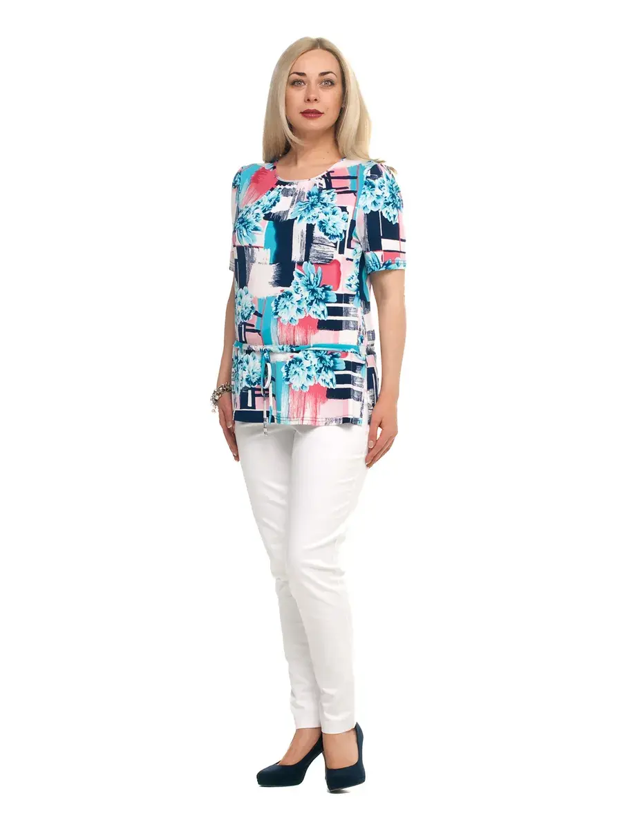 Стильная женская блузка из легкой ткани с абстрактным геометрическим принтом с крупными цветами. Модель прямого кроя; с круглым вырезом горловины; втачными рукавами до локтей. Низ изделия отрезной по бедрам с завязками на кулиске, и с разрезами по бокам. Туника мягко корректирует силуэт, нивелирует проблемные зоны, органично дополнит повседневный гардероб. Женщинам в ней будет комфортно на работе, на прогулке, на отдыхе.