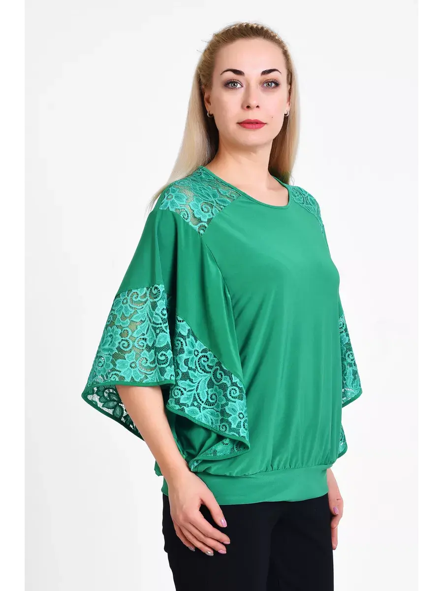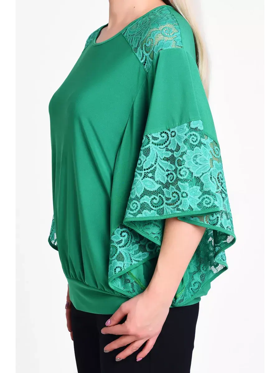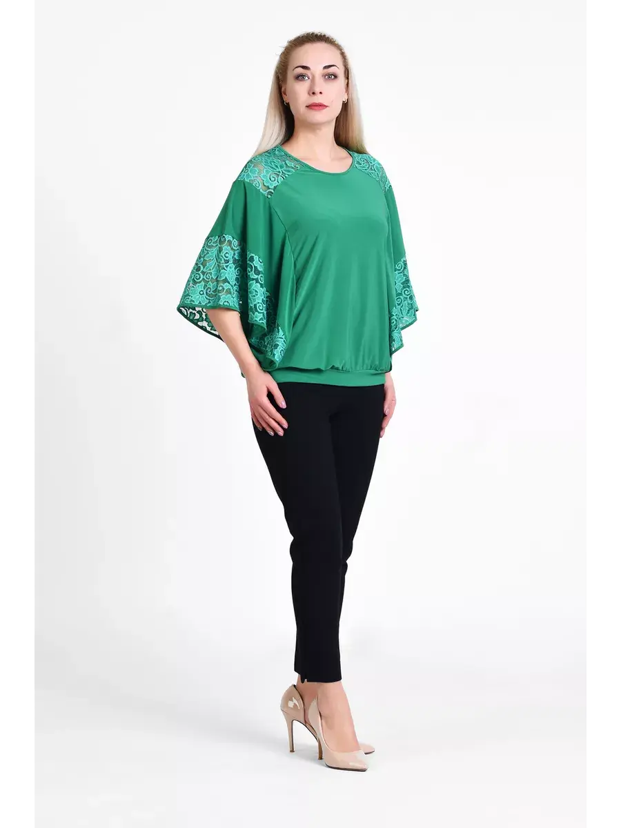 Нарядная блузка из ткани масло с нежным кружевом, рукав эффект летучей мыши. Нарядная блузка из «текучего» трикотажа масло с гипюровыми вставками на плечах и по низу широких рукавов - кимоно. Круговой пояс плотно фиксирует модель на бедрах, позволяя регулировать длину и пышность напуска. Крой изделия создает плавную линию от шеи до запястья, делает образ женственным и соблазнительным. Длина изделия по спинке от 69см в р.48 до 74,5см в р.70, длина рукава 37см.