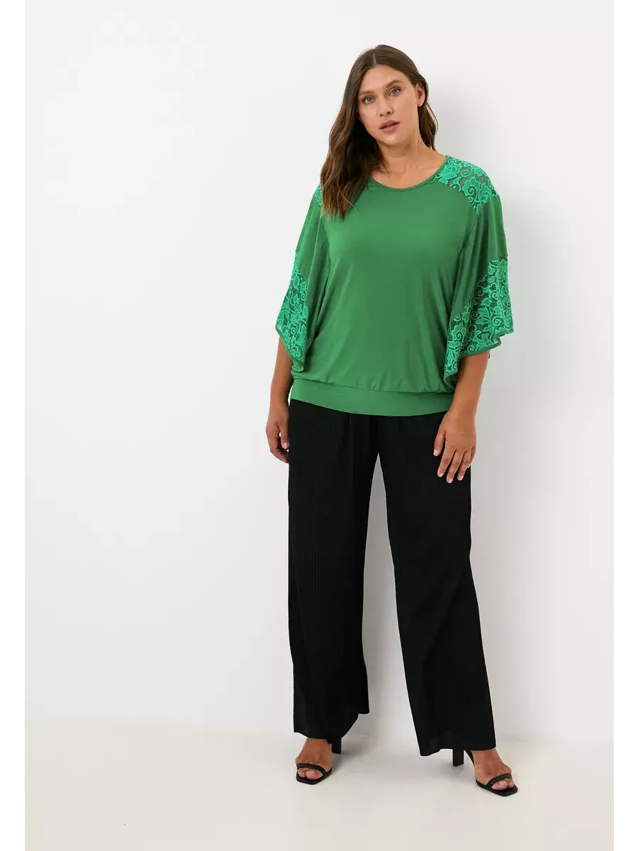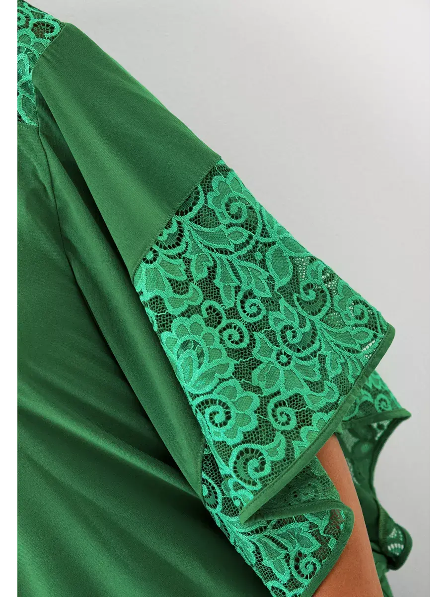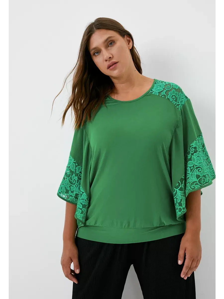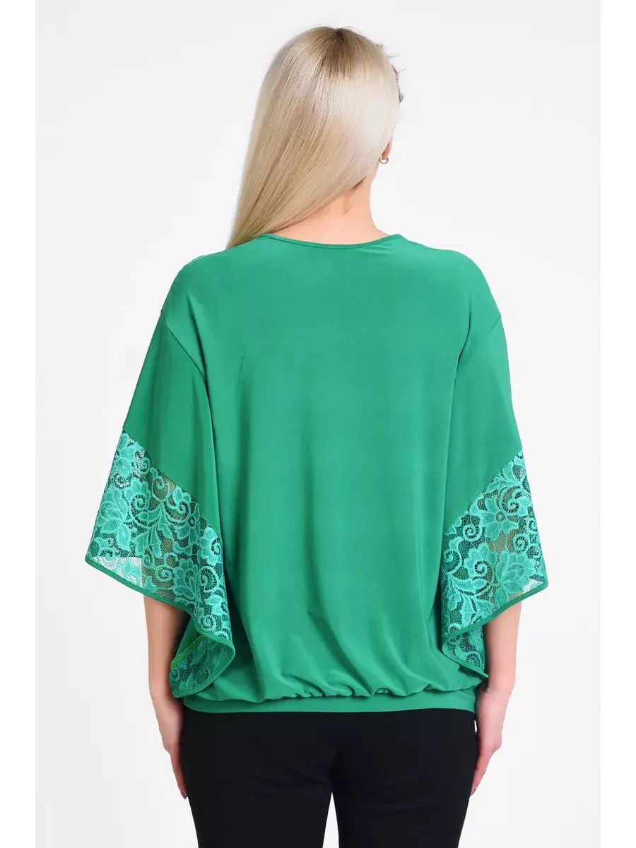 Нарядная блузка из ткани масло с нежным кружевом, рукав эффект летучей мыши. Нарядная блузка из «текучего» трикотажа масло с гипюровыми вставками на плечах и по низу широких рукавов - кимоно. Круговой пояс плотно фиксирует модель на бедрах, позволяя регулировать длину и пышность напуска. Крой изделия создает плавную линию от шеи до запястья, делает образ женственным и соблазнительным. Длина изделия по спинке от 69см в р.48 до 74,5см в р.70, длина рукава 37см.