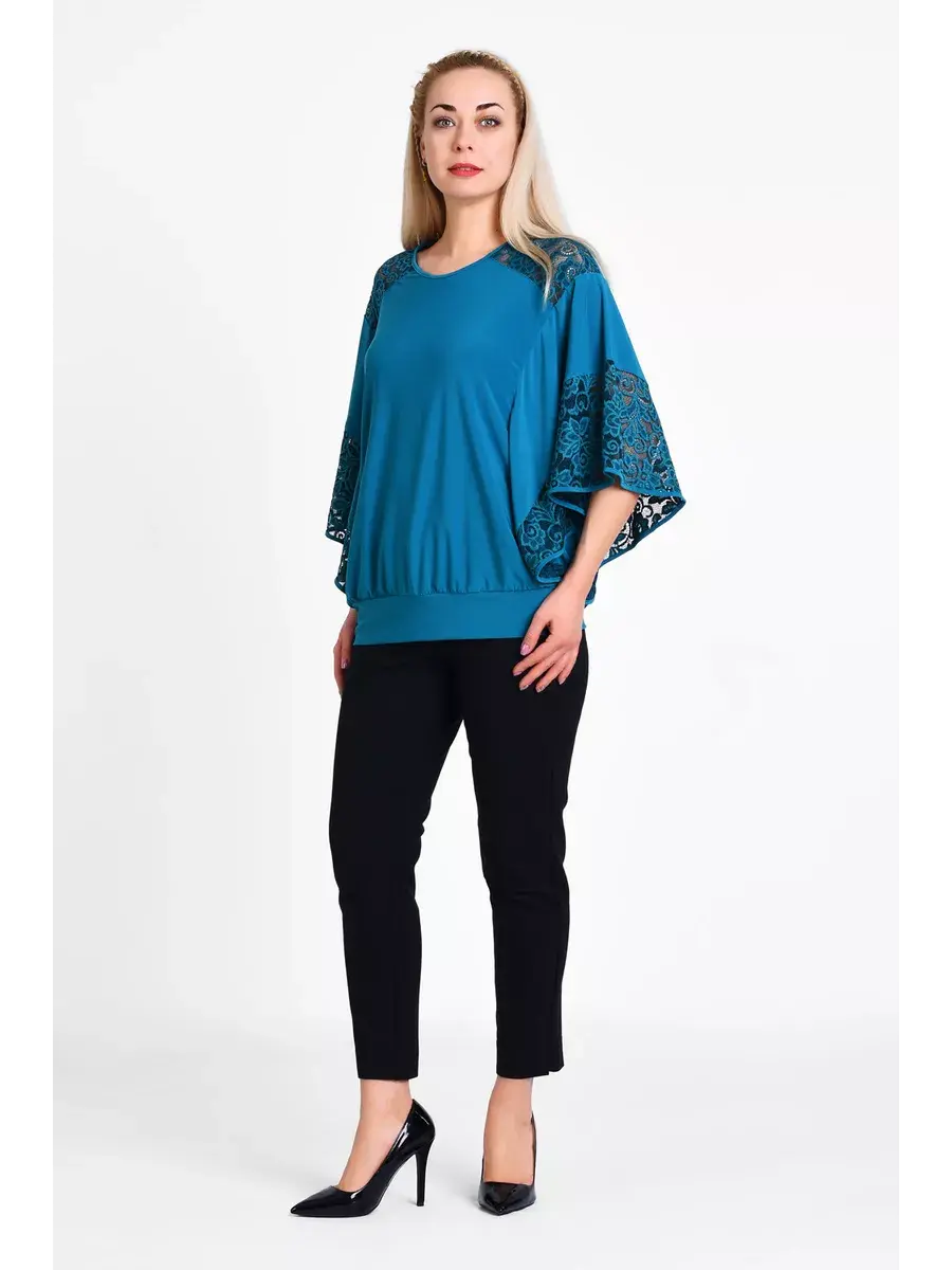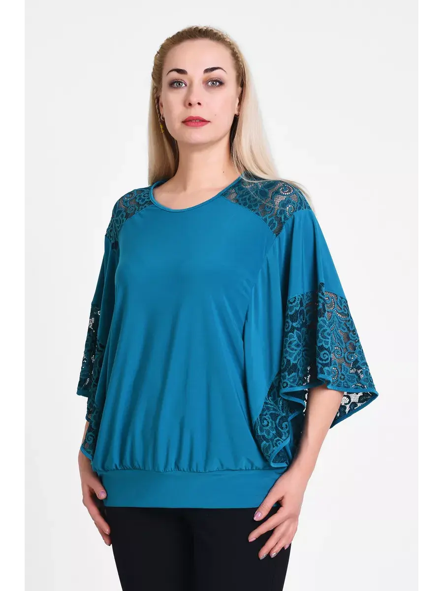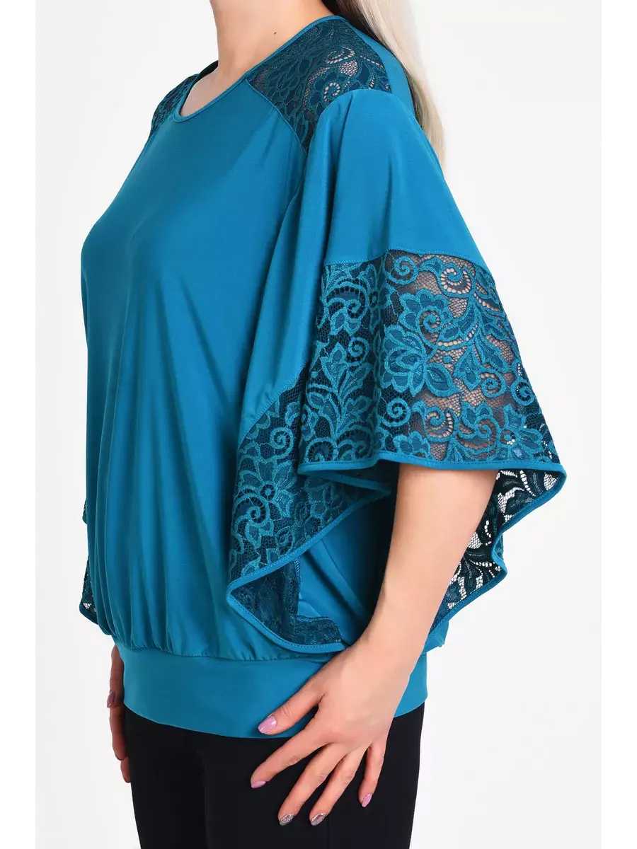Нарядная блузка из ткани масло с нежным кружевом, рукав эффект летучей мыши. Нарядная блузка из «текучего» трикотажа масло с гипюровыми вставками на плечах и по низу широких рукавов - кимоно. Круговой пояс плотно фиксирует модель на бедрах, позволяя регулировать длину и пышность напуска. Крой изделия создает плавную линию от шеи до запястья, делает образ женственным и соблазнительным. Длина изделия по спинке от 69см в р.48 до 74,5см в р.70, длина рукава 37см.
