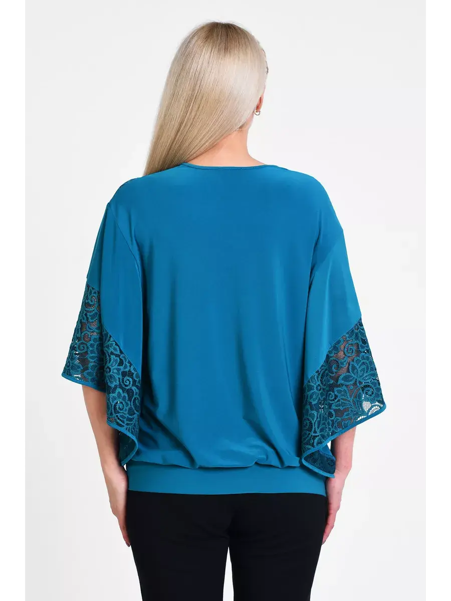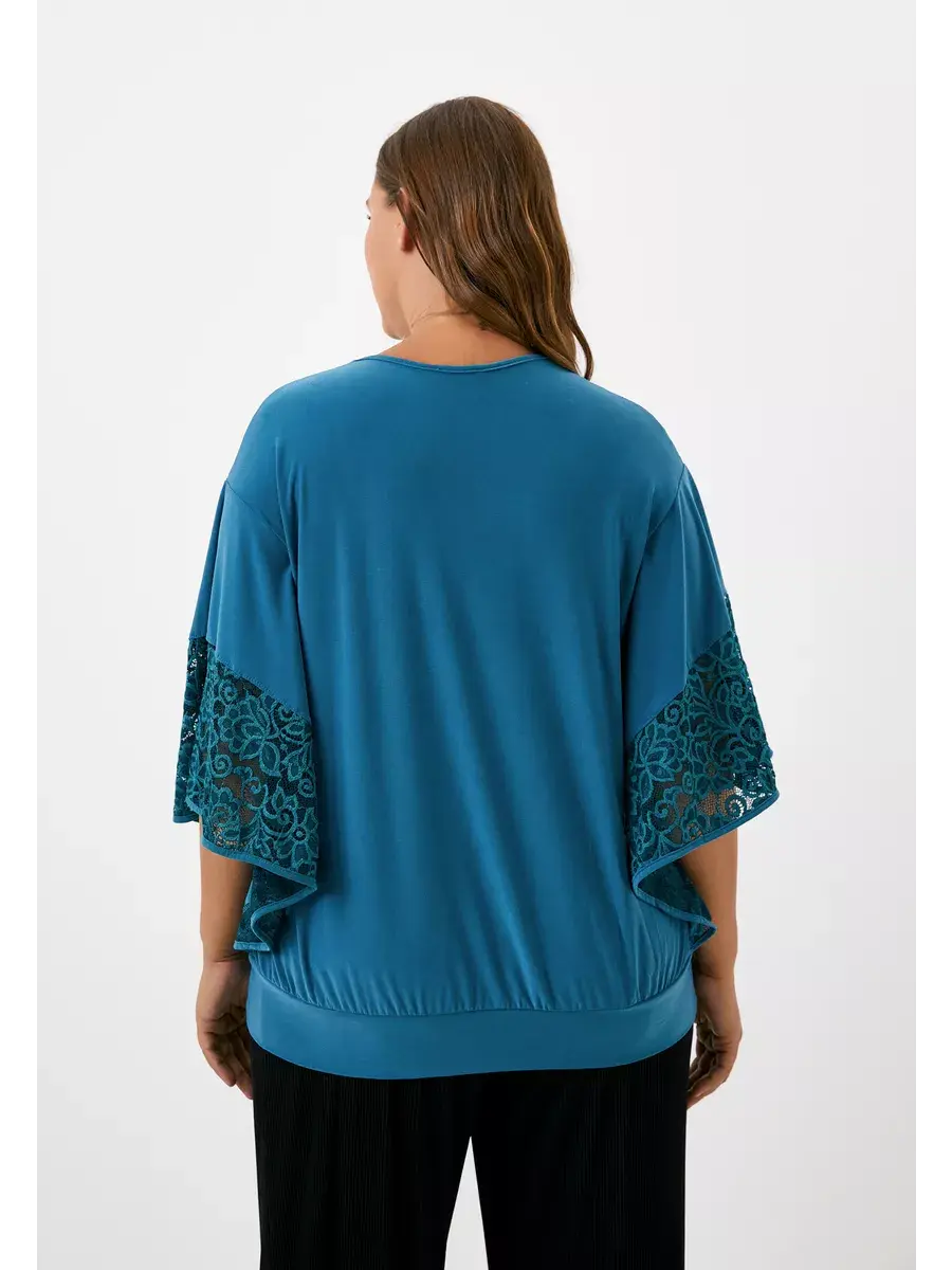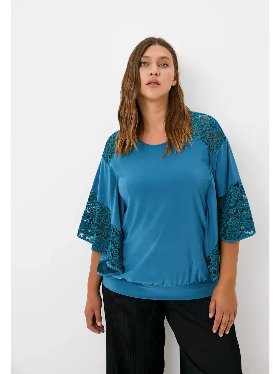 Нарядная блузка из ткани масло с нежным кружевом, рукав эффект летучей мыши. Нарядная блузка из «текучего» трикотажа масло с гипюровыми вставками на плечах и по низу широких рукавов - кимоно. Круговой пояс плотно фиксирует модель на бедрах, позволяя регулировать длину и пышность напуска. Крой изделия создает плавную линию от шеи до запястья, делает образ женственным и соблазнительным. Длина изделия по спинке от 69см в р.48 до 74,5см в р.70, длина рукава 37см.
